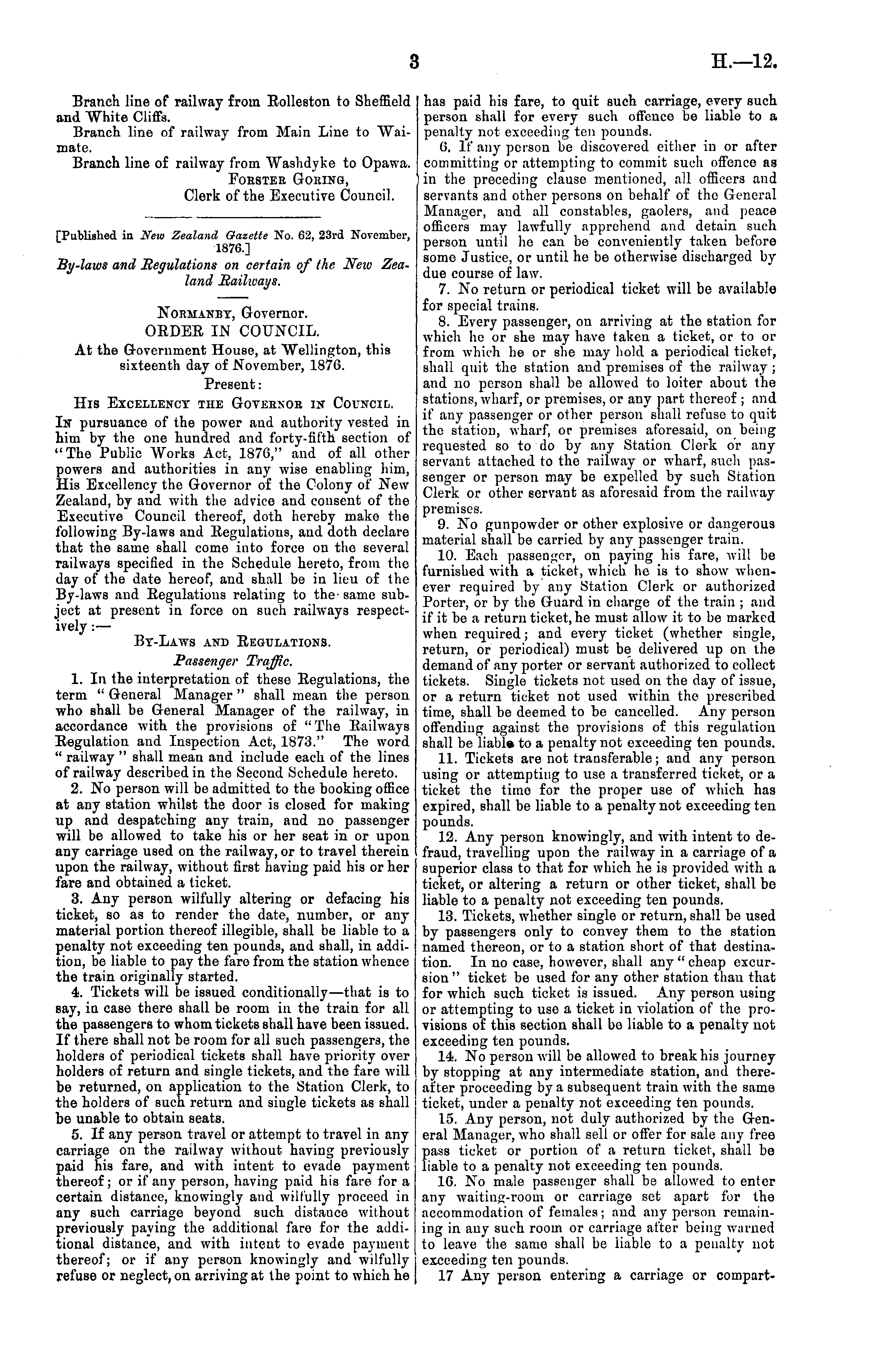 Branch line of railway from Rolleston to Sheffield has paid his fare, to quit such carriage, every such and White Cliffs. person shall for every such offence be liable to a Branch line of railway from Main Line to "Wai- penalty not exceeding ten pounds. mate. 0. If any person be discovered either in or after Branch line of railway from Washdyke to Opawa. committing or attempting to commit such offence as Fobster Goring, in the preceding clause mentioned, all officers and Clerk of the Executive Council. servants and other persons on behalf of the General ___^^ Manager, and all constables, gaolers, and peace i-t, 1,. ,■, • ~- r, 7 j „ u•» a<, oo jnt v officers may lawfully apprehend and detain such LPuMuhodin Ne,o &*!«»*GW. Ho. 6% SM November, pergon ho cau J be conveniently taken before By-law and Regulations on certain of the Neio Zea- s°me Justil^ ,or until ho be °th™e discharged by land Railwaus course or law. •* ' 7. No return or periodical ticket will be available £™™> Jf^™* f° 8 S Ever/passenger, on arriving at the station for UKUiiK IJN LUUjNULU whicli he or she may have taken a ticket, or to or At the Government House, at Wellington, this f rom which he or she may hold a periodical ticket, sixteenth day of November, 1876. shall quit the station and premises of the railway ; Present: and no person shall bo allowed to loiter about the His Excellency the Governor in Council. stations, wharf, or promises, or any part thereof ; and T j, ,i , ,i .. ■ i . if any passenger or other person shall refuse to quit In pursuance of the power and authority vested in ,■■ J. ,■ \ c • c • i i • ~ r, ~ -l j j i ? i. civi. j.- c the station, wharf, or premises aforesaid, on being nun by the one hundred and forty-nfth section of , , ' ■' •* 0,, ~ n] \ ° arri *a ir w i \ t io-^>> j c v <i requested so to do by any Station Clerk or any "The Public Works Act, 1876, and oi all other * , .. ■■ , . .■•• .f in , J , .!•,•• • Ti- i • servant attached to the railway or whart, such paspowers and authorities in any wise enabling him, v -\, , , ', c • Vr- t? 11 ,i n £i\ n i 5 v senger or person may be expelled by such Station His Excellency the Governor oi the Colony ot New ™ °-, ', J. ~ ' ■, V J ~ -, v , i , ', ~, ~ , . i ' . -~ Clerk or other servant as aforesaid iroin the railway Zealand, by and with the advice and consent ot the . • Executive Council thereof, doth hereby make the "r. -v a i ■ i .. ~ ■ Ti , iij i j.- 477 i 9. No gunpowder or other explosive or dangerous lollowiug By-laws and Regu ations, and doth declare ~ , ? ~', • -, , r t ■ ~ ~, D •> , ~ ■ i £ ii i material shall bo carried by any passenger tram, that the same shall come into force on the several irv -~ , J •■ •, •° £ -n i ■, - c , . ,i o• i i , c ,i 10. Each passenger, on paying his fare, will be railways specified in the schedule hereto, from the <. • , , ■}-, .■■, i• i i ■ -v i (,i j i t. c j v. ii u• t c,, furnished with a ticket, which ho is to show whenday ot the date hereof, and shall be in lieu oi the • i -v ' Lj. 4 - mi n. • j IJ -', j -r, ~. ' ~. ~ , ever required by any btation Clerk or authorized By-laws and Regulations relating to the- same sub- port 1 b qJ^ - n d of train ftnd ject at^present in force on such railways respect- if it be ' a re / uru ticket> he muat a fc llow it to be m ; rkcd IVe '" -n^ t t>^ when required; and every ticket (whether single, Bt-Laws and Regulations. H, je&totf) mus t be delivered up on Uie Passenger Traffic. demand of any porter or servant authorized to collect 1. In the interpretation of these Regulations, the tickets. Single tickets not used on the day of issue, term " General Manager " shall mean the person or a return ticket not used within the prescribed who shall be General Manager of the railway, in time, shall be deemed to be cancelled. Any person accordance with the provisions of "The Railways offending against the provisions of this regulation Regulation and Inspection Act, 1873." The word shall be liable to a penalty not exceeding ten pounds. " railway " shall mean and include each of the lines 11. Tickets are not transferable; and any person of railway described in the Second Schedule hereto. using or attempting to use a transferred ticket, or a 2. No person will be admitted to the booking office ticket the time for the proper use of which has at any station whilst the door is closed for making expired, shall be liable to a penalty not exceeding ten up and despatching any train, and no passenger pounds. will be allowed to take his or her seat in or upon 12. Any person knowingly, and with intent to deany carriage used on the railway, or to travel therein fraud, travelling upon the railway in a carriage of a upon the railway, without first having paid his or her superior class to that for which he is provided with a fare and obtained a ticket. ticket, or altering a return or other ticket, shall be 3. Any person wilfully altering or defacing his liable to a penalty not exceeding ten pounds, ticket, so as to render the date, number, or any 13. Tickets, whether single or return, shall be used material portion thereof illegible, shall be liable to a by passengers only to convey them to the station penalty not exceeding ten pounds, and shall, in addi- named thereon, or to a station short of that destination, be liable to pay the faro from the station whence tion. In no case, however, shall any " cheap excurthe train originally started. sion " ticket be used for any other station than that 4. Tickets will be issued conditionally —that is to for which such ticket is issued. Any person using say, in ease there shall be room in the train for all or attempting to use a ticket in violation of the prothe passengers to whom tickets shall have been issued, visions of this section shall be liable to a penalty not If there shall not be room for all such passengers, the exceeding ten 