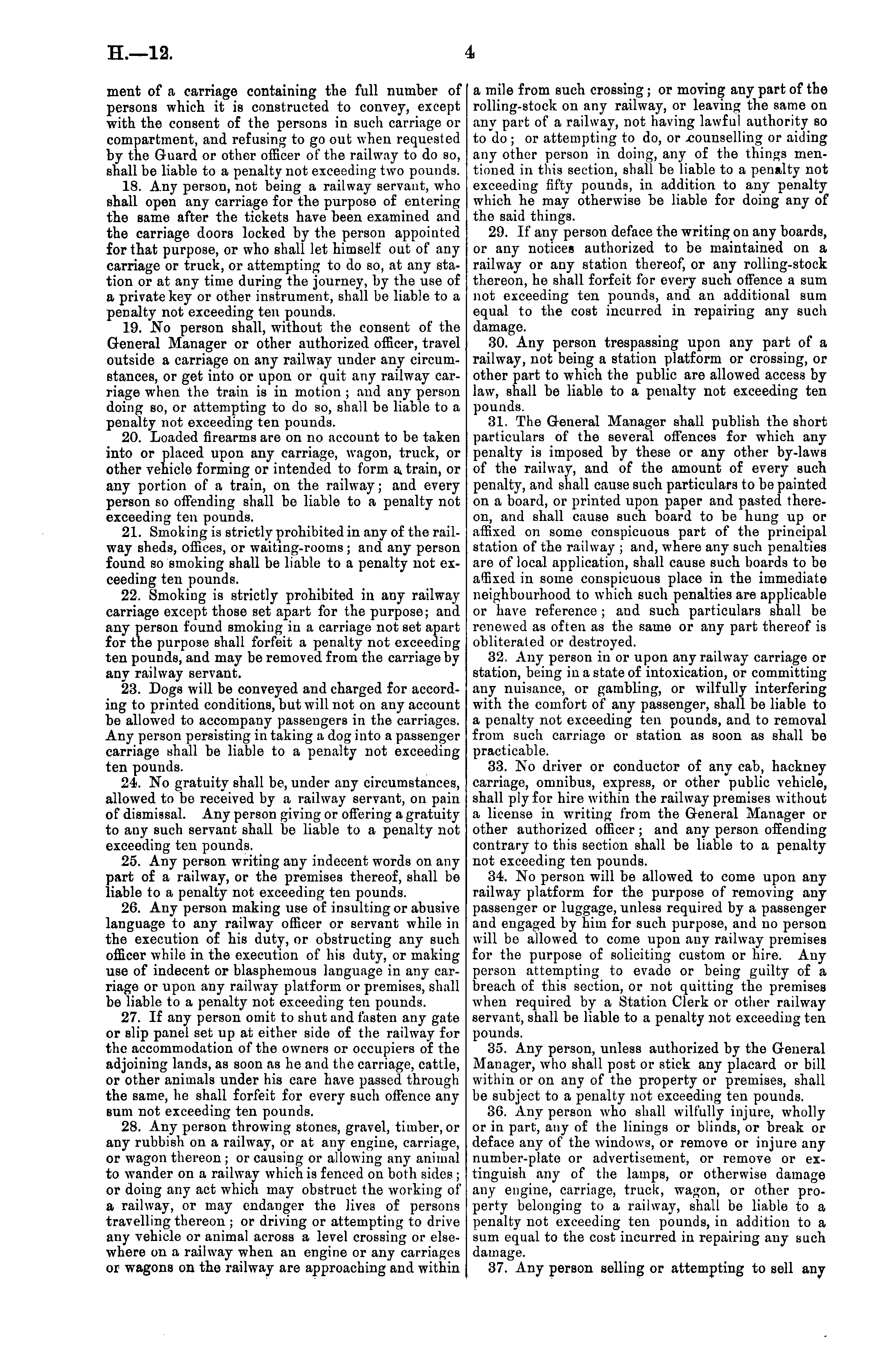 ment of a carriage containing the full number of a mile from such crossing; or moving any part of the persons which it is constructed to convey, except rolling-stock on any railway, or leaving the same on with the consent of the persons in such carriage or any part of a railway, not having lawful authority so compartment, and refusing to go out when requested to do ; or attempting to do, or -counselling or aiding by the Guard or other officer of the railway to do so, any other person in doing, any of the things menshall be liable to a penalty not exceeding two pounds, tioned in this section, shall be liable to a penalty not 18. Any person, not being a railway servant, who exceeding fifty pounds, in addition to any penalty shall open any carriage for the purpose of entering which he may otherwise be liable for doing any of the same after the tickets have been examined and the said things. the carriage doors locked by the person appointed 29. If any person deface the writing on any boards, for that purpose, or who shall let himself out of any or any notices authorized to be maintained on a carriage or truck, or attempting to do so, at any sta- railway or any station thereof, or any rolling-stock tion or at any time during the journey, by the use of thereon, he shall forfeit for every such offence a sum a private key or other instrument, shall be liable to a not exceeding ten pounds, and an additional sum penalty not exceeding ten pounds. equal to the cost incurred in repairing any such 19. No person shall, without the consent of the damage. General Manager or other authorized officer, travel 30. Any person trespassing upon any part of a outside a carriage on any railway under any circum- railway, not being a station platform or crossing, or stances, or get into or upon or quit any railway car- other part to which the public are allowed access by riage when the train is in motion ; and any person law, shall be liable to a penalty not exceeding ten doing so, or attempting to do so, shall be liable to a pounds, penalty not exceeding ten pounds. 31. The General Manager shall publish the short 20. Loaded firearms are on no account to be taken particulars of the several offences for which any into or placed upon any carriage, wagon, truck, or penalty is imposed by these or any other by-laws other vehicle forming or intended to form a. train, or of the railway, and of the amount of every such any portion of a train, on the railway; and every penalty, and shall cause such particulars to be painted person so offending shall be liable to a penalty not on a board, or printed upon paper and pasted thereexceeding ten pounds. on, and shall cause such board to be hung up or 21. Smoking is strictly prohibited in any of the rail- affixed on some conspicuous part of the principal way sheds, offices, or waiting-rooms ; and any person station of the railway ; and, where any such penalties found so smoking shall be liable to a penalty not ex- are of local application, shall cause such boards to bo ceeding ten pounds. a'fixed in some conspicuous place in the immediate 22. Smoking is strictly prohibited in any railway neighbourhood to which such penalties are applicable carriage except those set apart for the purpose; and or have reference; and such particulars shall be any person found smoking in a carriage not set apart renewed as often as the same or any part thereof is for the purpose shall forfeit a penalty not exceeding obliterated or destroyed. ten pounds, and may be removed from the carriage by 32. Any person in or upon any railway carriage or any railway servant. station, being in a state of intoxication, or committing 23. Dogs will be conveyed and charged for accord- any nuisance, or gambling, or wilfully interfering ing to printed conditions, but will not on any account with the comfort of any passenger, shall be liable to be allowed to accompany passengers in the carriages, a penalty not exceeding ten pounds, and to removal Any person persisting in taking a dog into a passenger from such carriage or station as soon as shall be carriage shall be liable to a penalty not exceeding practicable. ten pounds. 33. No driver or conductor of any cab, hackney 24. No gratuity shall be, under any circumstances, carriage, omnibus, express, or other public vehicle, allowed to be received by a railway servant, on pain shall ply for hire within the railway premises without of dismissal. Any person giving or offering a gratuity a license iv writing from the General Manager or to any such servant shall be liable to a penalty not other authorized officer; and any person offending exceeding ten pounds. contrary to this section shall be liable to a penalty 25. Any person writing any indecent words on any not exceeding ten pounds. part of a railway, or the premises thereof, shall be 34. No person will be allowed to come upon any liable to a penalty not exceeding ten pounds. railway platform for the purpose of removing any 26. Any person making use of insulting or abusive passenger or luggage, unless required by a passenger language to any railway officer or servant while in and engaged by him for such purpose, and no person the execution of his duty, or obstructing any such will be allowed to come upon any railway premises officer while in the execution of his duty, or making for the purpose of soliciting custom or hire. Any use of indecent or blasphemous language in any car- person attempting to evade or being guilty of a riage or upon any railway platform or premises, shall breach of this section, or not quitting the premises be liable to a penalty not exceeding ten pounds. when required by a Station Clerk or other railway 27. If any person omit to shut and fasten any gate servant, shall be liable to a penalty not exceeding ten or slip panel set up at either side of the railway for pounds. the accommodation of the owners or occupiers of the 35. Any person, unless authorized by the General adjoining lands, as soon as he a