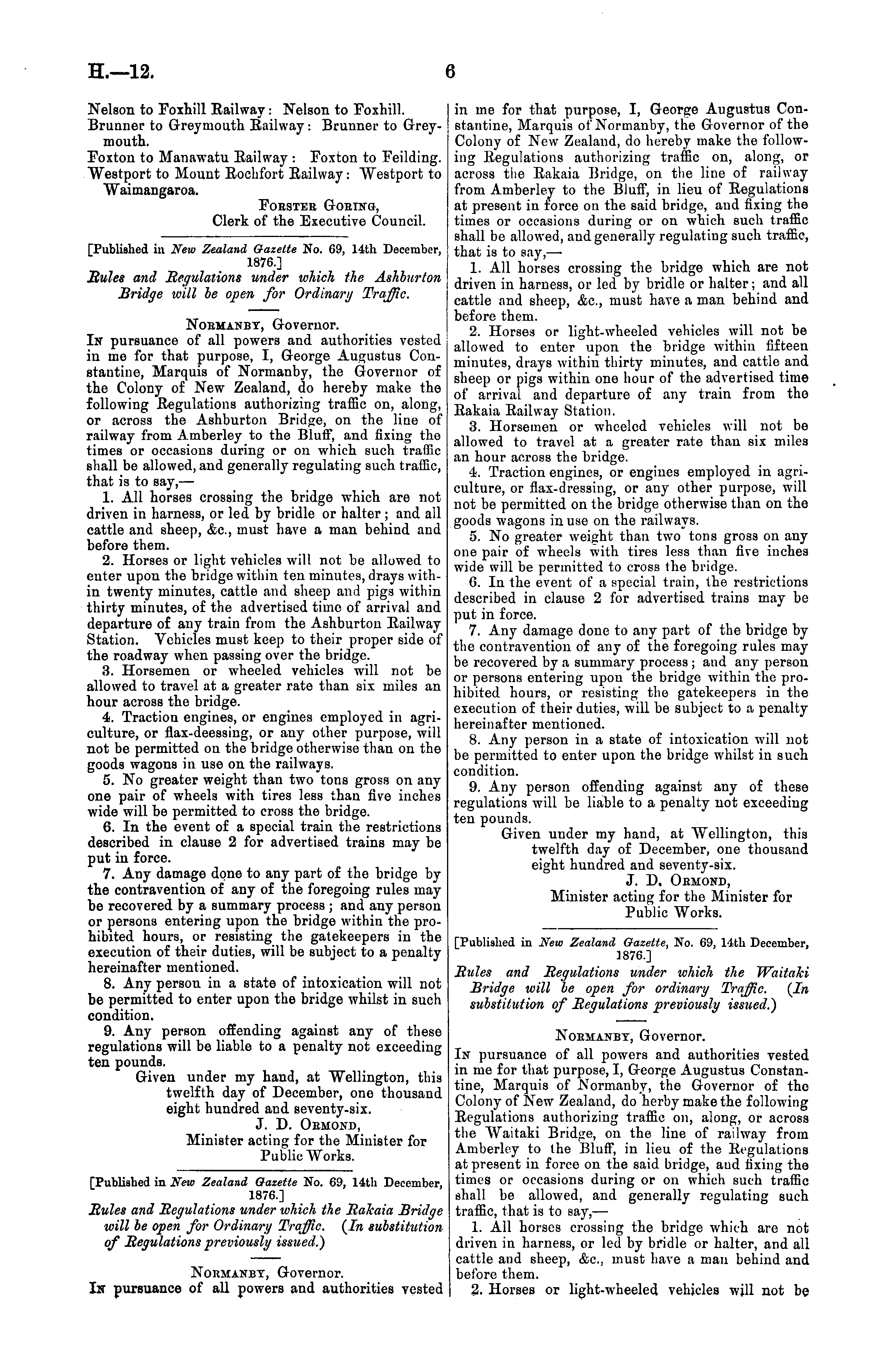 Nelson to Foxhill Bailway: Nelson to Foxhill. in me for that purpose, I, George Augustus ConBrunner to Greymouth Eailway : Bruuner to Grey- stantine, Marquis of Normanby, the Governor of the mouth. Colony of New Zealand, do hereby make the followFoxton to Manawatu Eailway: Foxton to Feilding. ing Eegulations authorizing traffic on, along, or Westport to Mount Eochfort Bailway: Westport to across the Eakaia Bridge, on the line of railway Waimangaroa. from Amberley to the Bluff, in lieu of Eegulations Forster Goring, at present in torce on the said bridge, and fixing the Clerk of the Executive Council. times or occasions during or on which such traffic shall be allowed, and generally regulating such traffic, [Published in New Zealand Gazette No. 69, 14th December, that is to say, _ , , -r. , . 1876.] }j Orgeg crossing the bridge which are not Rules and Regulation* under which the Ashburton driven in harness, or led by bridlo op halter; and all Bridge will be openjvr Ordinary Traffic. and sheep, Ac, must have a man behind and ~ „ before them. Nobmakby, Governor 2 Horgeg or ligtt . wheeled ve i, icleß win not be Ik pursuance of all powers and authorities vested allowed to cuter ° the bl . idge within fiftoen mmc for that purpose, I, George Augustus Con- miimt d withi| | thirty minutes, and cattle and stantme, Marquis of Normanby, he Governor of sh or j J within one ll0 J ul . of the advertised time the Colony of New Zealand, do hereby make the of ° and d turo of an train from tho following Eegulations authorizing traffic on along Bftkaia Bailway Station. or across the Ashburton Bridge on the line of 3 Horßemen or wheeled ve hi c les w iH not be railway from Amberley.to the Bluft and fixing the allowed to travel at a tcr pate thftn gix miles times or occasions during or on which such traffic hour aorogg the bpid fa shall be allowed, and generally regulating such traffic, Traction engineß> or engines employed in agri- , ,to sav > . culture, or flax-dressing, or any other purpose, will L All horses crossing the bridge which are not not be permitted on the bridge otherwise than on the driven in harness, or led by bridle or halter ; arid all ds w Jn use on the cattle and sheep, &c, must have a man behind and gNo jj^^ weight thau twc /tons gross on any before them, one pair of wheels with tires less than five inches 2. Horses or light vehicles will not be allowed to wid / wiU be peniiit ted to cross the bridge. enter upon the bridge within ten minutes, drays with- Gln the of a ial tm{ ih % restrictions in twenty minutes cattle and sheep and pigs within described in clause 2 f( J r adver tised trains may be thirty minutes, or the advertised time 01 arrival and , • f „- departure of any train from the Ashburton Eailway 7 Any damage done to any part of the bridge by Station Vehicles must keep to their proper side of the cont ; aventi ° n of an of i h l e f oregoing ru les may the roadway when passing over the bridge be recovered b a summary procegs . s aud ° auy perßon 3. Horsemen or wheeled vehicles will not be or persO ns entering upon the bridge within the proallowed to travel at a greater rate than six miles an y^ hour or \J sti the gatekeepers in the hour across the bridge. _ execution of their duties, will be subject to a penalty 4 Traction engines, or engines employed in agri- hereinaftep men tioned. culture, or flax-deessnig or any other purpose, will g _ A Q{q a gtate rf intoxicatlon will uot not be permitted on the bridge otherwise than on the be f tted to enter the brid whilst in BUch goods wagons m use on the railways. condition. 5. ISo greater weight than two tons gross on any 9 A offending against any of these one pair of wheels with tires ess than five inches regu i atit f ns \ vi n be liible t o a penalty not exceeding wide will be permitted to cross the bridge. t n no nds 6. In the event of a special train the restrictions Giyen miQF hand afc m]li to th ; s described in clause 2 for advertised trams may be t^ e]fth day ' o£ Decemberi O ne thousand P u _ lA'i'1 A 'i' i j. i.£iii-i i eiofht hundred and seventy-six. 7. Any damage done to any part 01 the bridge by ° t j) Oemond the contravention of any of the foregoing rules may Minister act j the Ml ' nister for be recovered by a summary process ; and any person Public Works or persons entering upon the bridge within the prohibited hours or resisting the gatekeepers in the [Published in New Zealand OazMe> No . 69> 14th DeC e m ber, execution 01 their duties, will be subject to a penalty 1876.] hereinafter mentioned. _ _ _ BuJes and Eegulatims under which the Waitahi 8. Any person in a state of intoxication will not Bridge wiU l e open f or orc u nan j Traffic. (In be permitted to enter upon the bridge whilst m such substitution of Regulations previously issued.) condition. J * r J ' 9. Any person offending against any of these Noemanbt, Governor, ten^ounds W1" *" ' CXCeeding Is pursuance of all powers and authorities vested Given under my hand, at Wellington, this |n me for that purpose, I, George Augustus Constantwelfth day of December, one thousand £ nf' MaJ^ lS "f *°™"b?" *he governor of the eight hundred and seventy-six. Colony of New Zealand, do herby make the following J D Oemovd Eegulations authorizing traffic on, along, or across Minister acting for the Minister for the Waitaki Bridge on the line of railway from Public Works Amberley to the Bluff, m lieu 01 the Eegulations ' at present in force on the said bridge, and fixing the [Published in New Zealand Gazette No. 69, 14th December, times or occasions during or on which such traffic 1876.] shall be allowed, and generally regulating such Rules and Regulations under which the RaJcaia Bridge traffic, that is to say, — will be open for Ordinary Traffic. {In substitution 1. All horses crossing the bridge which are not of Regulations previously issued.) driven in harness, or led by bridle or halter, and all cattle and sheep, &c, must have a man behind and Norm