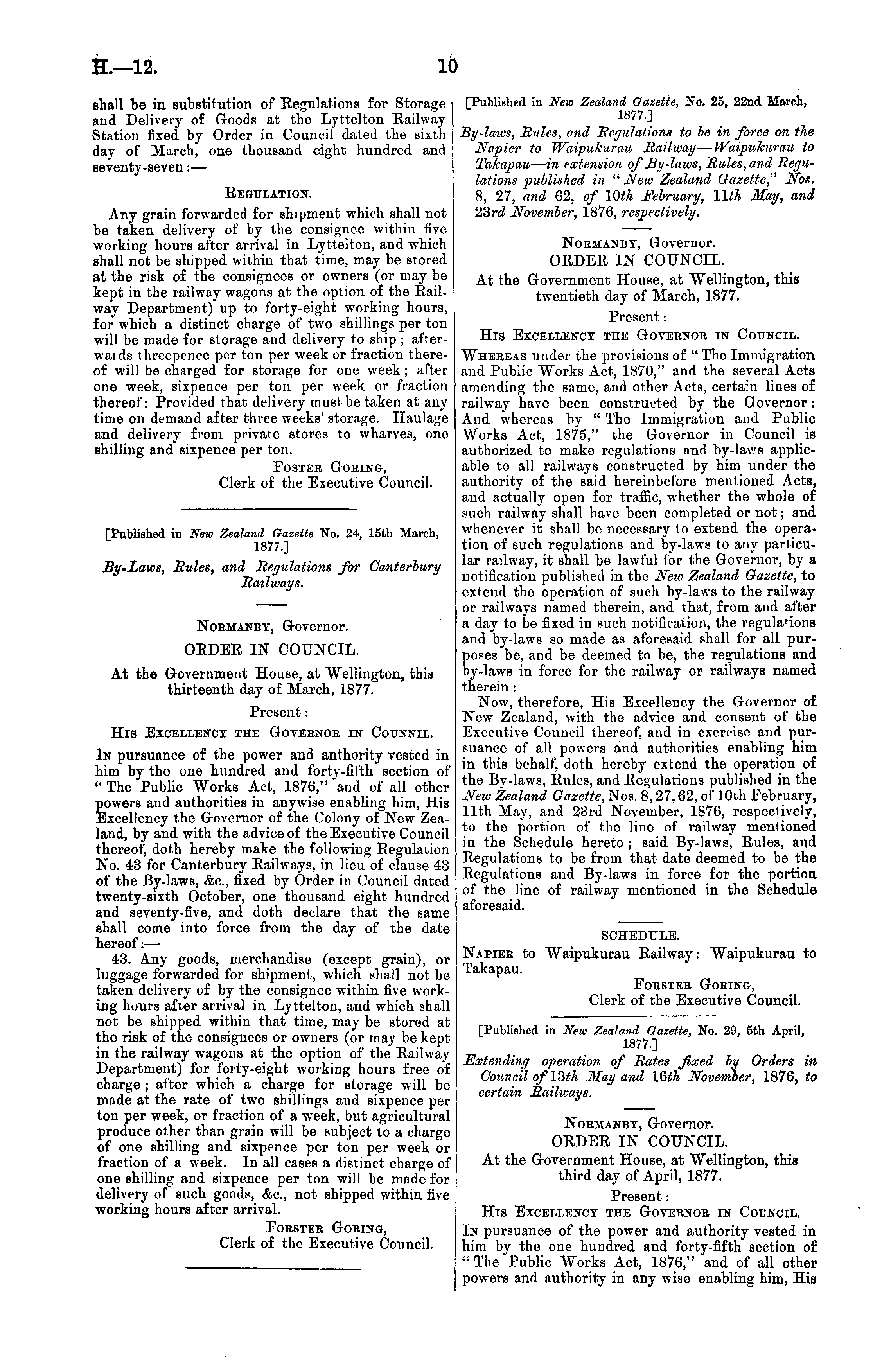 shall be in substitution of Regulations for Storage [Published in New Zealand Gazette, No. 25, 22nd March, and Delivery of Goods at the Lyttelton Eailway 18/7.J Station fixed by Order in Council dated the sixth By-laws, Mules, and Regulations to be in force on the day of March, one thousand eight hundred and Napier to Waipukurau Railway— Waipukurau to seventy-seven: Takapau — in extension of By-laws, Rules,and Regulations published in " New Zealand Gazette," Nos. Eegtoation. 8, 27, and 62, of 10th February, Uih May, and Any grain forwarded for shipment which shall not 23rd November, 1876, respectively. be taken delivery of by the consignee within five working hours after arrival in Lyttelton, and which Noemanby, Governor, shall not be shipped within that time, may be stored OEDEE IN COUNCIL. at the risk of the consignees or owners (or may be At tne Government House, at Wellington, this kept in the railway wagons at the option of the Eail- twentieth day of March, 1877. way Department) up to forty-eight working hours, _ for which a distinct charge of two shillings per ton rresen . will be made for storage and delivery to ship; after- His Excellency the Governor in Council. wards threepence per ton per week or fraction there- "Whereas under the provisions of " The Immigration of will be charged for storage for one week; after and Public "Works Act, 1870," and the several Acts one week, sixpence per ton per week or fraction amending the same, and other Acts, certain lines of thereof: Provided that delivery must be taken at any railway have been constructed by the Governor: time on demand after three weeks' storage. Haulage And whereas by " The Immigration and Public and delivery from private stores to wharves, one "Works Act, 1875," the Governor in Council is shilling and sixpence per ton. authorized to make regulations and by-laws applicFostku Goeing, able to all railways constructed by him under the Clerk of the Executive Council. authority of the said hereinbefore mentioned Acts, and actually open for traffic, whether the whole of such railway shall have been completed or not; and [Published in New Zealand Gazette No. 24, 15th March, whenever it shall be necessary to extend the opera--1877.] tion of such regulations and by-laws to any particuBy.Laws, Rules, and Regulations for Canterbury lar railway, it shall be lawful for the Governor by a Railways notification published in the New Zealand Gazette, to ' extend the operation of such by-laws to the railway or railways named therein, and that, from and after Noemanbt Governor. a day *-o be fixed in such notification, the regula'ions T _~. _ and by-laws so made as aforesaid shall for all purOEDEE IN COUNCIL. p Oses ], e> an( j j, c deemed to be, the regulations and At the Government House, at "Wellington, this by-laws in force for the railway or railways named thirteenth day of March, 1877. therein : Now, therefore, His Excellency the Governor of Present: New Zealand, with the advice and consent of the His Excellency the Goyeenoe in Cotjnnil. Executive Council thereof, and in exercise and purIn pursuance of the power and authority vested in suan, ce °f *" P,°™ r! an^ authorities enabling him him by the one hundred and forty-fifth section of » this behalf doth hereby extend the operation of "The Public Works Act, 1876," and of all other *c ules> al^ lle^^T P^lf^t 6 powers and authorities in an vwise enabling him, His Jf" Z™land fif*' **<»■ 8 ' 2J' 62 '"lO th * ebrua7< Excellency the Governor of the Colony of New Zea- ?*.*»* f 23/ d +v N° I Vembe f r ' 18? 6 ' respectively land, by and with the advice of the Executive Council to c P°rt\ ol? °f th, e line of ra.lway mentioned thereof' doth hereby make the following Regulation £ thf Schedule hereto ; said By-laws, Eules, and No. 43 for Canterbury Eailways, in lieu of clause 43 Rations to be from that date deemed to be the of the By-laws, &c, fixed by Order in Council dated E;g« lat>°ns a»d By-laws in force for the portion twenty-sixth October, one thousand eight hundred °f the .J ne of rallway mentioned in the Schedule and seventy-five, and doth declare that the same atoresaldshall come into force from the day of the date ..„_.._ hereof btHMJUUi. 43. Any goods, merchandise (except grain), or *f APIBB t0 Waipukurau Eailway: Waipukurau to luggage forwarded for shipment, which shall not be -LaJiaPautaken delivery of by the consignee within five work- ±obsteb (toeing^ ing hours after arrival in Lyttelton, and which shall Clerk ot the Executive Council, not be shipped within that time, may be stored at „.„. , , „ _ , , _ .. _ „ ... . .. the risk of the consignees or owners (or may be kept tPubllßhed ln Ac» Zealand Gazette, No. 29, sth AprU, in the railway wagons at the option of the Eailway Extendi tim of Rates fixed h Orders in Department) tor forty-eight working hours tree of r, ■, /„,, ~ J , -, c ..-i > , r •! nO fro j i L ... ' ■>• x. J s. £ i ii -l Council of 13th May and lGth November, 1876, to charge ; after which a charge for storage will be certain Raihvavs made at the rate of two shillings and sixpence per " ton per week, or fraction of a week, but agricultural ■»- produce other than grain will be subject to a charge n^™' tt of one shilling and sixpence per ton per week or UKVhli IJN COUNCIL, fraction of a week. In all cases a distinct charge of At the Government House, at Wellington, this one shilling and sixpence per ton will be made for third day of April, 1877. delivery of such goods, &c, not shipped within five Present: working hours after arrival. His Excellency the Goyeenoe in Council. loestee Goeing, Ijf pursuance of the power and authority vested in Clerk of the Executive Council. him by the one hundred and forty-fifth section of " The Public Works Act, 1876," and of all other powers and authority in any wise enabling him, His