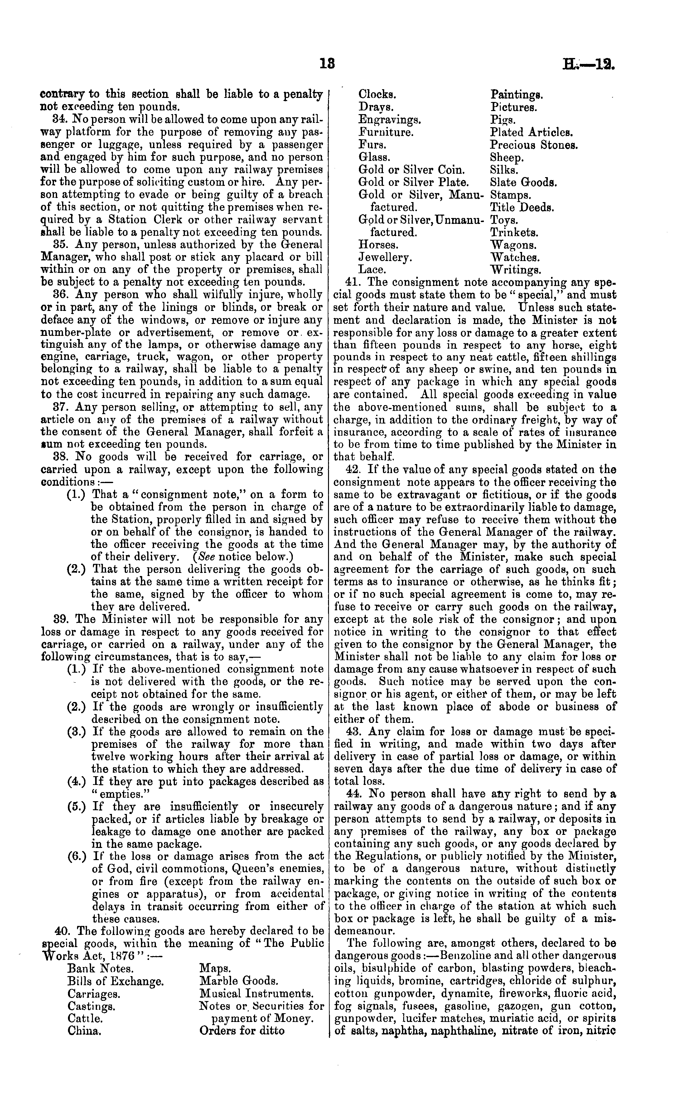 contrary to this section shall be liable to a penalty Clocks. Paintings, not exceeding ten pounds. Drays. Pictures. 34. No person will be allowed to come upon any rail- Engravings. Piy;s. way platform for the purpose of removing any pas- Furniture. Plated Articles. senger or luggage, unless required by a passenger Furs. Precious Stones. and engaged by him for such purpose, and no person Glass. Sheep. will be allowed to come upon any railway premises Gold or Silver Coin. Silks. for the purpose of soliciting custom or hire. Any per- Gold or Silver Plate. Slate Goods. son attempting to evade or being guilty of a breach Gold or Silver, Manu- Stamps. of this section, or not quitting the premises when re- factured. Title Deeds. quired by a Station Clerk or other railway servant Gold or Silver,Unmanu- Toys. shall be liable to a penalty not exceeding ten pounds. factured. Trinkets. 35. Any person, unless authorized by the General Horses. Wagons. Manager, who shall post or stick any placard or bill Jewellery. "Watches, within or on any of the property or premises, shall Lace. Writings. be subject to a penalty not exceeding ten pounds. 41. The consignment note accompanying any spe--36. Any person who shall wilfully injure, wholly cial goods must state them to be " special," and must or in part, any of the linings or blinds, or break or set forth their nature and value. Unless such statedeface any of the windows, or remove or injure any ment and declaration is made, the Minister is not number-plate or advertisement, or remove or ex- responsible for any loss or damage to a greater extent tinguish any of the lamps, or otherwise damage any than fifteen pounds in respect to any horse, eight engine, carriage, truck, wagon, or other property pounds in respect to any neat cattle, fifteen shillings belonging to a railway, shall be liable to a penalty in respect of any sheep or swine, and ten pounds in not exceeding ten pounds, in addition to a sum equal respect of any package in which any special goods to the cost incurred in repairing any such damage. are contained. All special goods exceeding in value 37. Any person selling, or attempting to sell, any the above-mentioned sums, shall be subject to a article on any of the premises of a railway without charge, in addition to the ordinary freight, by way of the consent of the General Manager, shall forfeit a insurance, according to a scale of rates of insurance sum not exceeding ten pounds. to be from time to time published by the Minister in 38. No goods will be received for carriage, or that behalf. carried upon a railway, except upon the following 42. If the value of any special goods stated on the conditions : — consignment note appears to the officer receiving the (1.) That a "consignment note," on a form to same to be extravagant or fictitious, or if the goods be obtained from the person in charge of are of a nature to be extraordinarily liable to damage, the Station, properly filled in and signed by such officer may refuse to receive them without the or on behalf of the consignor, is handed to instructions of the General Manager of the railway. the officer receiving the goods at the time And the General Manager may, by the authority of of their delivery. (See notice below.) and on behalf of the Minister, make such special (2.) That the person delivering the goods ob- agreement for the carriage of such goods, on such tains at the same time a written receipt for terms as to insurance or otherwise, as he thinks fit; the same, signed by the officer to whom or if no such special agreement is come to, may rethey are delivered. fuse to receive or carry such goods on the railway, 39. The Minister will not be responsible for any except at the sole risk of the consignor; and upon loss or damage in respect to any goods received for notice in writing to the consignor to that effect carriage, or carried on a railway, under any of the given to the consignor by the General Manager, the following circumstances, that is to say, — Minister shall not be liable to any claim for loss or (1.) If the above-mentioned consignment note damage from any cause whatsoever in respect of such is not delivered with the goods, or the re- goods. Such notice may be served upon the conceipt not obtained for the same. signor or his agent, or either of them, or may be left (2.) If the goods are wrongly or insufficiently at the last known place of abode or business of described on the consignment note. either of them. (3.) If the goods are allowed to remain on the 43. Any claim for loss or damage must be specipremises of the railway for more than fled in writing, and made within two days after twelve working hours after their arrival at delivery in case of partial loss or damage, or within the station to which they are addressed. seven days after the due time of delivery iv case of (4.) If they are put into packages described as total loss. " empties." 44. No person shall have any right to send by a (5.) If they are insufficiently or insecurely railway any goods of a dangerous nature ; and if any packed, or if articles liable by breakage or person attempts to send by a railway, or deposits in leakage to damage one another are packed any premises of the railway, any box or package in the same package. containing any such goods, or any goods declared by (6.) If the loss or damage arises from the act the Regulations, or publicly notified by the Minister, of God, civil commotions, Queen's enemies, to be of a dangerous nature, without distinctly or from fire (except from the railway en- marking the contents on the outside of such box or gines or apparatus), or from accidental package, or giving notice in writing of the contents delays in transit occurring from either of to the officer in charge of the station at which such these causes. box or package is left, he shall be guilty of a mis--40. The following goods are hereby declared to be demeanour. special goods, within the meaning of "The P