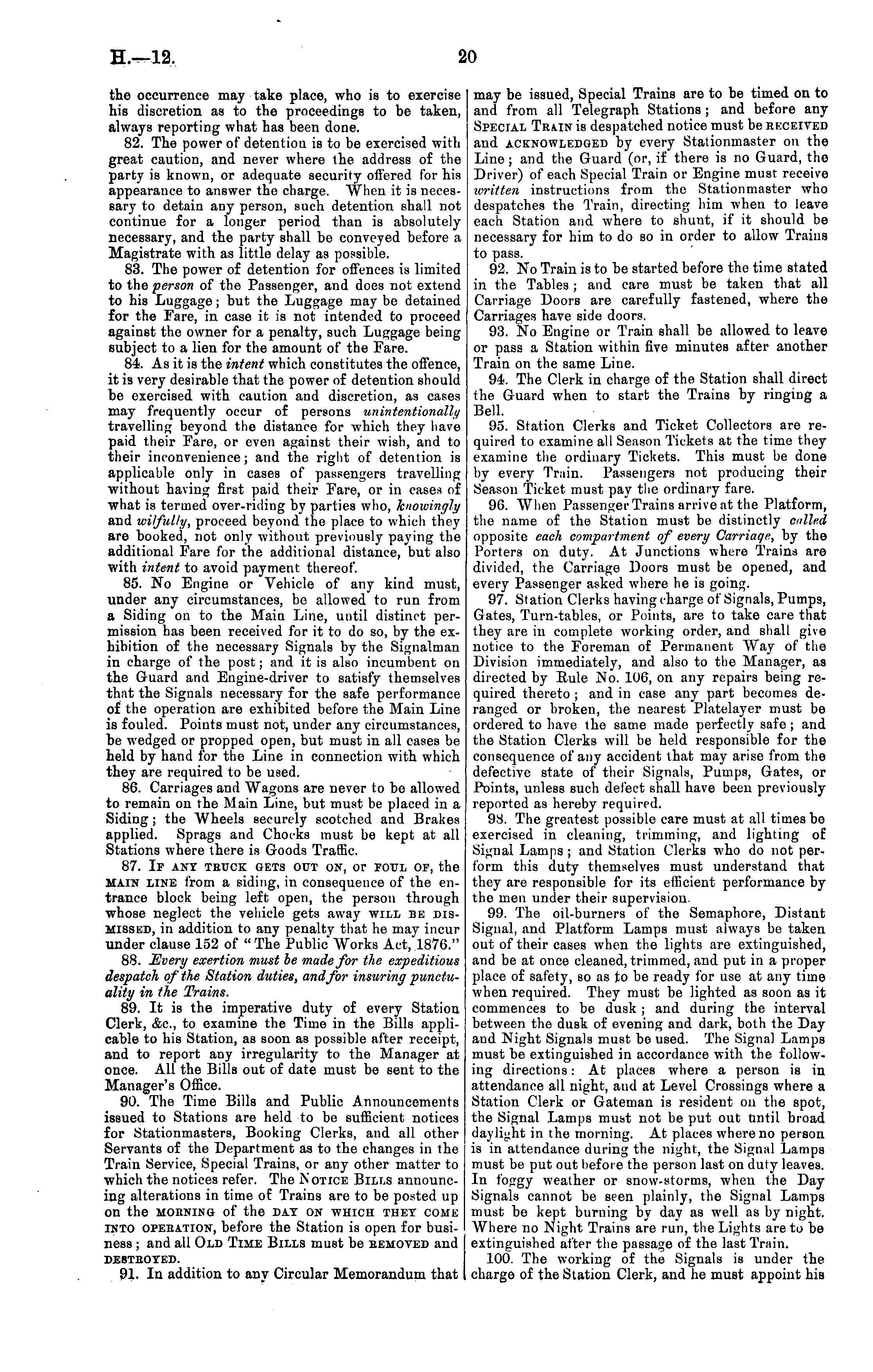 the occurrence may take place, who is to exercise may be issued, Special Trains are to be timed on to his discretion as to the proceedings to be taken, and from all Telegraph Stations ; and before any always reporting what has been done. Special Train is despatched notice must be received 82. The power of detention is to be exercised with and acknowledged by every Stationmaster on the great caution, and never where the address of the Line ; and the Guard (or, if there is no Guard, the party is known, or adequate securily offered for his Driver) of each Special Train or Engine must receive appearance to answer the charge. When it is neces- written instructions from the Stationmaster who sary to detain any person, such detention shall not despatches the Train, directing him when to leave continue for a longer period than is absolutely each. Station and where to shunt, if it should be necessary, and the party shall be conveyed before a necessary for him to do so in order to allow Trains Magistrate with as little delay aa possible. to pass. 83. The power of detention for offences is limited 92. No Train is to be started before the time stated to the person of the Passenger, and does not extend in the Tables ; and care must be taken that all to his Luggage; but the Luggage may be detained Carriage Doors are carefully fastened, where the for the Fare, in case it is not intended to proceed Carriages have side doors. against the owner for a penalty, such Luggage being 93. No Engine or Train shall be allowed to leave subject to a lien for the amount of the Fare. or pass a Station within five minutes after another 84 As it is the intent which constitutes the offence, Train on the same Line. it is very desirable that the power of detention should 94. The Clerk in charge of the Station shall direct be exercised with caution and discretion, as cases the Guard when to start the Trains by ringing a may frequently occur of persons unintentionally Bell. travelling beyond the distance for which they have 95. Station Clerks and Ticket Collectors are repaid their Fare, or even against their wish, and to quired to examine all Season Tickets at the time they their inconvenience; and the right of detention is examine the ordinary Tickets. This must be done applicable only in cases of passengers travelling by every Train. Passengers not producing their without having first paid their Fare, or in cases of Season Ticket must pay the ordinary fare, what is termed over-riding by parties who, knowingly 96. When Passenger Trains arrive at the Platform, and ivilfully, proceed beyond the place to which they the name of the Station must be distinctly called are booked, not only without previously paying the opposite each compartment of every Carriage, by the additional Fare for the additional distance, but also Porters on duty. At Junctions where Trains are with intent to avoid payment thereof. divided, the Carriage Doors must be opened, and 85. No Engine or Vehicle of any kind must, every Passenger asked where he is going. under any circumstances, be allowed to run from 97. Station Clerks having charge of Signals, Pumps, a Siding on to the Main Line, until distinct per- Gates, Turn-tables, or Points, are to take care that mission has been received for it to do so, by the ex- they are in complete working order, and shall give hibition of the necessary Signals by the Signalman notice to the Foreman of Permanent Way of the in charge of the post; and it is also incumbent on Division immediately, and also to the Manager, as the Guard and Engine-driver to satisfy themselves directed by Rule No. 10G, on any repairs being rethat the Signals necessary for the safe performance quired thereto ; and in case any part becomes deof the operation are exhibited before the Main Line ranged or broken, the nearest Platelayer must be is fouled. Points must not, under any circumstances, ordered to have the same made perfectly safe ; and be wedged or propped open, but must in all cases be the Station Clerks will be held responsible for the held by hand for the Line in connection with which consequence of any accident that may arise from the they are required to be used. defective state of their Signals, Pumps, Gates, or 86. Carriages and Wagons are never to be allowed Points, unless such defect shall have been previously to remain on the Main Line, but must be placed in a reported as hereby required. Siding; the Wheels securely scotched and Brakes 98. The greatest possible care must at all times bo applied. Sprags and Chocks must be kept at all exercised in cleaning, trimming, and lighting of Stations where there is Goods Traffic. Signal Lamps ; and Station Clerks who do not per--87. If any truck gets ottt on, or fotjl of, the form this duty themselves must understand that Main line from a siding, in consequence of the en- they are responsible for its efficient performance by trance block being left open, the person through the men under their supervision. whose neglect the vehicle gets away will be bis- 99. The oil-burners of the Semaphore, Distant missed, in addition to any penalty that he may incur Signal, and Platform Lamps must always be taken under clause 152 of "The Public Works Act, 1876." out of their cases when the lights are extinguished, 88. Every exertion must be made for the expeditious and be at once cleaned, trimmed, and put in a proper despatch of the Station duties, and for insuring punctu- place of safety, so as to be ready for use at any time ality in the Trains. when required. They must be lighted as soon as it 89. It is the imperative duty of every Station commences to be dusk ; and during the interval Clerk, &c, to examine the Time in the Bills appli- between the dusk of evening and dark, both the Day cable to his Station, as soon as possible after receipt, and Night Signals must be used. The Signal Lamps and to report any irregularity to the Manager at must be extinguished in accordance with the followonce. All the Bi