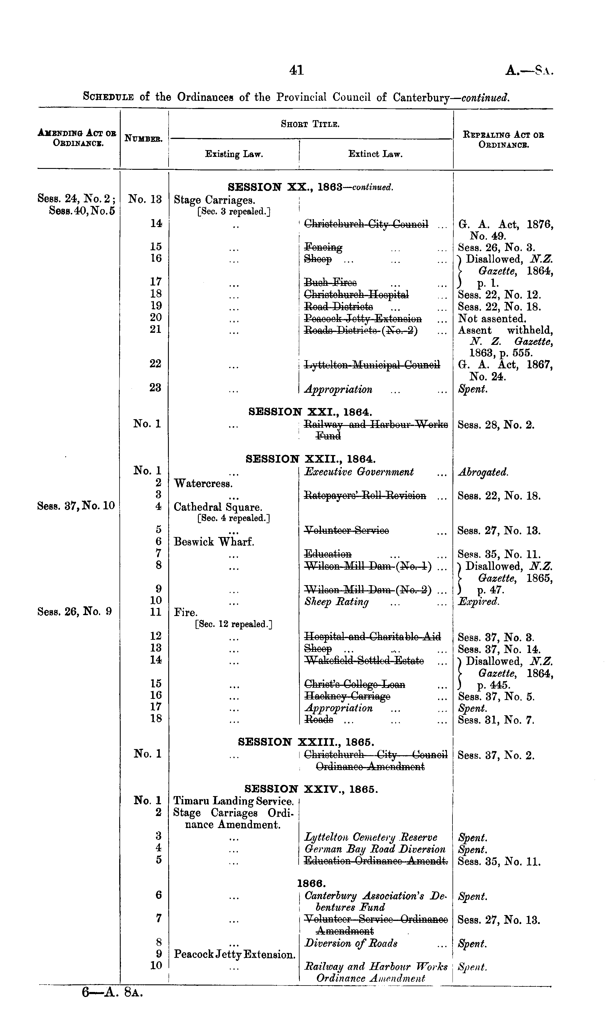 Sched 1 IE of thi Ordinances of the Provincial Council of Canterbury— continued. SnosT Title. Amendino Act oe Oedinance. Number. Repealing Act oe Oedinancb. Existing Law. Extinct Law. Sess. 24, No. 2; Sess. 40, No. 5 No. 13 SESSION XX., 1863—continued. Stage Carriages. [Sec. 3 repealed.] 14 ■ Cliriotcliurch City Council ... G. A. Act, 1876, No. 49. Sess. 26, No. 3. ) Disallowed, N.Z. \ Gazette, 1864, ) P- ISess. 22, No. 12. Sess. 22, No. 18. Not assented. Assent withheld, N. Z. Gazette, 1863, p. 555. a. A. Act, 1867, No. 24. Spent. 15 16 17 18 19 20 21 Buoh Eiroo Chriotchurch Hoopital Eoad Diotrioto Peacock Jetty Extenoion ... Koado Dinti-i'*'tii (No. 2) 22 Lyttelton Municipal Counoil 23 Appropriation No. 1 SESSION XXI., 1864. Baihvay and Harbour Worka rj\tncl Sess. 28, No. 2. No. 1 2 3 4 SESSION XXII., 1864. Executive Government Abrogated. Sess. 37, No. 10 Watercress. Pnt^mT^i-n' "P^ll "P^-rrini^v. -Ratepayers -tton Jtovioion ... Cathedral Square. [Sec. 4 repealed.] Sess. 22, No. 18. 5 6 7 8 Volunteer Sorvioo Beswick Wharf. Volunteer Sorvioo Sess. 27, No. 13. 9 10 11 Thrill p.fi"H mi Wiloon Mill Dam ffle^4) ... "Wiloon Mill Dam (U<*-2) ... Wiloon Mill Dam ffler-3:) ... "VViloon Mill Dam (£fe,-3) ... Sheep Rating Sess. 35, No. 11. ~\ Disallowed, N.Z. > Gazette, 1865, ) p. 47. Expired. Sheep Rating Sess. 26, No. 9 Fire. [Sec. 12 repealed.] TT li 1 ] /"11 :j 1-1_ A-J Hoopital and Charitable Aid Wakofioid.Sottlod Eotato .'.'. 12 13 14 15 16 17 18 Hoopital and Charitable Aid C11 "nr_i-_£_u o _i_i.i. j * •Waliofiold.Bottled Eotato ... Chriot'o Collogo Loan tt- -i__- n • _ _ Chriot'o Collogo Loan Haolmey Carriage Appropriation Sess. 37, No. 3. Sess. 37, No. 14. ) Disallowed, N.Z. \ Gazette, 1864, ) p. 445. Sess. 37, No. 5. Spent. Sess. 31, No. 7. Hackney Carriage Appropriation t • i p*i «•■ ■ ■ ■ No. 1 SESSION XXIII., 1865. JCXIII., 1865. Sess. 37, No. 2. Chriotchurch City—Council Ordinunoo Amendment Ordinunoo Amendment No. 1 2 SESSION XXIV., 1865. Timaru Landing Service. Stage Carriages Ordinance Amendment. XXIV., 1865. 3 4 5 Lyttelton Cemetery Reserve Lyttelton Cemetery Reserve German Say Road Diversion Education Ordinance Amondt. Spent. Spent. Sess. 35, No. 11. German Say Road Diversion Education Ordinance Amondt. 1 o/■>/■» 6 1866. Canterbury Association's Debentures Fund .866. Canterbury Association's Debentures Fund Spent. 7 '" ii { '{/ CO t. I' III'. Volunteer Sorvioo Ordinanco Amendment Sess. 27, No. 13. 8 9 10 Diversion of Roads Peacock Jetty Extension. Amendment Diversion of Roads Spent. Railway and Harbour Works Railway and Harbour Works Ordinance Amendment Spent. 6—A. 8a.