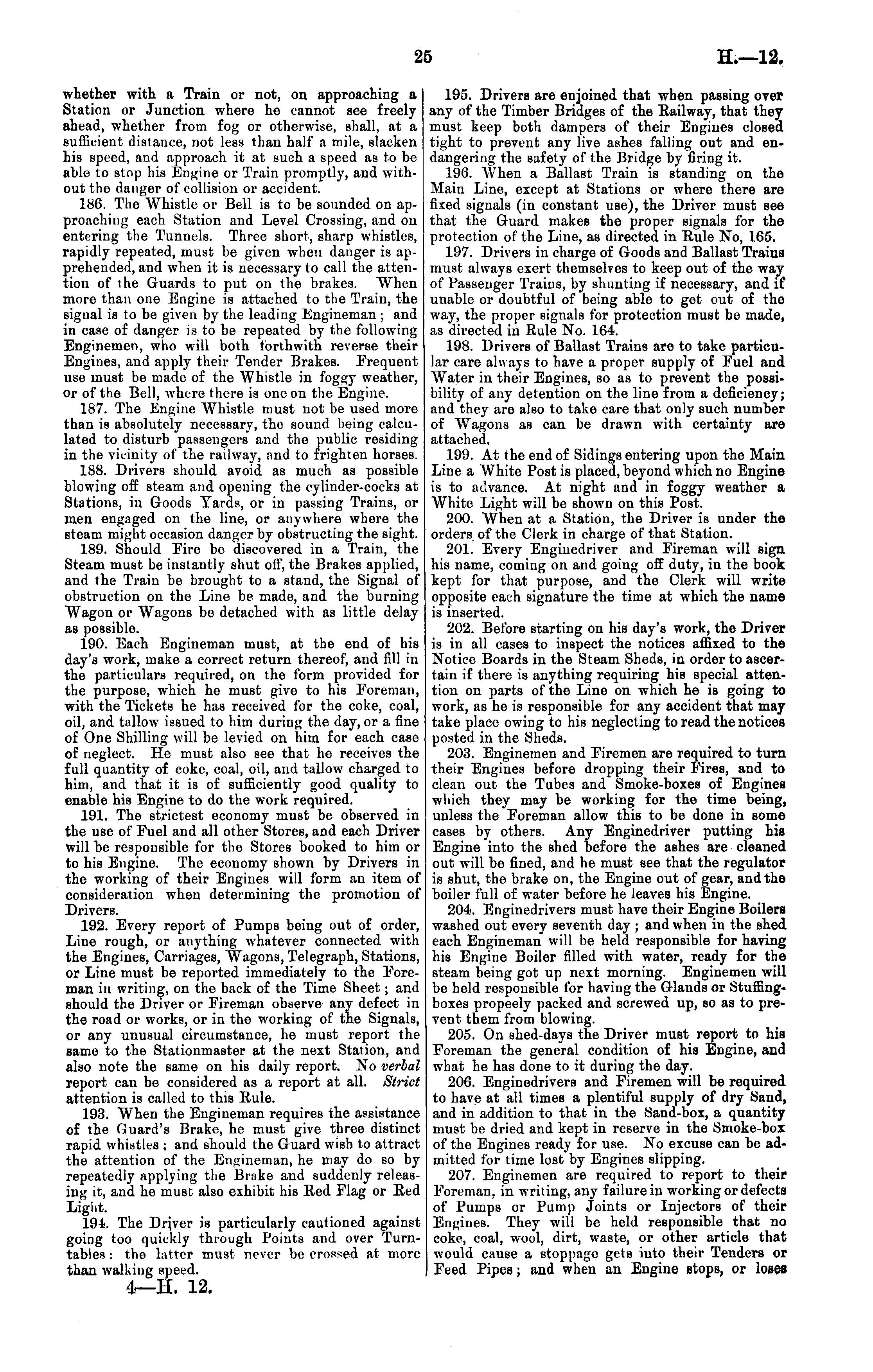 whether with a Train or not, on approaching a 195. Drivers are enjoined that when passing over Station or Junction where he cannot see freely any of the Timber Bridges of the Eailway, that they ahead, whether from fog or otherwise, shall, at a must keep both dampers of their Engines closed sufficient distance, not less than half a mile, slacken tight to prevent any live ashes falling out and enhis speed, and approach it at such a speed as to be dangering the safety of the Bridge by firing it. able to stop his Engine or Train promptly, and with- 196. When a Ballast Train is standing on the out the danger of collision or accident. Main Line, except at Stations or where there are 186. The Whistle or Bell is to be sounded on ap- fixed signals (in constant use), the Driver must see preaching each Station and Level Crossing, and on that the Guard makes the proper signals for the entering the Tunnels. Three short, sharp whistles, protection of the Line, as directed in Rule No, 165. rapidly repeated, must be given when danger is ap- 197. Drivers in charge of Goods and Ballast Trains prehended, and when it is necessary to call the atten- must always exert themselves to keep out of the way tion of the Guards to put on the brakes. When of Passenger Trains, by shunting if necessary, and if more than one Engine is attached to the Train, the unable or doubtful of being able to get out of the signal is to be given by the leading Engineman; and way, the proper signals for protection must be made, in case of danger is to be repeated by the following as directed in Rule No. 164. Enginemen, who will both forthwith reverse their 198. Drivers of Ballast Trains are to take particuEngines, and apply their Tender Brakes. Frequent lar care always to have a proper supply of Fuel and use must be made of the Whistle in foggy weather, Water in their Engines, so as to prevent the possior of the Bell, where there is one on the Engine. bility of any detention on the line from a deficiency; 187. The Engine Whistle must not be used more and they are also to take care that only such number than is absolutely necessary, the sound being calcu- of Wagons as can be drawn with certainty are lated to disturb passengers and the public residing attached. in the vicinity of the railway, and to frighten horses. 199. At the end of Sidings entering upon the Main 188. Drivers should avoid as much as possible Line a White Post is placed, beyond which no Engine blowing off steam and opening the cylinder-cocks at is to advance. At night and in foggy weather a Stations, in Goods Yards, or in passing Trains, or White Light will be shown on this Post. men engaged on the line, or anywhere where the 200. When at a Station, the Driver is under the steam might occasion danger by obstructing the sight, orders of the Clerk in charge of that Station. 189. Should Fire be discovered in a Train, the 201. Every Enginedriver and Fireman will sign Steam must be instantly shut off, the Brakes applied, his name, coming on and going off duty, in the book and the Train be brought to a stand, the Signal of kept for that purpose, and the Clerk will write obstruction on the Line be made, and the burning opposite each signature the time at which the name Wagon or Wagons be detached with as little delay is inserted. as possible. 202. Before starting on his day's work, the Driver 190. Each Engineman must, at the end of his is in all cases to inspect the notices affixed to the day's work, make a correct return thereof, and fill in Notice Boards in the Steam Sheds, in order to ascerthe particulars required, on the form provided for tain if there is anything requiring his special attenthe purpose, which he must give to his Foreman, tion on parts of the Line on which he is going to with the Tickets he has received for the coke, coal, work, as he is responsible for any accident that may oil, and tallow issued to him during the day, or a fine take place owing to his neglecting to read the notices of One Shilling will be levied on him for each case posted in the Sheds. of neglect. He must also see that he receives the 203. Enginemen and Firemen are required to turn full quantity of coke, coal, oil, and tallow charged to their Engines before dropping their Fires, and to him, and that it is of sufficiently good quality to clean out the Tubes and Smoke-boxes of Engines enable his Engine to do the work required. which they may be working for the time being, 191. The strictest economy must be observed in unless the Foreman allow this to be done in some the use of Fuel and all other Stores, and each Driver cases by others. Any Enginedriver putting his will be responsible for the Stores booked to him or Engine into the shed before the ashes are cleaned to his Engine. The economy shown by Drivers in out will be fined, and he must see that the regulator the working of their Engines will form an item of is shut, the brake on, the Engine out of gear, and the consideration when determining the promotion of boiler full of water before he leaves his Engine. Drivers. 204. Enginedrivers must have their Engine Boilers 192. Every report of Pumps being out of order, I washed out every seventh day ; and when in the shed Line rough, or anything whatever connected with j each Engineman will be held responsible for having the Engines, Carriages, Wagons, Telegraph, Stations, his Engine Boiler filled with water, ready for the or Line must be reported immediately to the Fore- steam being got up next morning. Enginemen will man in writing, on the back of the Time Sheet; and be held responsible for having the Glands or Stuffingshould the Driver or Fireman observe any defect in boxes propeely packed and screwed up, so as to prethe road or works, or in the working of the Signals, vent them from blowing. or any unusual circumstance, he must report the 205. On shed-days the Driver must report to his same to the Stationmaster at the next Station, and Foreman the general condition of his Engine, and als