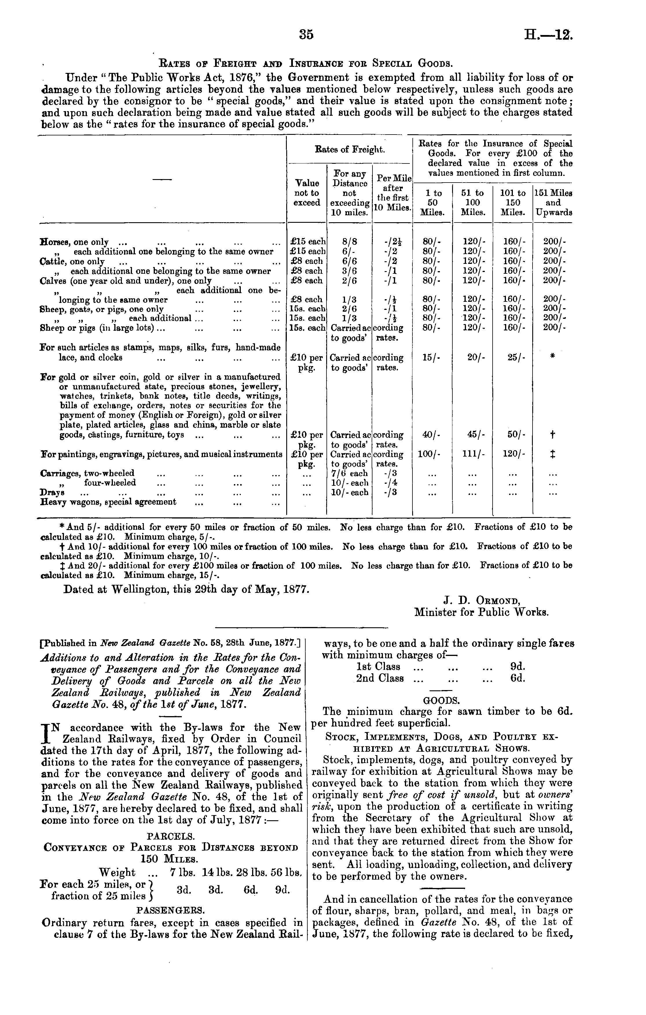 *And 5/- additional for every 50 miles or fraction of 50 miles. No less charge than for £10. Fractions of £10 to be calculated as £10. Minimum charge, 5/-. + And 10/- additional for every 100 miles or fraction of 100 miles. No less charge thau for £10. Fractions of £10 to be calculated as £10. Minimum charge, 10/-. J And 20/- additional for every £100 miles or fraction of 100 miles. No less charge than for £10. Fractions of £10 to be calculated as £10. Minimum charge, 15/-. Dated at Wellington, this 29th day of May, 1877. J. D. Ormond, Minister for Public Works.