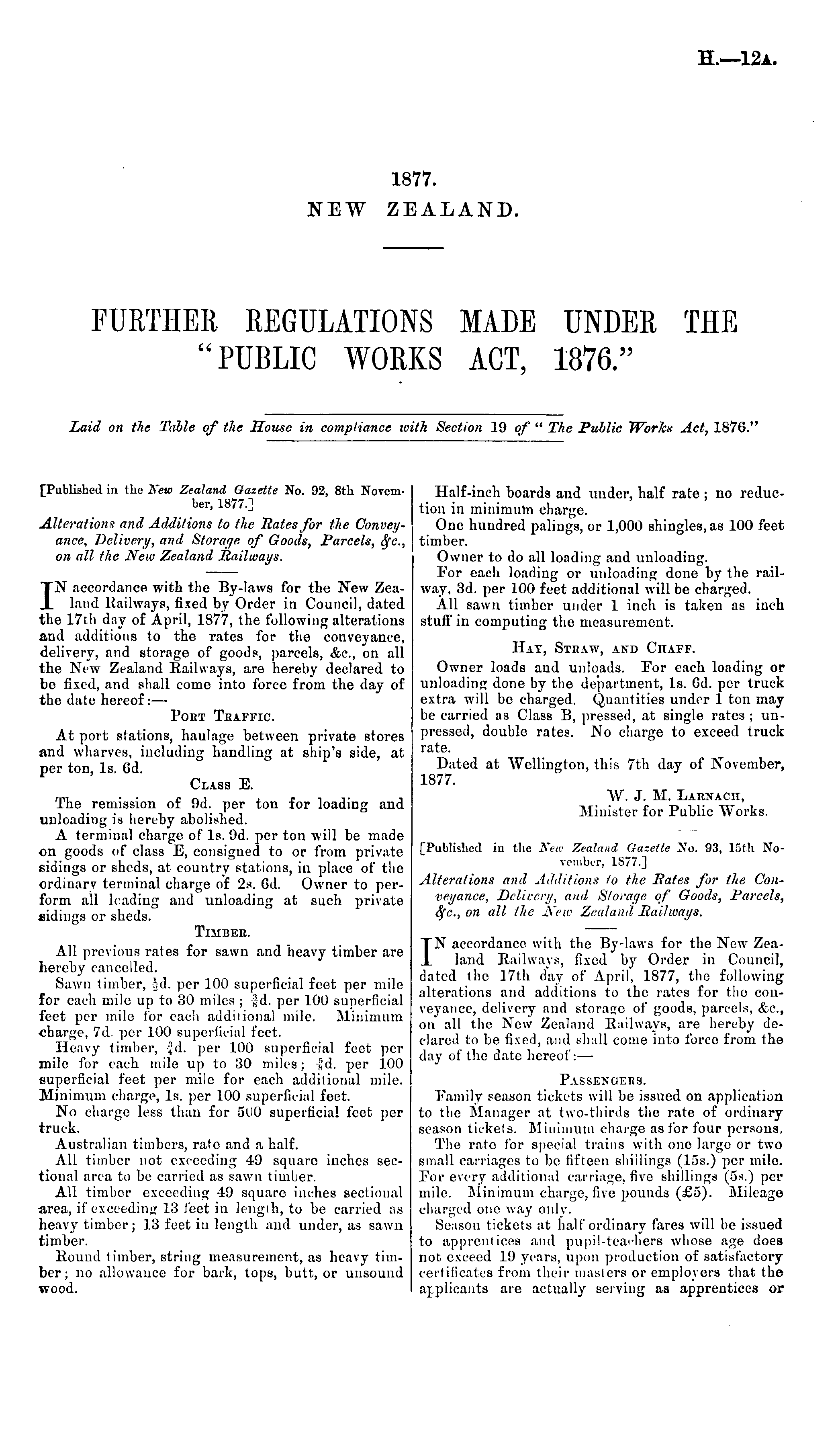 Half-inch boards and under, half rate ; no reduction in minimum charge. One hundred palings, or 1,000 shingles, as 100 feet timber. Owner to do all loading and unloading. For each loading or unloading done by the railway, 3d. per 100 feet additional will be charged. All sawn timber under 1 inch is taken as inch stuff in computing the measurement. Hat, Straw, and CnAFF. Owner loads and unloads. For each loading or unloading done by the department, Is. 6d. per truck extra will be charged. Quantities under 1 ton may be carried as Class B, pressed, at single rates ; unpressed, double rates. No charge to exceed truck rate. Dated at Wellington, this 7th day of November, 1877. W. J. M. Larnach, Minister for Public AVorks. [Published in the New Zealand Gazette No. 93, 15th November, 1877.] Alterations and Additions to the Rates for the Conveyance, Delivery, and Storage of Goods, Parcels, fyc, on all the New Zealand Railways.