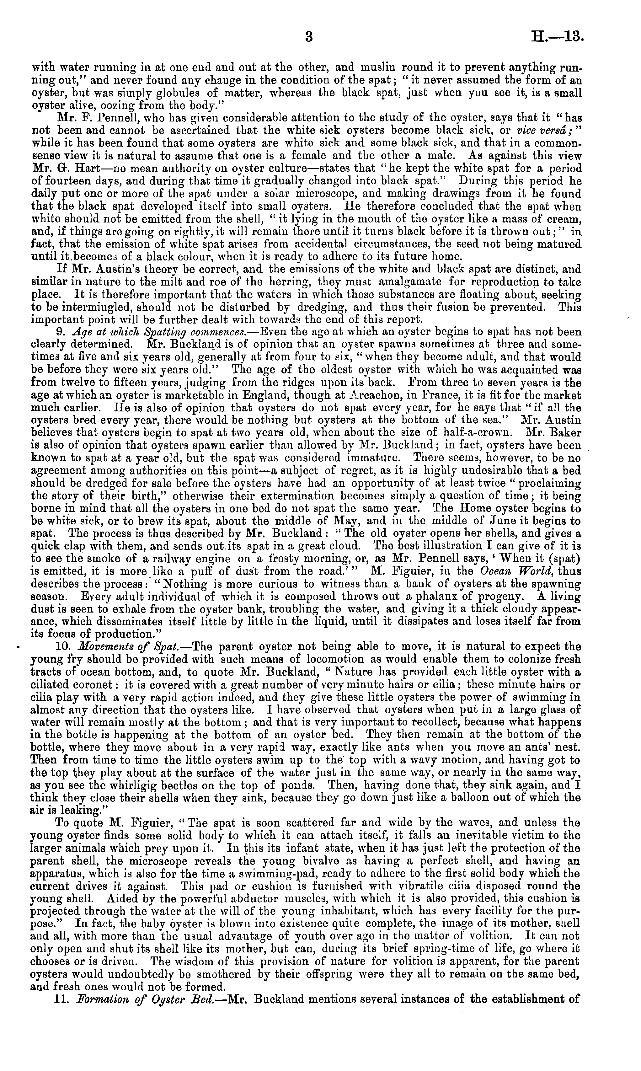 with water running in at one end and out at the other, and ruusliu round it to prevent anything running out," and never found any change in the condition of the spat; " it never assumed the form of an oyster, but was simply globules of matter, whereas the black spat, just when you see it, is a small oyster alive, oozing from the body." Mr. F. Pennell, who has given considerable attention to the study of the oyster, says that it " has not been and cannot be ascertained that the white sick oysters become black sick, or vice versa;" while it has been found that some oysters are white sick and some black sick, and that in a commonsense view it is natural to assume that one is a female and the other a male. As against this view Mr. Gr. Hart —no mean authority on oyster culture —states that " he kept the white spat for a period of fourteen days, and during that time it gradually changed into black spat." During this period he daily put one or more of the spat under a solar microscope, and making drawings from it he found that the black spat developed itself into small oysters. He therefore concluded that the spat when white should not be omitted from the shell, " it lying in the mouth of the oyster like a mass of cream, and, if things are going on rightly, it will remain there until it turns black before it is thrown out; " in fact, that the emission of white spat arises from accidental circumstances, the seed not being matured until it.become.^ of a black colour, when it is ready to adhere to its future home. If Mr. Austin's theory be correct, and the emissions of the white and black spat are distinct, and similar in nature to the milt aud roe of the herring, they must amalgamate for reproduction to take place. It is therefore important that the waters in which these substances are floating about, seeking to be intermingled, should not be disturbed by dredging, and thus their fusion bo prevented. This important point will be further dealt with towards the end of this report. 9. Age at which Spatting commences. —Even the age at which an oyster begins to spat has not been clearly determined. Mr. Buckland is of opinion that an oyster spawns sometimes at three and sometimes at five and six years old, generally at from four to six, " when they become adult, and that would be before they were six years old." The age of the oldest oyster with which he was acquainted was from twelve to fifteen years, judging from the ridges upon its back. From three to seven years is the age at which an oyster is marketable in England, though at Arcachon, in France, it is fit for the market much earlier. He is also of opinion that oysters do not spat every year, for he says that " if all the oysters bred every year, there would be nothing but oysters at the bottom of the sea." Mr. Austin believes that oysters begin to spat at two years old, when about the size of half-a-crown. Mr. Baker is also of opinion that oysters spawn earlier than allowed by Mr. Buckland; in fact, oysters have been known to spat at a year old, but the spat was considered immature. There seems, however, to be no agreement among authorities on this point —a subject of regret, as it is highly undesirable that a bed should be dredged for sale before the oysters have had an opportunity of at least twice "proclaiming the story of their birth," otherwise their extermination becomes simply a question of time; it being borne in mind that all the oysters in one bed do not spat the same year. The Home oyster begins to be white sick, or to brew its spat, about the middle of May, and in the middle of June it begins to spat. The process is thus described by Mr. Buckland : " The old oyster opens her shells, and gives a quick clap with them, and sends out. its spat in a great cloud. The best illustration I can give of it is to see the smoke of a railway engine on a frosty morning, or, as Mr. Pennell says, ' When it (spat) is emitted, it is more like a puff of dust from the road.' " M. Figuier, in the Ocean World, thus describes the process: " Nothing is more curious to witness than a bank of oysters at the spawning season. Every adult individual of which it is composed throws out a phalanx of progeny. A living dust is seen to exhale from the oyster bank, troubling the water, and giving it a thick cloudy appearance, which disseminates itself little by little iu the liquid, until it dissipates and loses itself far from its focus of production." 10. Movements of Spat. —The parent oyster not being able to move, it is natural to expect the young fry should be provided with such means of locomotion as would enable them to colonize fresh tracts of ocean bottom, and, to quote Mr. Buckland, " Nature has provided each little oyster with a ciliated coronet: it is covered with a great number of very minute hairs or cilia; these minute hairs or cilia play with a very rapid action indeed, and they give these little oysters the power of swimming in almost any direction that the oysters like. I have observed that oysters when put in a largo glass of water will remain mostly at the bottom; and that is very important to recollect, because what happens in the bottle is happening at the bottom of an oyster bed. They then remain at the bottom of the bottle, where they move about in a very rapid way, exactly like ants when you move an ants' nest. Then from time to time the little oysters swim up to the top with a wavy motion, and having got to the top they play about at the surface of the water just in the same way, or nearly in the same way, as you see the whirligig beetles on the top of ponds. Then, having done that, they sink again, and I think they close their shells when they sink, because they go down just like a balloon out of which the air is leaking." To quote M. Figuier, "The spat is soon scattered far and wide by the waves, and unless the young oyster finds some solid body to which it can attach itself, it falls an inevitable victim to the larger animals which 