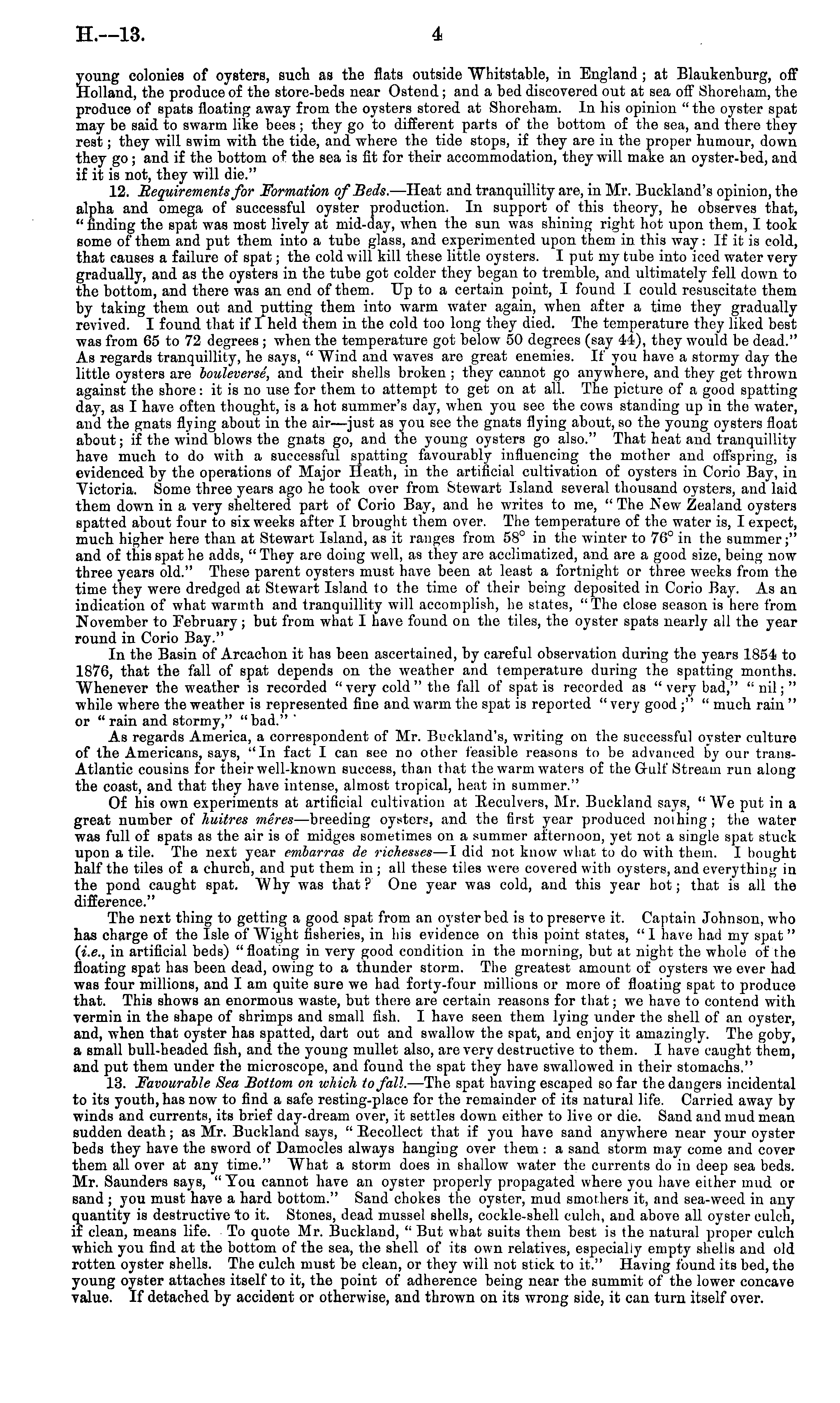 young colonies of oysters, such as the flats outside Whitstable, in England ; at Blaukenburg, off Holland, the produce of the store-beds near Ostend ; and a bed discovered out at sea off Shoreham, the produce of spats floating away from the oysters stored at Shoreham. In his opinion " the oyster spat may be said to swarm like bees; they go to different parts of the bottom of the sea, and there they rest; they will swim with the tide, and where the tide stops, if they are iu the proper humour, down they go ; and if the bottom of the sea is fit for their accommodation, they will make an oyster-bed, and if it is not, they will die." 12. Requirements for Formation of Beds. —Heat and tranquillity are, in Mr. Buckland's opinion, the alpha and omega of successful oyster production. In support of this theory, he observes that, " finding the spat was most lively at mid-day, when the sun was shiniug right hot upon them, I took some of them and put them iuto a tube glass, and experimented upon them in this way: If it is cold, that causes a failure of spat; the cold will kill these little oysters. I put my tube into iced water very gradually, and as the oysters in the tube got colder they began to tremble, and ultimately fell down to the bottom, and there was an end of them. Up to a certain point, I found I could resuscitate them by taking them out and putting them into warm water again, when after a time they gradually revived. I found that if I held them in the cold too long they died. The temperature they liked best was from 65 to 72 degrees ; when the temperature got below 50 degrees (say 44), they would be dead." As regards tranquillity, he says, " Wind and w Taves are great enemies. If you have a stormy day the little oysters are bouleverse, and their shells brokeu ; they cannot go anywhere, and they get thrown against the shore: it is no use for them to attempt to get on at all. The picture of a good spatting day, as I have often thought, is a hot summer's day, when you see the cows standing up in the water, and the gnats flying about in the air—just as you see the gnats flying about, so the young oysters float about; if the wind blows the gnats go, and the young oysters go also." That heat and tranquillity have much to do with a successful spatting favourably influencing the mother and offspring, is evidenced by the operations of Major Heath, in the artificial cultivation of oysters in Corio Bay, in Victoria. Some three years ago he took over from Stewart Island several thousand oysters, and laid them down in a very sheltered part of Corio Bay, and he writes to me, " The JS'ew Zealand oysters spatted about four to six weeks after I brought them over. The temperature of the water is, I expect, much higher here than at Stewart Island, as it ranges from 58° in the winter to 76° in the summer;" and of this spat he adds, " They are doing well, as they are acclimatized, and are a good size, being now three years old." These parent oysters must have been at least a fortnight or three weeks from the time they were dredged at Stewart Island to the time of their being deposited in Corio Bay. As an indication of what warmth and tranquillity will accomplish, he states, "The close season is here from November to February; but from what I have found on the tiles, the oyster spats nearly all the year round in Corio Bay." In the Basin of Arcachon it has been ascertained, by careful observation during the years 1854 to 1876, that the fall of spat depends on the weather and temperature during the spatting months. "Whenever the weather is recorded "very cold" the fall of spat is recorded as "very bad," "nil;" while where the weather is represented fine and warm the spat is reported " very good ;" " much rain " or "rain and stormy," "bad." ' As regards America, a correspondent of Mr. Buckland's, writing on the successful oyster culture of the Americans, says, "In fact I can see no other feasible reasons to be advanced by our transAtlantic cousins for their well-known success, than that the warm waters of the Gulf Stream run along the coast, and that they have intense, almost tropical, heat in summer." Of his own experiments at artificial cultivation at Reculvers, Mr. Buckland says, " We put in a great number of huitres meres —breeding oysters, and the first year produced nothing; the water was full of spats as the air is of midges sometimes on a summer afternoon, yet not a single spat stuck upon a tile. The next year enibarras de richesses —I did not know what to do with them. I bought half the tiles of a church, and put them in; all these tiles were covered with oysters, and every thing in the pond caught spat. Why was that? One year was cold, and this year hot; that is all the difference." The next thing to getting a good spat from an oyster bed is to preserve it. Captain Johnson, who has charge of the Isle of Wight fisheries, in his evidence on this point states, "I have had my spat" (i.e., in artificial beds) "floating in very good condition in the morning, but at night the whole of the floating spat has been dead, owing to a thunder storm. The greatest amount of oysters we ever had was four millions, and I am quite sure we had forty-four millions or more of floating spat to produce that. This shows an enormous waste, but there are certain reasons for that; we have to contend with vermin in the shape of shrimps and small fish. I have seen them lying under the shell of an oyster, and, when that oyster has spatted, dart out and swallow the spat, and enjoy it amazingly. The goby, a small bull-headed fish, and the young mullet also, are verv destructive to them. I have caught them, and put them under the microscope, and found the spat they have swallowed in their stomachs." 13. Favourable Sea Bottom on which to fall. —The spat having escaped so far the dangers incidental to its youth, has now to find a safe resting-place for the remainder of its natural life. Carried away by winds and currents, its 