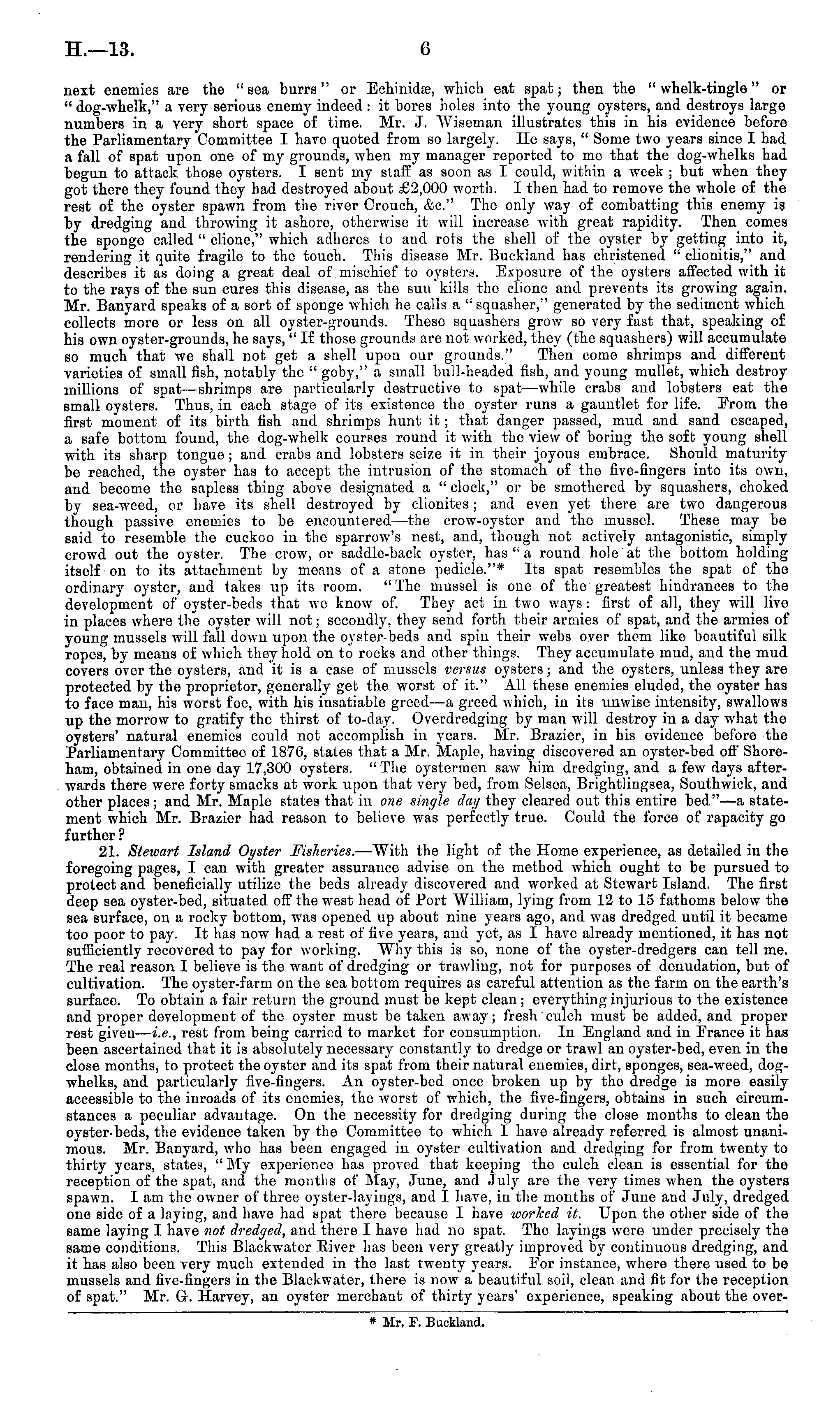next enemies are the "sea burrs" or Echinidse, which eat spat; then the "whelk-tingle" or " dog-whelk," a very serious enemy indeed : it bores holes into the young oysters, and destroys large numbers in a very short space of time. Mr. J. Wiseman illustrates this in his evidence before the Parliamentary Committee I have quoted from so largely. He says, " Some two years since I had a fall of spat upon one of my grounds, when my manager reported to me that the dog-whelks had begun to attack those oysters. I sent my staff as soon as I could, within a week ; but when they got there they found they had destroyed about £2,000 worth. I then had to remove the whole of the rest of the oyster spawn from the river Crouch, &c." The only way of combatting this enemy is by dredging and throwing it ashore, otherwise it will increase with great rapidity. Then comes the sponge called " clione," which adheres to and rots the shell of the oyster by getting into it, rendering it quite fragile to the touch. This disease Mr. Buekland has christened " clionitis," and describes it as doing a great deal of mischief to oysters. Exposure of the oysters affected with it to the rays of the sun cures this disease, as the sun kills the clione and prevents its growing again. Mr. Banyard speaks of a sort of sponge which he calls a " squasher," generated by the sediment which collects more or less on all oyster-grounds. These squashers grovf so very fast that, speaking of his own oyster-grounds, he says, " If those grounds are not worked, they (the squashers) will accumulate so much that we shall not get a shell upon our grounds." Then come shrimps and different varieties of small fish, notably the " goby," a small bull-headed fish, and young mullet, which destroy millions of spat —shrimps are particularly destructive to spat —while crabs and lobsters eat the small ovsters. Thus, in each stage of its existence the oyster runs a gauntlet for life. Prom the first moment of its birth fish and shrimps hunt it; that danger passed, mud and sand escaped, a safe bottom found, the dog-whelk courses round it with the view of boring the soft young shell with its sharp tongue ; and crabs and lobsters seize it in their joyous embrace. Should maturity be reached, the oyster has to accept the intrusion of the stomach of the five-fingers into its own, and become the sapless thing above designated a " clock," or be smothered by squashers, choked by sea-weed, or have its shell destroyed by clionites; and even yet there are two dangerous though passive enemies to be encountered —the crow-oyster and the mussel. These may be said to resemble the cuckoo in the sparrow's nest, and, though not actively antagonistic, simply crowd out the oyster. The crow, or saddle-back oyster, has " a round hole at the bottom holding itself on to its attachment by means of a stone pedicle."* Its spat resembles the spat of the ordinary oyster, and takes up its room. "The mussel is one of the greatest hindrances to the development of oyster-beds that wo know of. They act in two ways: first of all, they will live in places where the ovster will not; secondly, they send forth their armies of spat, and the armies of young mussels will fall down upon the oyster-beds and spin their webs over them like beautiful silk ropes, by means of which they hold on to rocks and other things. They accumulate mud, and the mud covers over the ovsters, and it is a case of mussels versus oysters; and the oysters, unless they are protected by the proprietor, generally get the worst of it." All these enemies eluded, the oyster has to face man, his worst foe, with his insatiable greed —a greed which, in its unwise intensity, swallows up the morrow to gratify the thirst of to-day. Ovcrdredging by man will destroy in a day what the oysters' natural enemies could not accomplish in years. Mr. Brazier, in his evidence before the Parliamentary Committee of 1876, states that a Mr. Maple, having discovered an oyster-bed off Shoreham, obtained in one day 17,300 oysters. " The oystermen saw him dredging, and a few days afterwards there were forty smacks at work upon that very bed, from Selsea, Brightlingsea, Southwick, and other places; and Mr. Maple states that in one single day they cleared out this entire bed"—a statement which Mr. Brazier had reason to believe was perfectly true. Could the force of rapacity go further ? 21. Stewart Island Oyster Fisheries. —"With the light of the Home experience, as detailed in the foregoing pages, I can with greater assurance advise on the method which ought to be pursued to protect and beneficially utilize the beds already discovered and worked at Stewart Island. The first deep sea oyster-bed, situated off the west head of Port William, lying from 12 to 15 fathoms below the sea surface, on a rocky bottom, was opened up about nine years ago, and was dredged until it became too poor to pay. It has now had a rest of five years, and yet, as I have already mentioned, it has not sufficiently recovered to pay for working. Why this is so, none of the oyster-dredgers can tell me. The real reason I believe is the want of dredging or trawling, not for purposes of denudation, but of cultivation. The oyster-farm on the sea bottom requires as careful attention as the farm on the earth's surface. To obtain a fair return the ground must be kept clean ; everything injurious to the existence and proper development of the oyster must be taken away; fresh culch must be added, and proper rest given— i.e., rest from being carried to market for consumption. In England and in France it has been ascertained that it is absolutely necessary constantly to dredge or trawl an oyster-bed, even in the close months, to protect the oyster and its spat from their natural enemies, dirt, sponges, sea-weed, dogwhelks, and particularly five-fingers. An oyster-bed once broken up by the dredge is more easily accessible to the inroads of its enemies, the worst of which, the five-finger