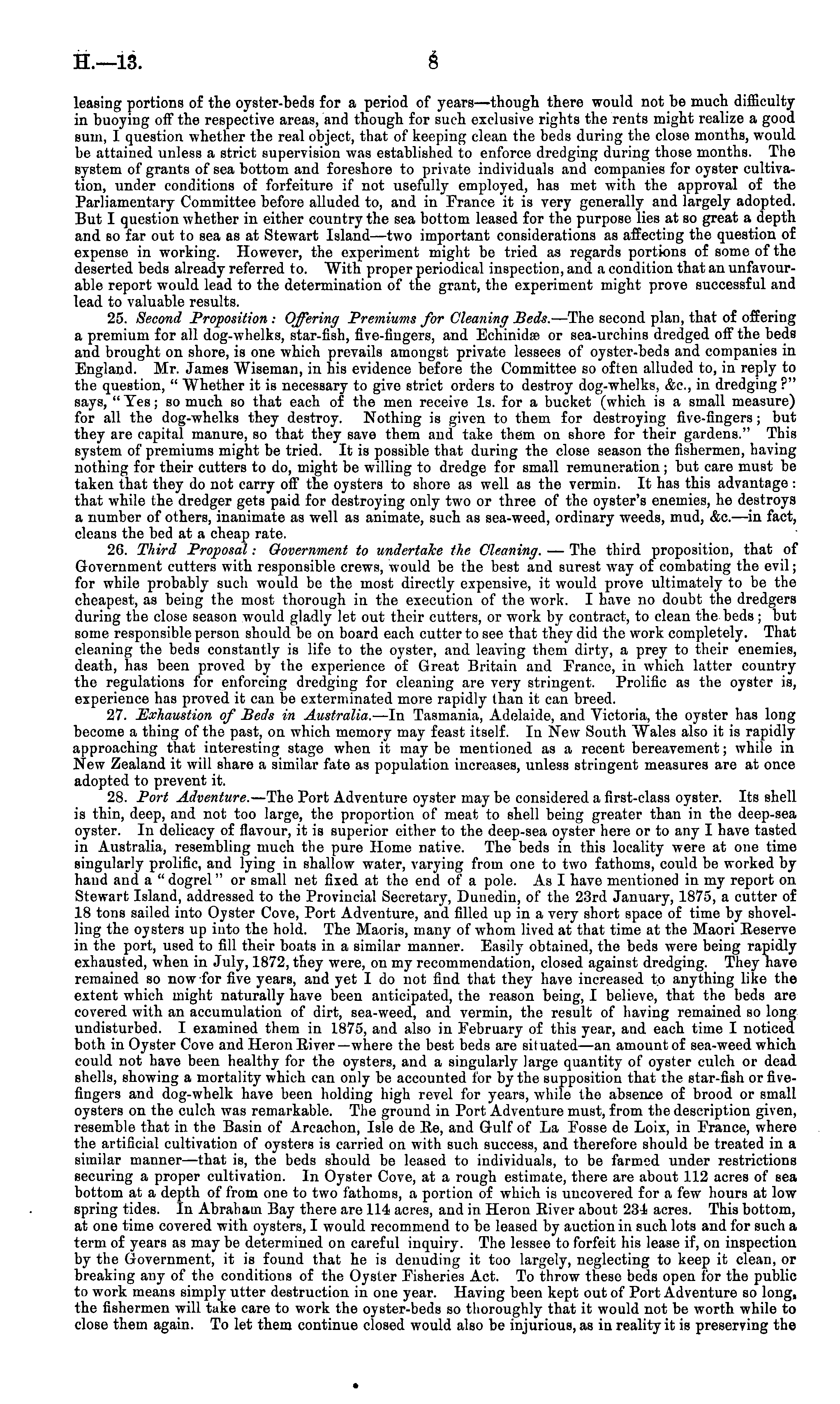 leasing portions of the oyster-beds for a period of years —though there would not be much difficulty in buoying off the respective areas, and though for such exclusive rights the rents might realize a good sum, I question whether the real object, that of keeping clean the beds during the close months, would be attaiued unless a strict supervision was established to enforce dredging during those months. The system of grants of sea bottom and foreshore to private individuals and companies for oyster cultivation, under conditions of forfeiture if not usefully employed, has met with the approval of the Parliamentary Committee before alluded to, and in France it is very generally and largely adopted. But I question whether in either country the sea bottom leased for the purpose lies at so great a depth and so far out to sea as at Stewart Island —two important considerations as affecting the question of expense in working. However, the experiment might be tried as regards portions of some of the deserted beds already referred to. With proper periodical inspection, and a condition that an unfavourable report would lead to the determination of the grant, the experiment might prove successful and lead to valuable results. 25. Second Proposition : Offering Premiums for Cleaning Beds. —The second plan, that of offering a premium for all dog-whelks, star-fish, five-fingers, and Echinida? or sea-urchins dredged off the beds and brought on shore, is one which prevails amongst private lessees of oyster-beds and companies in England. Mr. James Wiseman, in his evidence before the Committee so often alluded to, in reply to the question, " Whether it is necessary to give strict orders to destroy dog-whelks, &c, in dredging?" says, " Tes; so much so that each of the men receive Is. for a bucket (which is a small measure) for all the dog-whelks they destroy. Nothing is given to them for destroying five-fingers ; but they are capital manure, so that they save them and take them on shore for their gardens." This system of premiums might be tried. It is possible that during the close season the fishermen, having nothing for their cutters to do, might be willing to dredge for small remuneration; but care must be taken that they do not carry off the oysters to shore as well as the vermin. It has this advantage : that while the dredger gets paid for destroying only two or three of the oyster's enemies, he destroys a number of others, inanimate as well as animate, such as sea-weed, ordinary weeds, mud, &c. —in fact, cleans the bed at a cheap rate. 26. Third Proj>osal: Government to undertake the Gleaning. — The third proposition, that of Government cutters with responsible crews, would be the best and surest way of combating the evil; for while probably such would be the most directly expensive, it would prove ultimately to be the cheapest, as being the most thorough in the execution of the work. I have no doubt the dredgers during the close season would gladly let out their cutters, or work by contract, to clean the beds; but some responsible person should be on board each cutter to see that they did the work completely. That cleaning the beds constantly is life to the oyster, and leaving them dirty, a prey to their enemies, death, has been proved by the experience of Great Britain and France, in which latter country the regulations for enforcing dredging for cleaning are very stringent. Prolific as the oyster is, experience has proved it can be exterminated more rapidly than it can breed. 27. Exhaustion of Beds in Australia. —In Tasmania, Adelaide, and Victoria, the oyster has long become a thing of the past ; on which memory may feast itself. In New South Wales also it is rapidly approaching that interesting stage when it maybe mentioned as a recent bereavement; while in New Zealand it will share a similar fate as population increases, unless stringent measures are at once adopted to prevent it. 28. Port Adventure. —The Port Adventure oyster may be considered a first-class oyster. Its shell is thin, deep, and not too large, the proportion of meat to shell being greater than in the deep-sea oyster. In delicacy of flavour, it is superior either to the deep-sea oyster here or to any I have tasted in Australia, resembling much the pure Home native. The beds in this locality were at one time singularly prolific, and lying in shallow water, varying from one to two fathoms, could be worked by hand and a " dogrel" or small net fixed at the end of a pole. As I have mentioned in my report on Stewart Island, addressed to the Provincial Secretary, Duuedin, of the 23rd January, 1875, a cutter of 18 tons sailed into Oyster Cove, Port Adventure, and filled up in a very short space of time by shovelling the oysters up into the hold. The Maoris, many of whom lived at that time at the Maori Eeserve in the port, used to fill their boats in a similar manner. Easily obtained, the beds were being rapidly exhausted, when in July, 1872, they were, on my recommendation, closed against dredging. They have remained so now for five years, and yet I do not find that they have increased to anything like the extent which might naturally have been anticipated, the reason being, I believe, that the beds are covered with an accumulation of dirt, sea-weed, and vermin, the result of having remained so long undisturbed. I examined them in 1875, and also in February of this year, and each time I noticed both in Oyster Cove and Heron River—where the best beds are situated —an amount of sea-weed which could not have been healthy for the oysters, and a singularly large quantity of oyster culch or dead shells, showing a mortality which can only be accounted for by the supposition that the star-fish or fivefingers and dog-whelk have been holding high revel for years, while the absence of brood or small oysters on the culch was remarkable. The ground in Port Adventure must, from the description given, resemble that in the Basin of Arcach