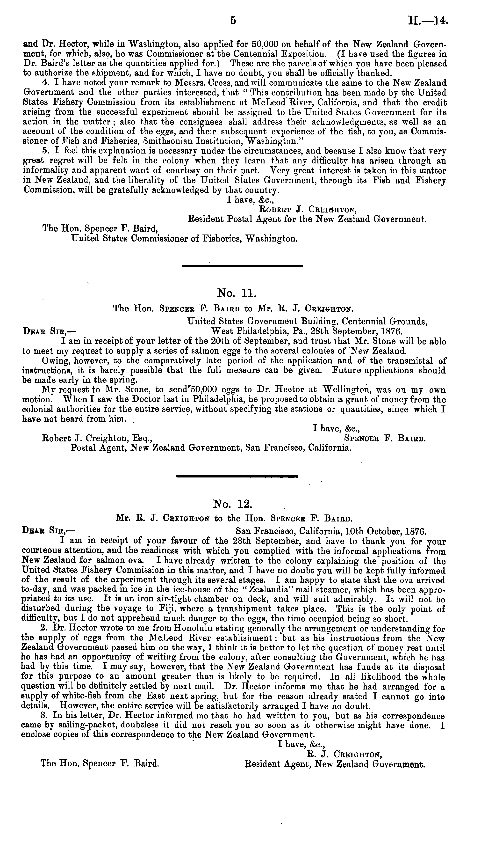 No. 12. Mr. E. J. Cbeighton to the Hon. Spenceb F. Baied. Deae Sib,— San Francisco, California, 10th October, 1876. I am in receipt of your favour of the 28th September, and have to thank you for your courteous attention, and the readiness with which you complied with the informal applications from New Zealand for salmon ova. I have already written to the colony explaining the position of the United States Fishery Commission in this matter, and I have no doubt you will be kept fully informed of the result of the experiment through its several stages. I am happy to state that the ova arrived to-day, and was packed in ice in the ice-house of the " Zealandia" mail steamer, which has been appropriated to its use. It is an iron air-tight chamber on deck, and will suit admirably. It will not be disturbed during the voyage to Fiji, where a transhipment takes place. This is the only point of difficulty, but I do not apjjrehend much danger to the eggs, the time occupied being so short. 2. Dr. Hector wrote to me from Honolulu stating generally the arrangement or understanding for the supply of eggs from the McLeod River establishment; but as his instructions from the New Zealand (Government passed him on the way, I think it is better to let the question of money rest until he has had an opportunity of writing from the colony, after consulting the Government, which he lias had by this time. I may say, however, that the New Zealand Government has funds at its disposal for this purpose to an amount greater than is likely to be required. In all likelihood the whole question will be definitely settled by next mail. Dr. Hector informs me that he had arranged for a supply of white-fish from the East next spring, but for the reason already stated I cannot go into details. However, the entire service will be satisfactorily arranged I have no doubt. 3. In his letter, Dr. Hector informed me that he had written to you, but as his correspondence came by sailing-packet, doubtless it did not reach you so soon as it otherwise might have done. I enclose copies of this correspondence to the New Zealand Government. I have, &c, E. J. Ceeighton, The Hon. Spencer F. Baird. Resident Agent, New Zealand Government,