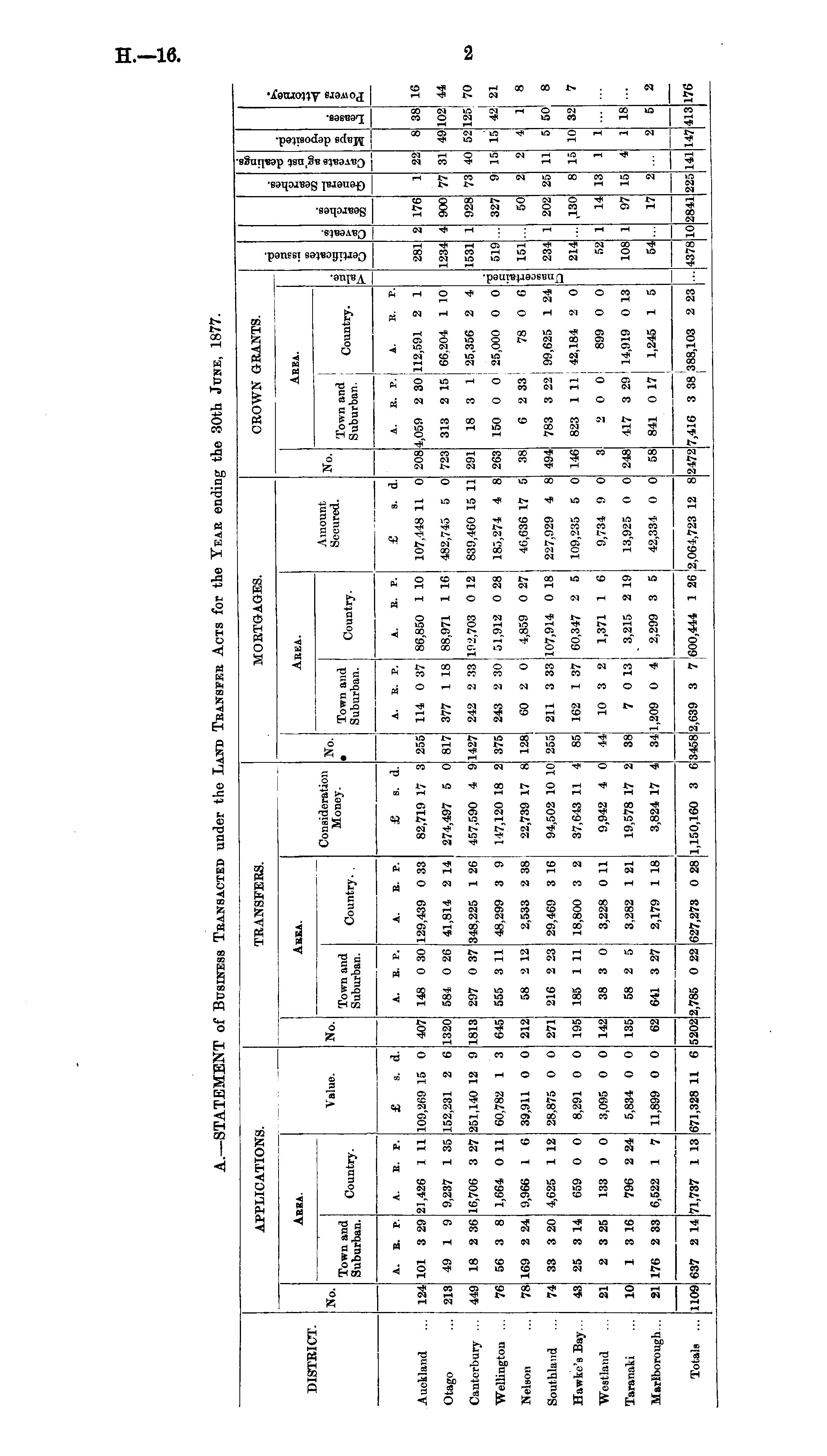 A.—STATEMENT of BUSINESS TRANSACTED under the LAND TRANSFER ACTS for the YEAR ending the 30th JUNE, 1877.