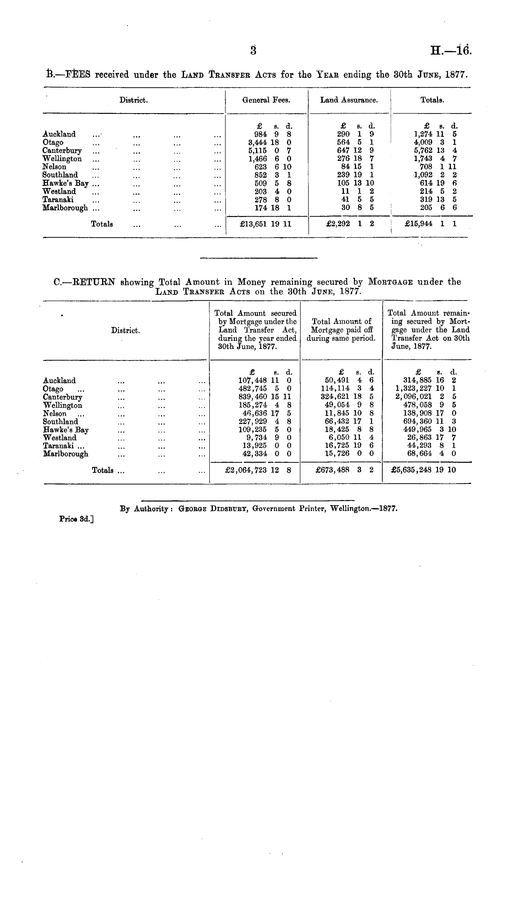 B.—FEES received under the LAND TRANSFER ACTS for the YEAR ending the 30th JUNE, 1877.