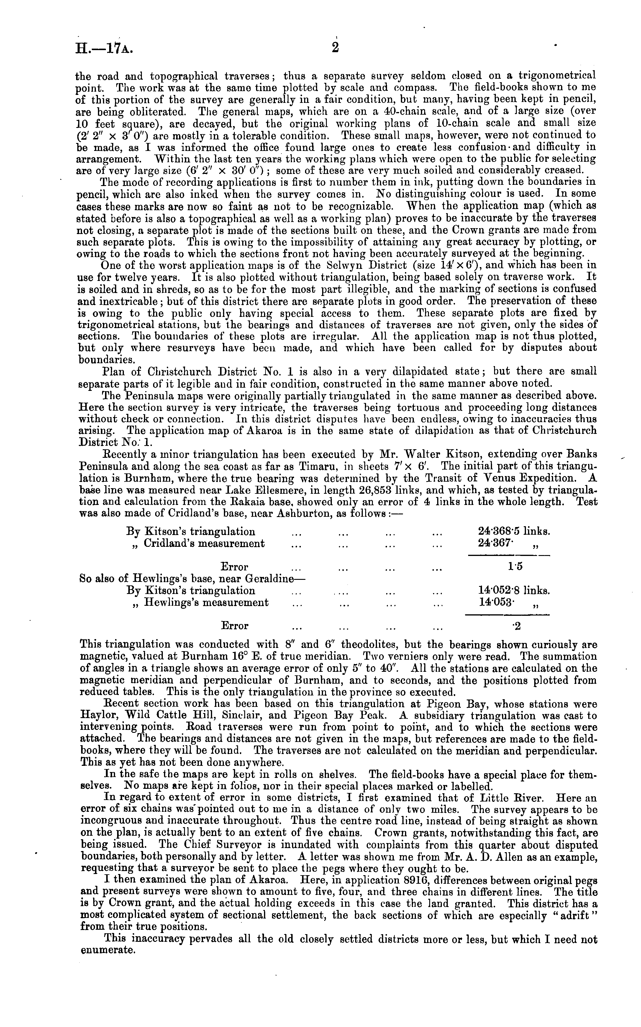 the road and topographical traverses; thus a separate survey seldom closed on a trigonometrical point. The work was at the same time plotted by scale and compass. The field-books shown to me of this portion of the survey are generally in a fair condition, but many, having been kept in pencil, are being obliterated. The general maps, which are on a 40-chain scale, and of a large size (over 10 feet square), are decayed, but the original working plans of 10-chain scale and small size (2' 2" x 3 0") are mostly in a tolerable condition. These small maps, however, were not continued to be made, as I was informed the office found large ones to create less confusion-and difficulty in arrangement. Within the last ten years the working plans which were open to the public for selecting are of very large size (6' 2 x 30' 0") ; some of these are very much soiled and considerably creased. The mode of recording applications is first to number them in ink, putting down the boundaries in pencil, which are also inked when the survey comes in. No distinguishing colour is used. In some cases these marks are now so faint as not to be recognizable. When the application map (which as stated before is also a topographical as well as a working plan) proves to be inaccurate by the traverses not closing, a separate plot is made of the sections built on these, and the Crown grants are made from such separate plots. This is owing to the impossibility of attaining any great accuracy by plotting, or owing to the roads to which the sections front not having been accurately surveyed at the beginning. One of the worst application maps is of the Selwyn District (size 14' x 6'), and which has been in use for twelve years. It is also plotted without triangulation, being based solely on traverse work. It is soiled and in shreds, so as to be for the most part illegible, and the marking of sections is confused and inextricable ; but of this district there are separate plots in good order. The preservation of these is owing to the public only having special access to them. These separate plots are fixed by trigonometrical stations, but the bearings and distances of traverses are not given, only tho sides of sections. The boundaries of these plots are irregular. All the application map is not thus plotted, but only where resurveys have been made, and which have been called for by disputes about boundaries. Plan of Christchurch District No. lis also in a very dilapidated state; but there are small separate parts of it legible and in fair condition, constructed in the same manner above noted. The Peninsula maps were originally partially triangulated in the same manner as described above. Here the section survey is very intricate, the traverses being tortuous and proceeding long distances without check or connection. In this district disputes have been endless, owing to inaccuracies thus arising. The application map of Akaroa is in the same state of dilapidation as that of Christchurch District No. 1. Eecently a minor triangulation has been executed by Mr. Walter Kitson, extending over Banks Peninsula and along the sea coast as far as Timaru, in sheets 7' X 6. The initial part of this triangulation is Burnham, where the true bearing was determined by the Transit of Venus Expedition. A base line was measured near Lake Ellesmere, in length 26,853 links, and which, as tested by triangulation and calculation from the Eakaia base, showed only an error of 4 links in the whole length. Test was also made of Cridland's base, near Ashburton, as follows : — By Kitson's triangulation ... ... ... ... 24- 3685 links. „ Cridland's measurement ... ... ... ... 24367- „ Error ... ... ... ... I's So also of Hewlings's base, near Geraldine — By Kitson's triangulation ... ~.. ... ... 14052-8 links. ~ Hewlings's measurement ... ... ... ... 1405,3- ~ Error ... ... ... ... -2 This triangulation was conducted with 8" and 6" theodolites, but the bearings shown curiously are magnetic, valued at Burnham 16° E. of true meridian. Two verniers only were read. The summation of angles in a triangle shows an average error of only 5" to 40". All the stations are calculated on the magnetic meridian and perpendicular of Burnham, and to seconds, and the positions plotted from reduced tables. This is the only triangulation in the province so executed. Eecent section work has been based on this triangulation at Pigeon Bay, whose stations were Haylor, Wild Cattle Hill, Sinclair, and Pigeon Bay Peak. A subsidiary triangulation was cast to intervening points. Eoad traverses were run from point to point, and to which the sections were attached. The bearings and distances are not given in the maps, but references are made to the fieldbooks, where they will be found. The traverses are not calculated on the meridian and perpendicular. This as yet has not been done anywhere. In the safe the maps are kept in rolls on shelves. The field-books have a special place for themselves. No maps are kept in folios, nor in their special places marked or labelled. In regard to extent of error in some districts, I first examined that of Little Eiver. Here an error of six chains was'pointed out to me in a distance of only two miles. The survey appears to be incongruous and inaccurate throughout. Thus the centre road line, instead of being straight as shown on the plan, is actually bent to an extent of five chains. Crown grants, notwithstanding this fact, are being issued. The Chief Surveyor is inundated with complaints from this quarter about disputed boundaries, both personally and by letter. A letter was shown me from Mr. A. D. Allen as an example, requesting that a surveyor be sent to place the pegs where they ought to be. I then examined the plan of Akaroa. Here, in application 8916, differences between original pegs and present surveys were shown to amount to five, four, and three chains in different lines. The title is by Crown grant, and the actual holding exceeds in this case 