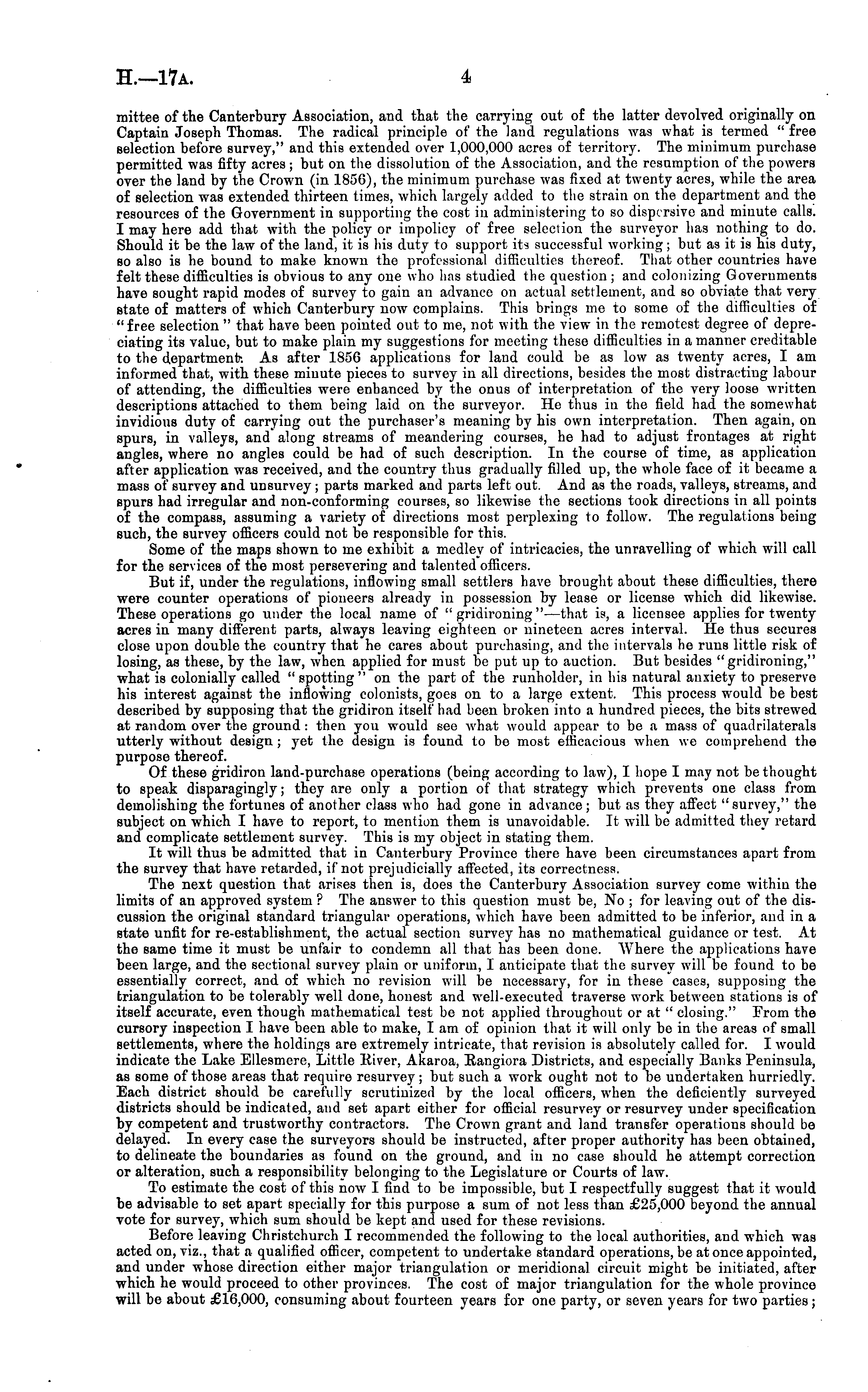 mittee of the Canterbury Association, and that the carrying out of the latter devolved originally on Captain Joseph Thomas. The radical principle of the land regulations was what is termed " free selection before survey," and this extended over 1,000,000 acres of territory. The minimum purchase permitted was fifty acres; but on the dissolution of the Association, and the resumption of the powers over the land by the Crown (in 1856), the minimum purchase was fixed at twenty acres, while the area of selection was extended thirteen times, which largely added to the strain on the department and the resources of the Government in supporting the cost in administering to so dispersive and minute calls. I may here add that with the policy or impolicy of free selection the surveyor has nothing to do. Should it be the law of the land, it is his duty to support its successful working; but as it is his duty, so also is he bound to make known the professional difficulties thereof. That other countries have felt these difficulties is obvious to any one who has studied the question; and colonizing Governments have sought rapid modes of survey to gain an advance on actual settlement, and so obviate that very state of matters of which Canterbury now complains. This brings me to some of the difficulties of " free selection " that have been pointed out to me, not with the view in the remotest degree of depreciating its value, but to make plain my suggestions for meeting these difficulties in a manner creditable to the department-. As after 1856 applications for land could be as low as twenty acres, I am informed that, with these minute pieces to survey in all directions, besides the most distracting labour of attending, the difficulties were enhanced by the onus of interpretation of the very loose written descriptions attached to them being laid on the surveyor. He thus in the field had the somewhat invidious duty of carrying out the purchaser's meaning by his own interpretation. Then again, on spurs, in valleys, and along streams of meandering courses, he had to adjust frontages at right angles, where no angles could be had of such description. In the course of time, as application after application was received, and the country thus gradually filled up, the whole face of it became a mass of survey and unsurvey; parts marked and parts left out. And as the roads, valleys, streams, and spurs had irregular and non-conforming courses, so likewise the sections took directions in all points of the compass, assuming a variety of directions most perplexing to follow. The regulations being such, the survey officers could not be responsible for this. Some of the maps shown to me exhibit a medley of intricacies, the unravelling of which will call for the services of the most persevering and talented officers. But if, under the regulations, inflowing small settlers have brought about these difficulties, there were counter operations of pioneers already in possession by lease or license which did likewise. These operations go under the local name of " gridironing " —that is, a licensee applies for twenty acres in many different parts, always leaving eighteen or nineteen acres interval. He thus secures close upon double the country that he cares about purchasing, and the intervals he runs little risk of losing, as these, by the law, when applied for must be put up to auction. But besides "gridironing," what is colonially called " spotting" on the part of the runholder, in his natural anxiety to preserve his interest against the inflowing colonists, goes on to a large extent. This process would be best described by supposing that the gridiron itself had been broken into a hundred pieces, the bits strewed at random over the ground : then you would see what would appear to be a mass of quadrilaterals utterly without design ; yet the design is found to be most efficacious when we comprehend the purpose thereof. Of these gridiron land-purchase operations (being according to law), I hope I may not be thought to speak disparagingly; they are only a portion of that strategy which prevents one class from demolishing the fortunes of another class who had gone in advance; but as they affect "survey," the subject on which I have to report, to mention them is unavoidable. It will be admitted they retard and complicate settlement survey. This is my object in stating them. It will thus be admitted that in Canterbury Province there have been circumstances apart from the survey that have retarded, if not prejudicially affected, its correctness. The next question that arises then is, does the Canterbury Association survey come within the limits of an approved system ? The answer to this question must be, No ; for leaving out of the discussion the original standard triangular operations, which have been admitted to be inferior, and in a state unfit for re-establishment, tho actual section survey has no mathematical guidance or test. At the same time it must be unfair to condemn all that has been done. Where the applications have been large, and the sectional survey plain or uniform, I anticipate that the survey will be found to be essentially correct, and of which no revision will be necessary, for in these cases, supposing the triangulation to be tolerably well done, honest and well-executed traverse work between stations is of itself accurate, even though mathematical test be not applied throughout or at " closing." From the cursory inspection I have been able to make, I am of opinion that it will only be in the areas of small settlements, where the holdings are extremely intricate, that revision is absolutely called for. I would indicate the Lake Ellesmcre, Little Eiver, Akaroa, Eangiora Districts, and especially Banks Peninsula, as some of those areas that require resurvey; but such a work ought not to be undertaken hurriedly. Each district should be carefully scrutinized by the local officers, when the deficiently surveyed distric