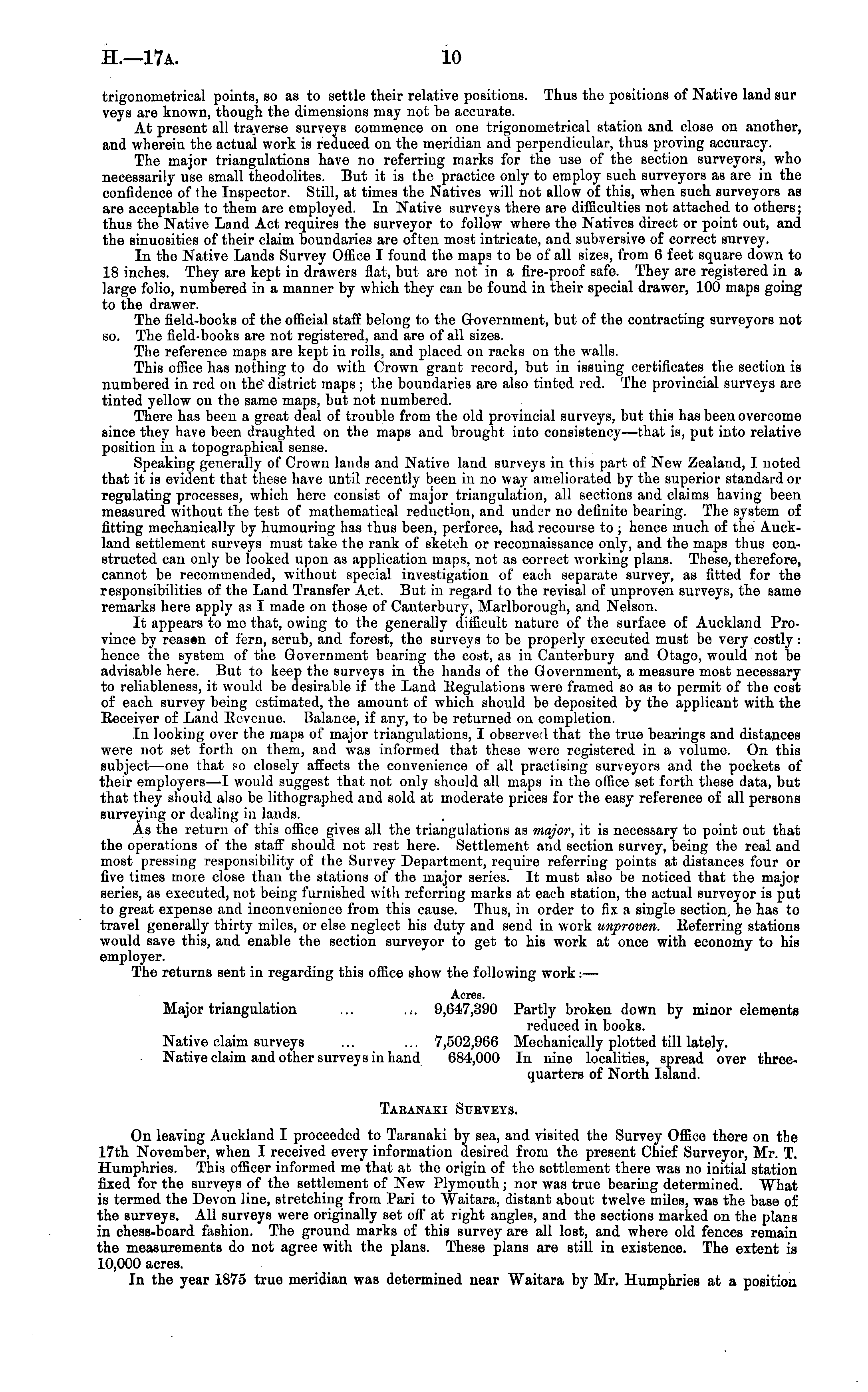 trigonometrical points, so as to settle their relative positions. Thus the positions of Native land sur veys are known, though the dimensions may not be accurate. At present all traverse surveys commence on one trigonometrical station and close on another, and wherein the actual work is reduced on the meridian and perpendicular, thus proving accuracy. The major triangulations have no referring marks for the use of the section surveyors, who necessarily use small theodolites. But it is the practice only to employ such surveyors as are in the confidence of the Inspector. Still, at times the Natives will not allow of this, when such surveyors as are acceptable to them are employed. In Native surveys there are difficulties not attached to others; thus the Native Land Act requires the surveyor to follow where the Natives direct or point out, and the sinuosities of their claim boundaries are often most intricate, and subversive of correct survey. In the Native Lands Survey Office I found the maps to be of all sizes, from 6 feet square down to 18 inches. They are kept in drawers flat, but are not in a fire-proof safe. They are registered in a large folio, numbered in a manner by which they can be found in their special drawer, 100 maps going to the drawer. The field-books of the official staff belong to the Government, but of the contracting surveyors not so. The field-books are not registered, and are of all sizes. The reference maps are kept in rolls, and placed on racks on the walls. This office has nothing to do with Crown grant record, but in issuing certificates the section is numbered in red on the~ district maps ; the boundaries are also tinted red. The provincial surveys are tinted yellow on the same maps, but not numbered. There has been a great deal of trouble from the old provincial surveys, but this has been overcome since they have been draughted on the maps and brought into consistency—that is, put into relative position in a topographical sense. Speaking generally of Crown lands and Native land surveys in this part of New Zealand, I noted that it is evident that these have until recently been in no way ameliorated by the superior standard or regulating processes, which here consist of major triangulation, all sections and claims having been measured without the test of mathematical reduction, and under no definite bearing. The system of fitting mechanically by humouring has thus been, perforce, had recourse to ; hence much of the Auckland settlement surveys must take the rank of sketch or reconnaissance only, and the maps thus constructed can only be looked upon as application maps, not as correct working plans. These, therefore, cannot be recommended, without special investigation of each separate survey, as fitted for the responsibilities of the Land Transfer Act. But in regard to the revisal of unproven surveys, the same remarks here apply as I made on those of Canterbury, Marlborough, and Nelson. It appears to me that, owing to the generally difficult nature of the surface of Auckland Province by reasen of fern, scrub, and forest, the surveys to be properly executed must be very costly: hence the system of the Government bearing the cost, as in Canterbury and Otago, would not be advisable here. But to keep the surveys in the hands of the Government, a measure most necessary to reliableness, it would be desirable if the Land Begulations were framed so as to permit of the cost of each survey being estimated, the amount of which should be deposited by the applicant with the Eeceiver of Land Eevenue. Balance, if any, to be returned on completion. In looking over the maps of major triangulations, I observed that the true bearings and distances were not set forth on them, and was informed that these were registered in a volume. On this subject —one that so closely affects the convenience of all practising surveyors and the pockets of their employers—l would suggest that not only should all maps in the office set forth these data, but that they should also be lithographed and sold at moderate prices for the easy reference of all persons surveying or dealing in lands. As the return of this office gives all the triangulations as major, it is necessary to point out that the operations of the staff should not rest here. Settlement and section survey, being the real and most pressing responsibility of the Survey Department, require referring points at distances four or five times more close than the stations of the major series. It must also be noticed that the major series, as executed, not being furnished with referring marks at each station, the actual surveyor is put to great expense and inconvenience from this cause. Thus, in order to fix a single section, he has to travel generally thirty miles, or else neglect his duty and send in work unproven. Eeferring stations would save this, and enable the section surveyor to get to his work at once with economy to his employer. The returns sent in regarding this office show the following work: — Acres. Major triangulation ... .... 9,647,390 Partly broken down by minor elements reduced in books. Native claim surveys ... ... 7,502,966 Mechanically plotted till lately. Native claim and other surveys in hand 684,000 In nine localities, spread over threequarters of North Island. Taranaki Sueveys. On leaving Auckland I proceeded to Taranaki by sea, and visited the Survey Office there on the 17th November, when I received every information desired from the present Chief Surveyor, Mr. T. Humphries. This officer informed me that at the origin of the settlement there was no initial station fixed for the surveys of the settlement of New Plymouth ; nor was true bearing determined. What is termed the Devon line, stretching from Pari to Waitara, distant about twelve miles, was the base of the surveys. All surveys were originally set off at right angles, and the sections marked on the plans in chess-board fashion. The ground marks of this survey 