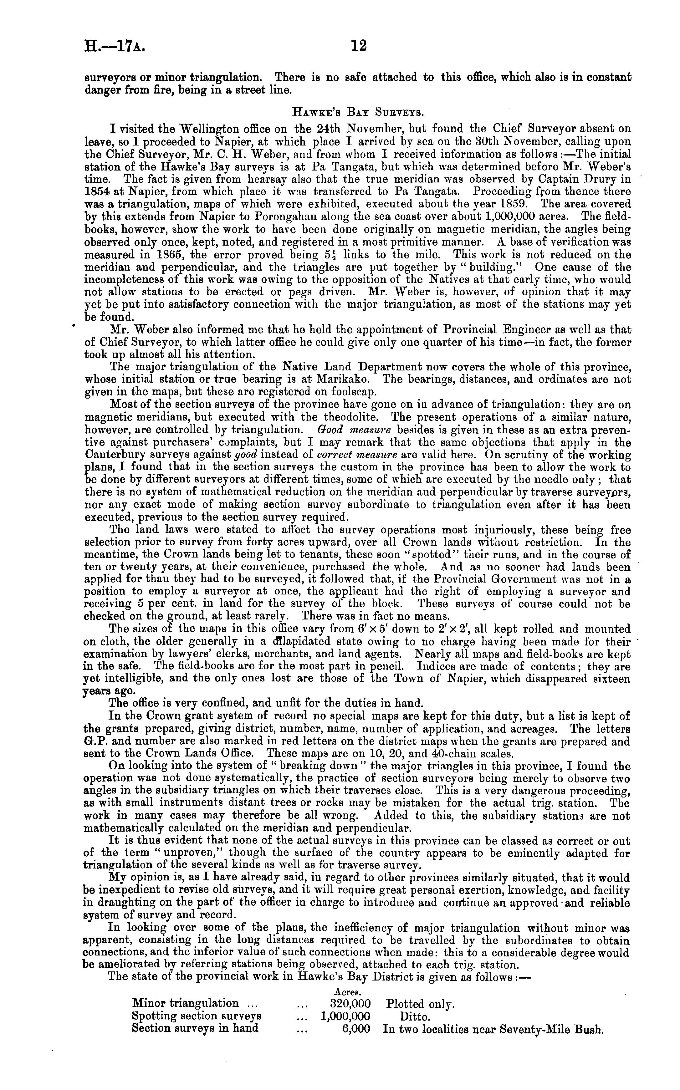 surveyors or minor triangulation. There is no safe attached to this office, which also is in constant danger from fire, being in a street line. Hawke's Bay Sueveyb. I visited the Wellington office on the 24th November, but found the Chief Surveyor absent on leave, so I proceeded to Napier, at which place I arrived by sea on the 30th November, calling upon the Chief Surveyor, Mr. C. H. Weber, and from whom I received information as follows : —The initial station of the Hawke's Bay surveys is at Pa Tangata, but which was determined before Mr. Weber's time. The fact is given from hearsay also that the true meridian was observed by Captain Drury in 1854 at Napier, from which place it was transferred to Pa Tangata. Proceeding from thence there was a triangulation, maps of which were exhibited, executed about tho year 1859. The area covered by this extends from Napier to Porongahau along the sea coast over about 1,000,000 acres. The fieldbooks, however, show the work to have been done originally on magnetic meridian, the angles being observed only once, kept, noted, and registered in a most primitive manner. A base of verification was measured in 1865, the error proved being &$ links to the mile. This work is not reduced on the meridian and perpendicular, and the triangles are put together by " building." One cause of the incompleteness of this work was owing to the opposition of the Natives at that early time, who would not allow stations to be erected or pegs driven. Mr. Weber is, however, of opinion that it may yet be put into satisfactory connection with the major triangulation, as most of the stations may yet be found. Mr. Weber also informed me that he held the appointment of Provincial Engineer as well as that of Chief Surveyor, to which latter office he could give only one quarter of his time—in fact, the former took up almost all his attention. The major triangulation of the Native Land Department now covers the whole of this province, whoso initial station or true bearing is at Marikako. The bearings, distances, and ordinates are not given in the maps, but these are registered on foolscap. Most of the section surveys of the province have gone on in advance of triangulation: they are on magnetic meridians, but executed with the theodolite. The present operations of a similar nature, how rever, are controlled by triangulation. Good measure besides is given in these as an extra preventive against purchasers' omplaints, but I may remark that the same objections that apply in the Canterbury surveys against good instead of correct measure are valid here. On scrutiny of the working plans, I found that in the section surveys the custom in the province has been to allow the work to be done by different surveyors at different times, some of which are executed by the needle only ; that there is no system of mathematical reduction on the meridian and perpendicular by traverse surveyors, nor any exact mode of making section survey subordinate to triangulation even after it has been executed, previous to the section survey required. The land laws were stated to affect the survey operations most injuriously, these being free selection prior to survey from forty acres upward, over all Crown lands without restriction. In the meantime, the Crown lands being let to tenants, these soon "spotted" their runs, and in the course of ten or tw-enty years, at their convenience, purchased the whole. And as no sooner had lands been applied for than they had to be surveyed, it followed that, if the Provincial Government was not in a position to employ a surveyor at once, the applicant had the right of employing a surveyor and receiving 5 per cent, in land for the survey of the block. These surveys of course could not be checked on the ground, at least rarely. There was in fact no means. The sizes of the maps in this office vary from 6'X 5' down to 2'x2', all kept rolled and mounted on cloth, the older generally in a dilapidated state owing to no charge having been made for their examination by lawyers' clerks, merchants, and land agents. Nearly all maps and field-books are kept in the safe. The field-books are for the most part in pencil. Indices are made of contents ; they are yet intelligible, and the only ones lost are those of the Town of Napier, which disappeared sixteen years ago. The office is very confined, and unfit for the duties in hand. In the Crown grant system of record no special maps are kept for this duty, but a list is kept of the grants prepared, giving district, number, name, number of application, and acreages. The letters G.P. and number are also marked in red letters on the district maps when the grants are prepared and sent to the Crown Lands Office. These maps are on 10, 20, and 40-chain scales. On looking into the system, of " breaking down " the major triangles in this province, I found the operation was not done systematically, the practice of section surveyors being merely to observe two angles in the subsidiary triangles on which their traverses close. This is a very dangerous proceeding, as with small instruments distant trees or rocks may be mistaken for the actual trig, station. The work in many cases may therefore be all wrong. Added to this, the subsidiary stations are not mathematically calculated on the meridian and perpendicular. It is thus evident that none of the actual surveys in this province can be classed as correct or out of the term " unproven," though the surface of the country appears to be eminently adapted for triangulation of the several kinds as well as for traverse survey. My opinion is, as I have already said, in regard to other provinces similarly situated, that it would be inexpedient to revise old surveys, and it will require great personal exertion, knowledge, and facility in draughting on the part of the officer in charge to introduce and continue an approved - and reliable system of survey and record. In looking over some of the plans, the inefficien