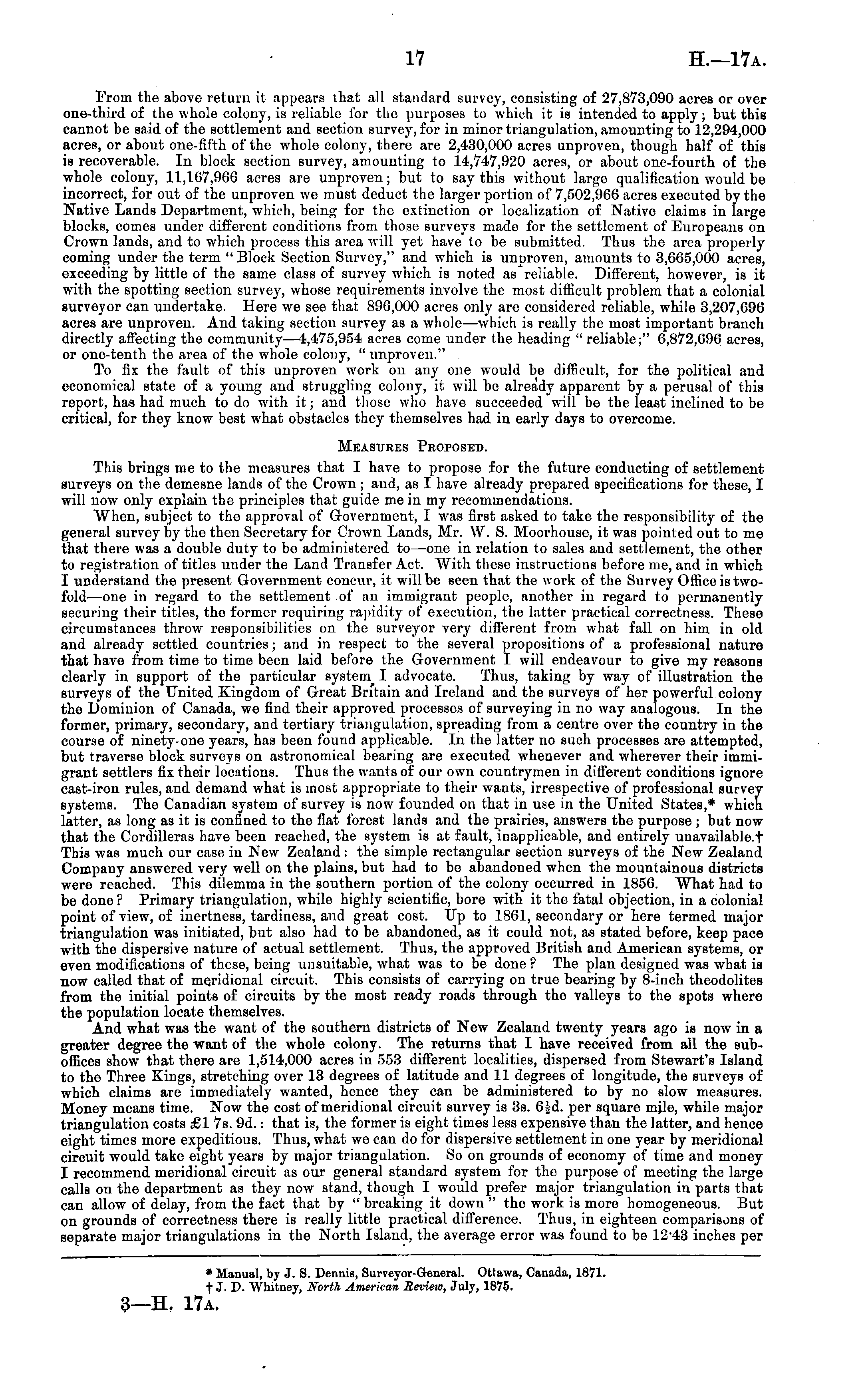 From the above return it appears that all standard survey, consisting of 27,873,090 acres or over one-third of the whole colony, is reliable for tho purposes to which it is intended to apply; but this cannot be said of the settlement and section survey, for in minor triangulation, amounting to 12,294,000 acres, or about one-fifth of the whole colony, there are 2,430,000 acres unproven, though half of this is recoverable. In block section survey, amounting to 14,747,920 acres, or about one-fourth of the whole colony, 11,167,966 acres are unproven; but to say this without large qualification would be incorrect, for out of the unproven we must deduct the larger portion of 7,502,966 acres executed by the Native Lands Department, which, being for the extinction or localization of Native claims in large blocks, comes tinder different conditions from those surveys made for the settlement of Europeans on Crown lands, and to which process this area will yet have to be submitted. Thus the area properly coming under the term " Block Section Survey," and which is unproven, amounts to 3,665,000 acres, exceeding by little of the same class of survey which is noted as reliable. Different, however, is it with the spotting section survey, whose requirements involve the most difficult problem that a colonial surveyor can undertake. Here we see that 896,000 acres only are considered reliable, while 3,207,096 acres are unproven. And taking section survey as a whole—which is really tho most important branch directly affecting tho community —4,475,954 acres come under the heading " reliable;" 6,872,696 acres, or one-tenth the area of the whole colony, " unproven." To fix the fault of this unproven work on any one would be difficult, for the political aud economical state of a young and struggling colony, it will be already apparent by a perusal of this report, has had much to do with it; and those who have succeeded will be the least inclined to be critical, for they know best what obstacles they themselves had iv early days to overcome. Measures Proposed. This brings me to the measures that I have to propose for the future conducting of settlement surveys on the demesne lands of the Crown; and, as I have already prepared specifications for these, I will now only explain the principles that guide me in my recommendations. When, subject to the approval of Government, I was first asked to take the responsibility of the general survey by the then Secretary for Crown Lands, Mr. W. S. Moorhouse, it was pointed out to me that there was a double duty to be administered to —one in relation to sales and settlement, the other to registration of titles under the Land Transfer Act. With these instructions before me, and in which I understand the present Government concur, it will be seen that the work of the Survey Office is twofold —one in regard to the settlement of an immigrant people, another in regard to permanently securing their titles, the former requiring rapidity of execution, the latter practical correctness. These circumstances throw responsibilities on the surveyor very different from what fall on him in old and already settled countries; and in respect to the several propositions of a professional nature that have from time to time been laid before the Government I will endeavour to give my reasons clearly in support of the particular system I advocate. Thus, taking by way of illustration the surveys of the United Kingdom of Great Britain and Ireland and the surveys of her powerful colony the Dominion of Canada, we find their approved processes of surveying in no way analogous. In the former, primary, secondary, and tertiary triangulation, spreading from a centre over the country in the course of ninety-one years, has been found applicable. In the latter no such processes are attempted, but traverse block surveys on astronomical bearing are executed whenever and wherever their immigrant settlers fix their locations. Thus the wants of our own countrymen in different conditions ignore cast-iron rules, and demand what is most appropriate to their wants, irrespective of professional survey systems. The Canadian system of survey is now founded on that in use in the United States,* which latter, as long as it is confined to the flat forest lands and the prairies, answers the purpose ; but now that the Cordilleras have been reached, the system is at fault, inapplicable, and entirely unavailable, f This was much our case in New Zealand: tho simple rectangular section surveys of the New Zealand Company answered very well on the plains, but had to be abandoned when the mountainous districts were reached. This dilemma in the southern portion of the colony occurred in 1856. What had to be done ? Primary triangulation, while highly scientific, bore with it the fatal objection, in a colonial point of view, of inertness, tardiness, and great cost. Up to 1861, secondary or here termed major triangulation was initiated, but also had to be abandoned, as it could not, as stated before, keep pace with the dispersive nature of actual settlement. Thus, the approved British and American systems, or even modifications of these, being unsuitable, what was to be done? The plan designed was what is now called that of meridional circuit. This consists of carrying on true bearing by 8-inch theodolites from the initial points of circuits by the most ready roads through the valleys to the spots where the population locate themselves. And what was the want of the southern districts of New Zealand twenty years ago is now in a greater degree the want of the whole colony. The returns that I have received from all the suboffices show that there are 1,514,000 acres in 553 different localities, dispersed from Stewart's Island to the Three Kings, stretching over 13 degrees of latitude and 11 degrees of longitude, the surveys of which claims are immediately wanted, hence they can be administered to by no slow measures. Money means time. N