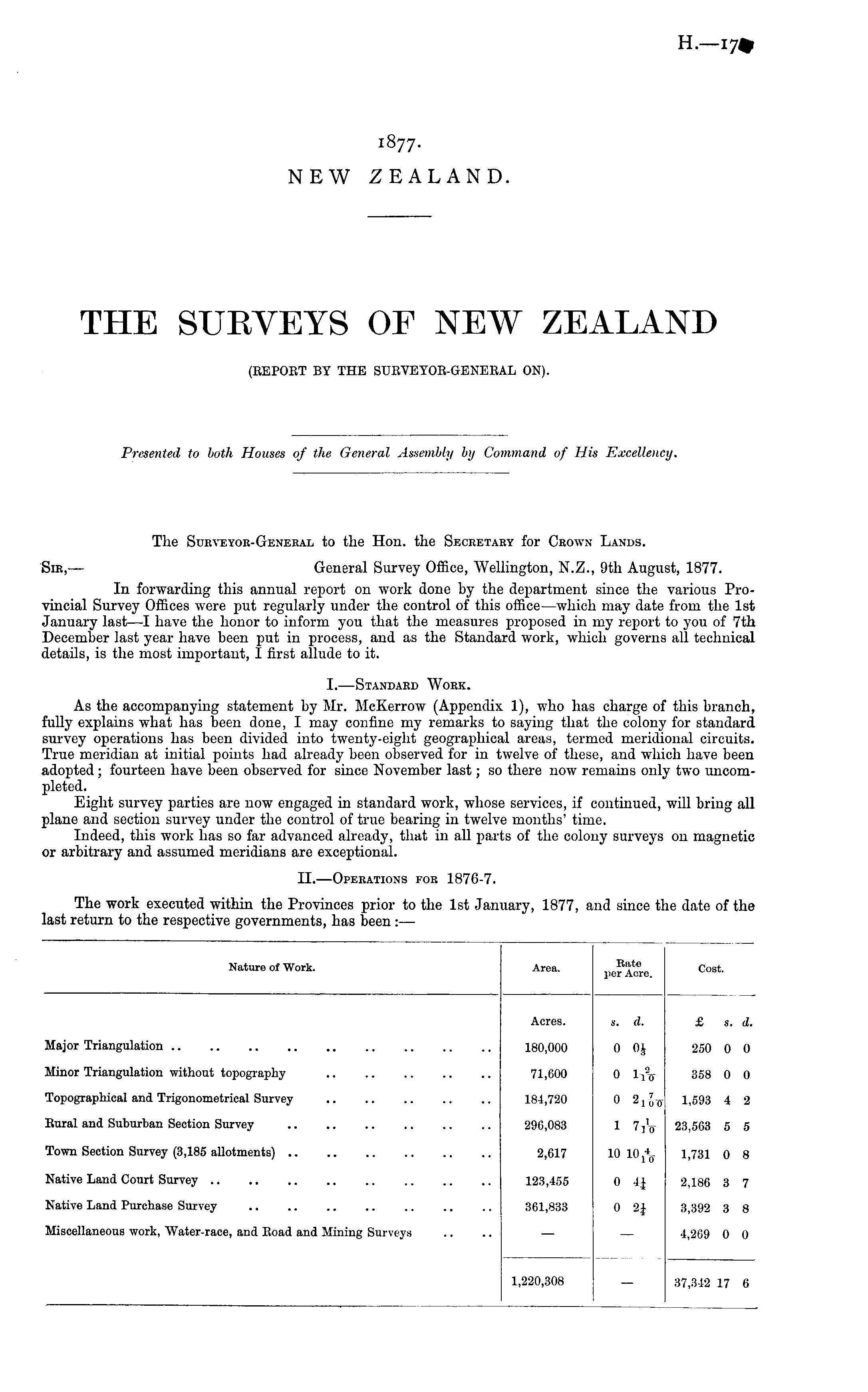 The Surveyor-General to the Hon. the Secretary for Crown Lands. Sir,— General Survey Office, Wellington, N.Z., 9th August, 1877. In forwarding this annual report on work done by the department since the various Provincial Survey Offices were put regularly under the control of this office—which may date from the Ist January last—l have the honor to inform you that the measures proposed in my report to you of 7th December last year have been put in process, and as the Standard work, which governs all technical details, is the most important, I first allude to it. I.—Standard Work. As the accompanying statement by Mr. McKerrow (Appendix 1), who has charge of this branch, fully explains what has been done, I may confine my remarks to saying that the colony for standard survey operations has been divided into twenty-eight geographical areas, termed meridional circuits. True meridian at initial points had already been observed for in twelve of these, and which have been adopted; fourteen have been observed for since November last; so there now remains only two uncompleted. Eight survey parties are now engaged in standard work, whose services, if continued, will bring all plane and section survey under the control of true bearing in twelve months' time. Indeed, this work has so far advanced already, that in all parts of the colony surveys on magnetic or arbitrary and assumed meridians are exceptional. ll.—Operations for 1870-7. The work executed within the Provinces prior to the Ist January, 1877, and since the date of the last return to the respective governments, has been : —