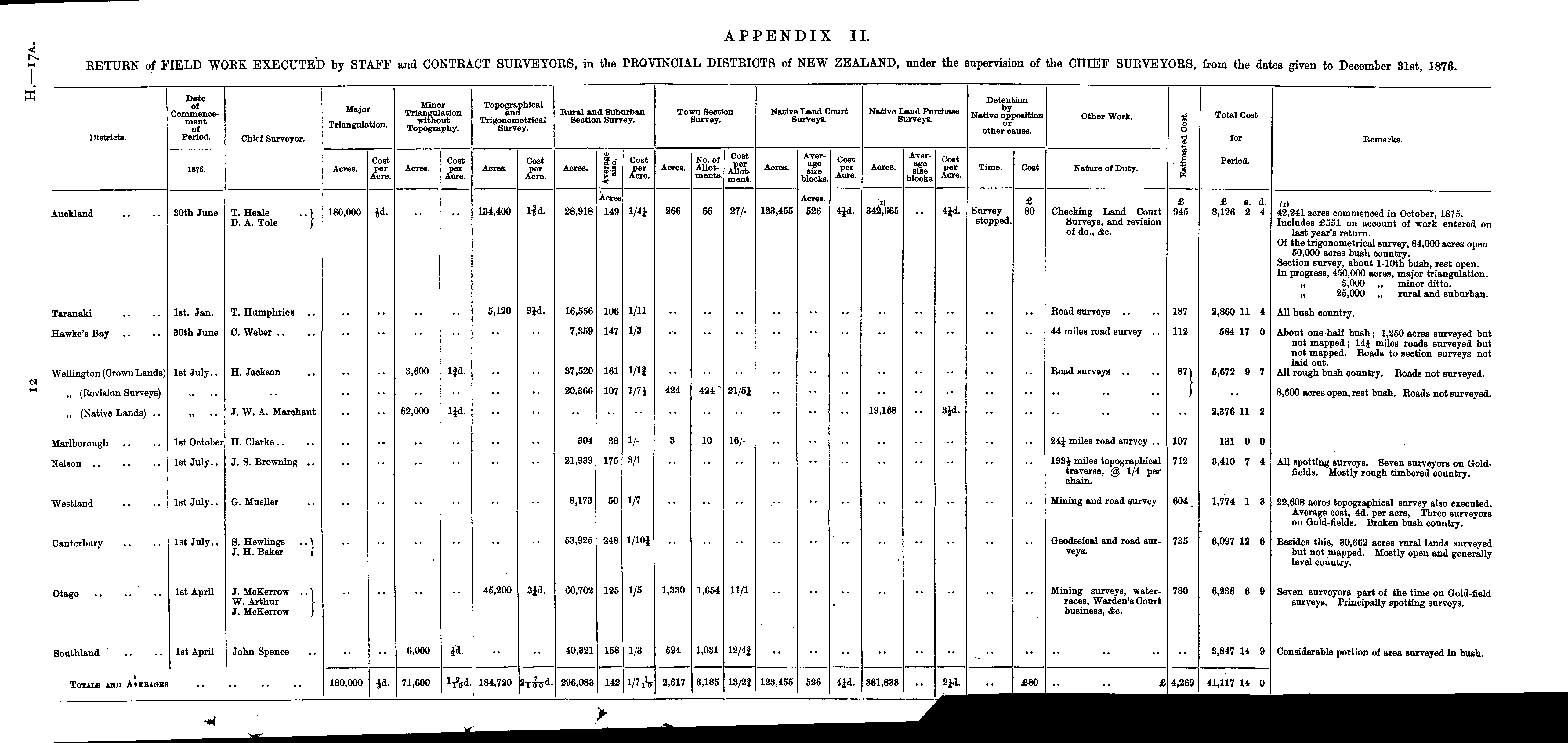 APPENDIX II. RETURN of FIELD WORE EXECUTED by STAFF and CONTRACT SURVEYORS, in the PROVINCIAL DISTRICTS of NEW ZEALAND, under the supervision of the CHIEF SURVEYORS, from the dates given to December 31st, 1876.