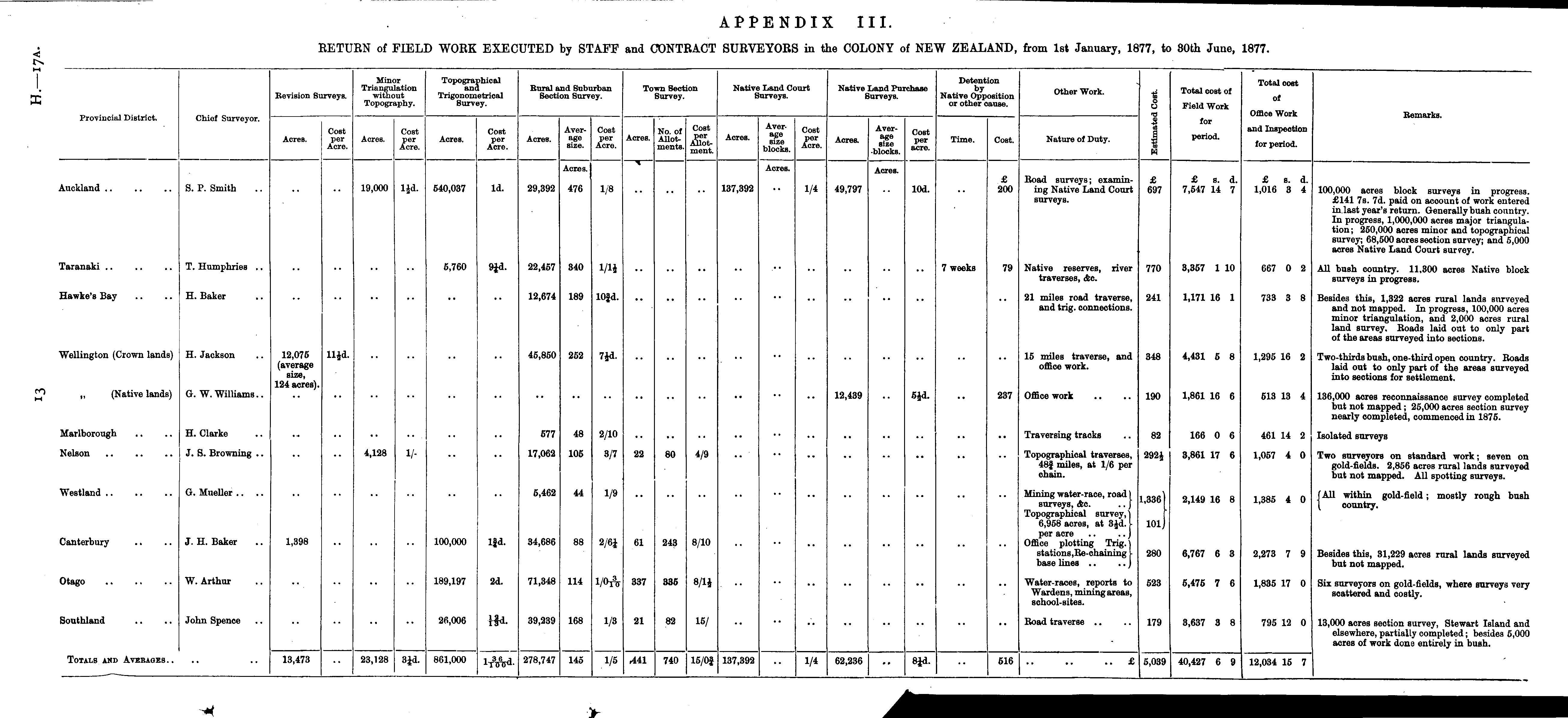 APPENDIX III. RETURN of FIELD WORK EXECUTED by STAFF and CONTRACT SUEVEYORS in the COLONY of NEW ZEALAND, from 1st January, 1877, to 30th June, 1877.