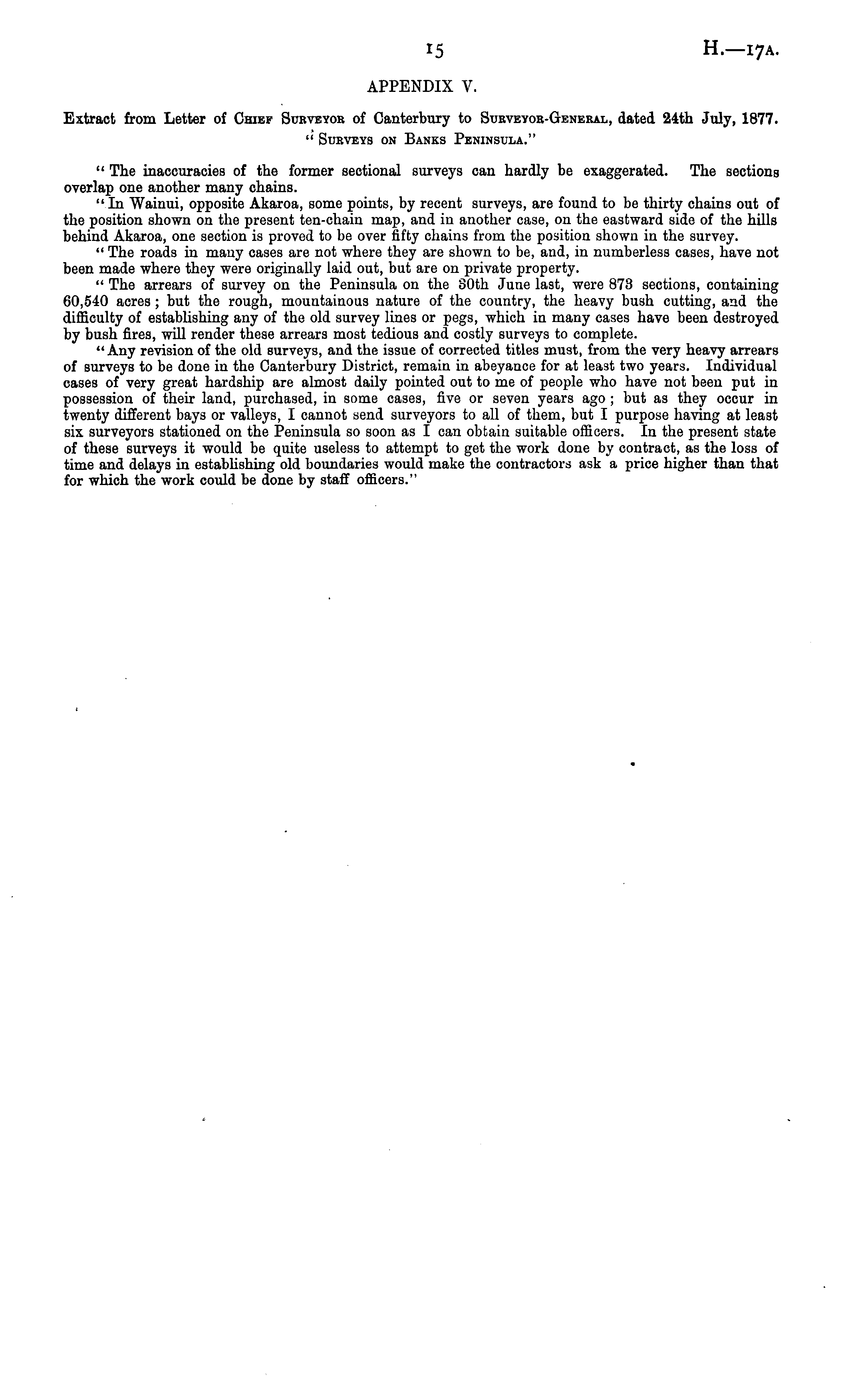 APPENDIX V. Extract from Letter of Chief Surveyor of Canterbury to Surveyor-General, dated 24th July, 1877. " Surveys on Banks Peninsula." " The inaccuracies of the former sectional surveys can hardly be exaggerated. The sections overlap one another many chains. "In Wainui, opposite Akaroa, some points, by recent surveys, are found to be thirty chains out of the position shown on the present ten-chain map, and iv another case, on the eastward side of the hills behind Akaroa, one section is proved to be over fifty chains from the position shown in the survey. " The roads in many cases are not where they are shown to bo, and, in numberless cases, have not been made where they were originally laid out, but are on private property. " The arrears of survey on the Peninsula on the 80th June last, were 873 sections, containing 60,540 acres ; but the rough, mountainous nature of the country, the heavy bush cutting, and the difficulty of establishing any of the old survey lines or pegs, which in many cases have been destroyed by bush fires, will render these arrears most tedious and costly surveys to complete. "Any revision of the old surveys, and the issue of corrected titles must, from the very heavy arrears of surveys to be done in the Canterbury District, remain in abeyance for at least two years. Individual cases of very great hardship are almost daily pointed out to me of people who have not been put in possession of their land, purchased, in some cases, five or seven years ago ; but as they occur in twenty different bays or valleys, I cannot send surveyors to all of them, but I purpose having at least six surveyors stationed on the Peninsula so soon as I can obtain suitable officers. In the present state of these surveys it would be quite useless to attempt to get the work done by contract, as the loss of time and delays in establishing old boundaries would make the contractors ask a price higher than that for which the work could be done by staff officers."