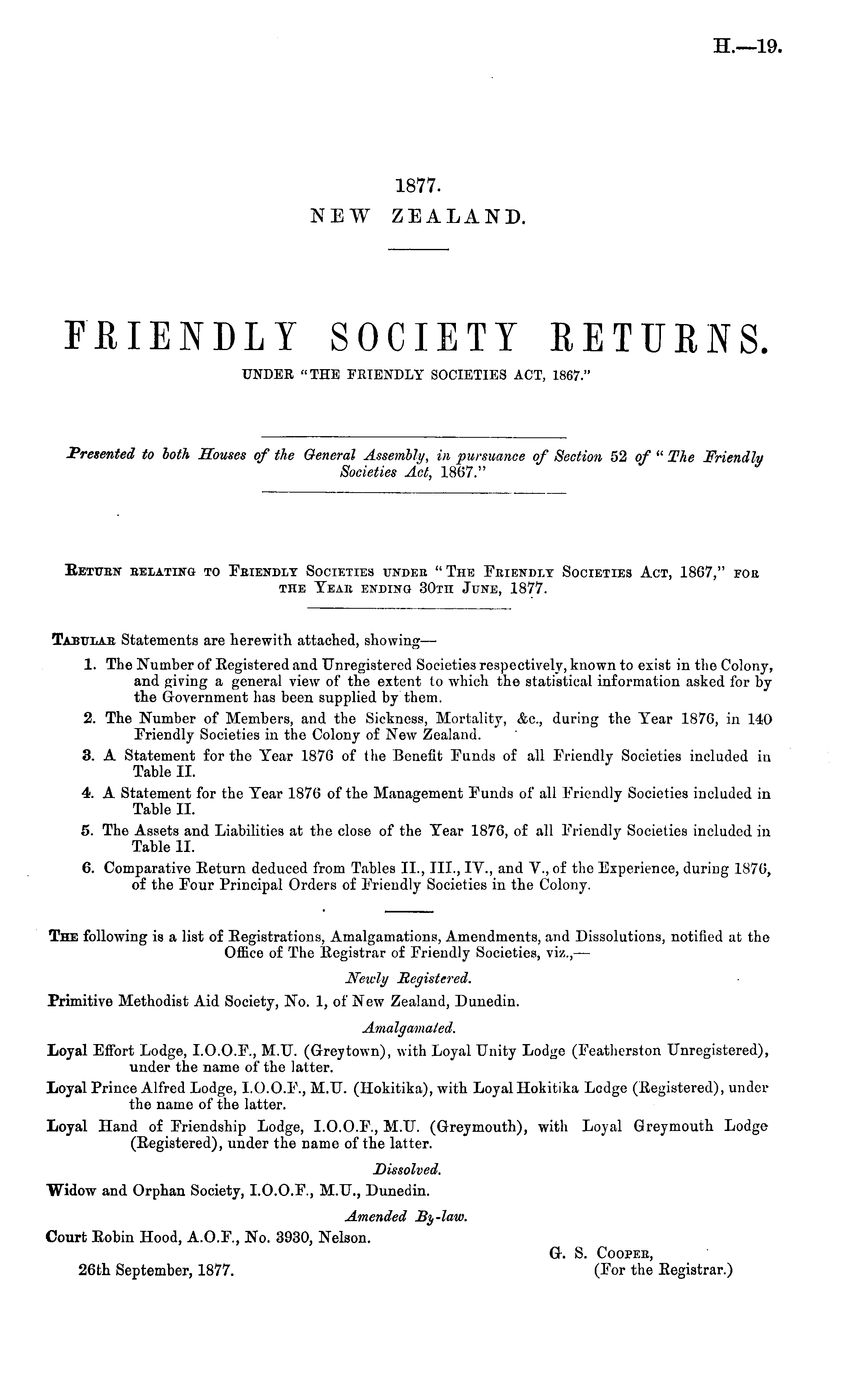 The following is a list of Registrations, Amalgamations, Amendments, and Dissolutions, notified at the Office of The Registrar of Friendly Societies, viz., — Newly Registered. Primitive Methodist Aid Society, No. 1, of New Zealand, Dunedin. Amalgamated. Loyal Effort Lodge, 1.0.0. F., M.U. (Greytown), with Loyal Unity Lodge (Featherston Unregistered), under the name of the latter. Loyal Prince Alfred Lodge, 1.0.0. F., M.U. (Hokitika), with Loyal Hokitika Ledge (Registered), under the name of the latter. Loyal Hand of Friendship Lodge, 1.0.0. F., M.U. (Greymouth), with Loyal Greymouth Lodge (Registered), under the name of the latter. Dissolved. Widow and Orphan Society, 1.0.0. F., M.U., Dunedin. Amended By-law. Court Robin Hood, A.0.F., No. 3930, Nelson. G. S. Cooper, 26th September, 1877. (For the Registrar.)
