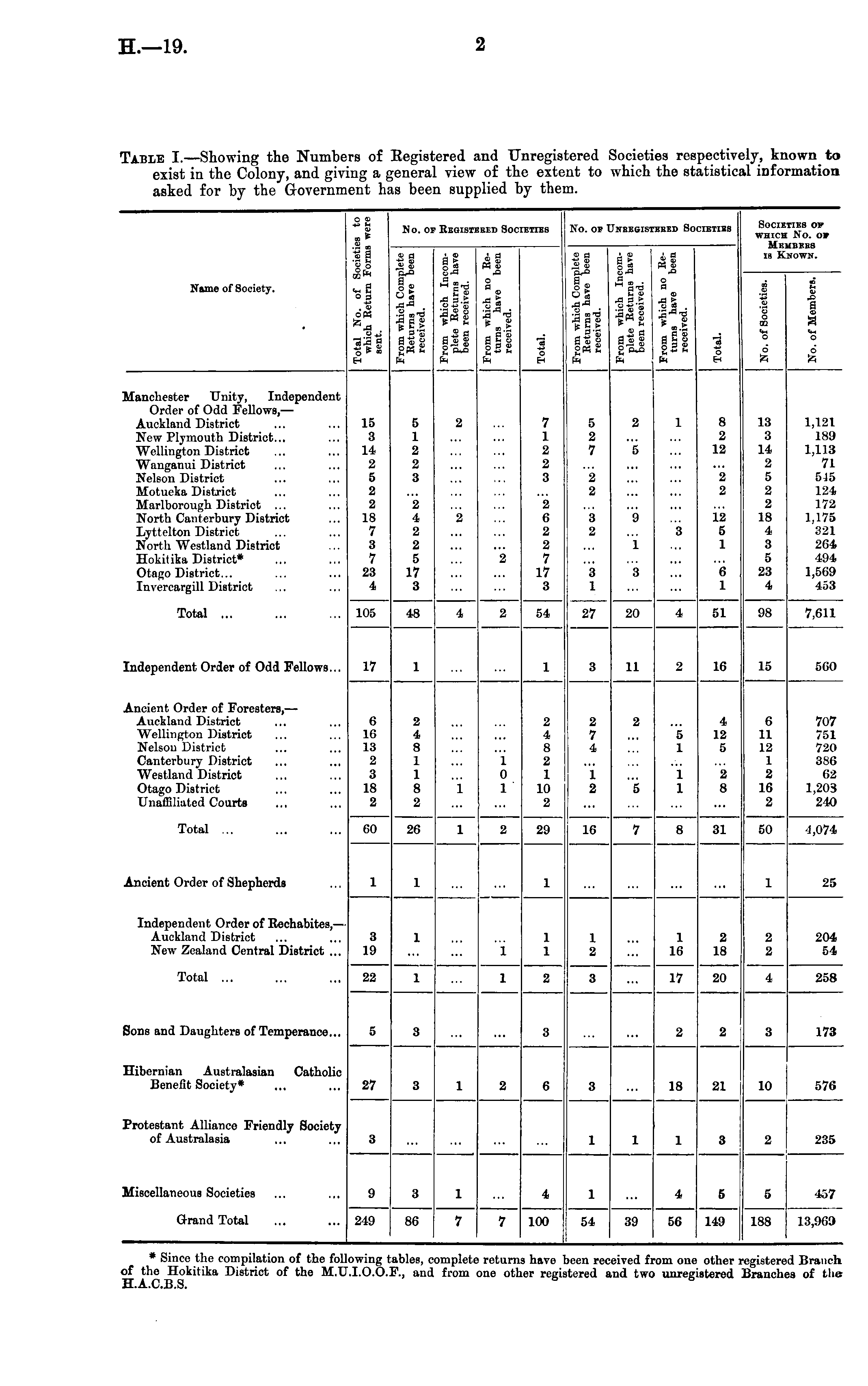 * Since the compilation of the following tables, complete returns have been received from one other registered Branch of the Hokitika District of the M.U.I.O.O.F., and from one other registered and two unregistered Branches of tliu H.A.C.B.S.
