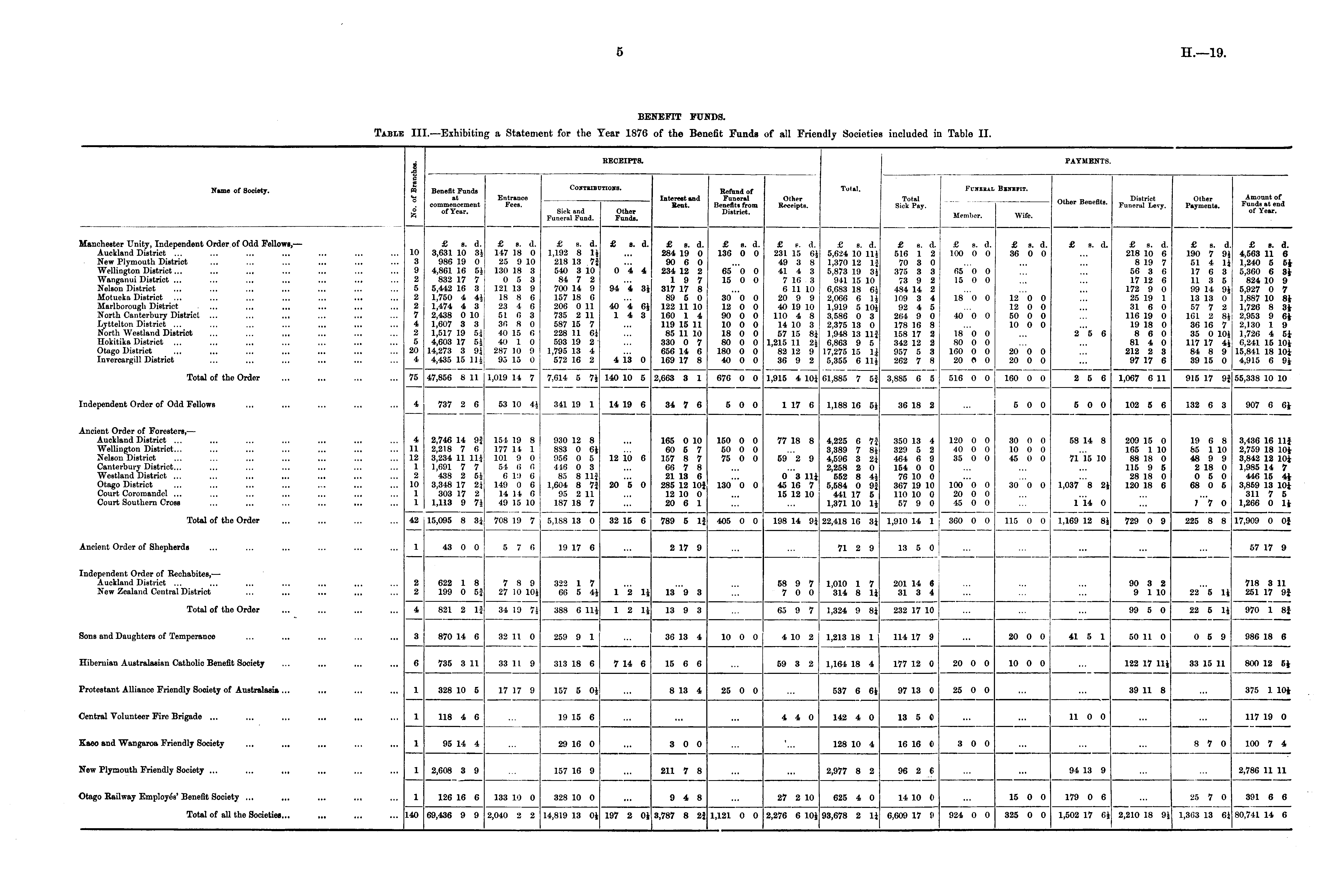 BENEFIT FUNDS. TABLE III.—Exhibiting a Statement for the Year 1876 of the Benefit Funds of all Friendly Societies included in Table II.