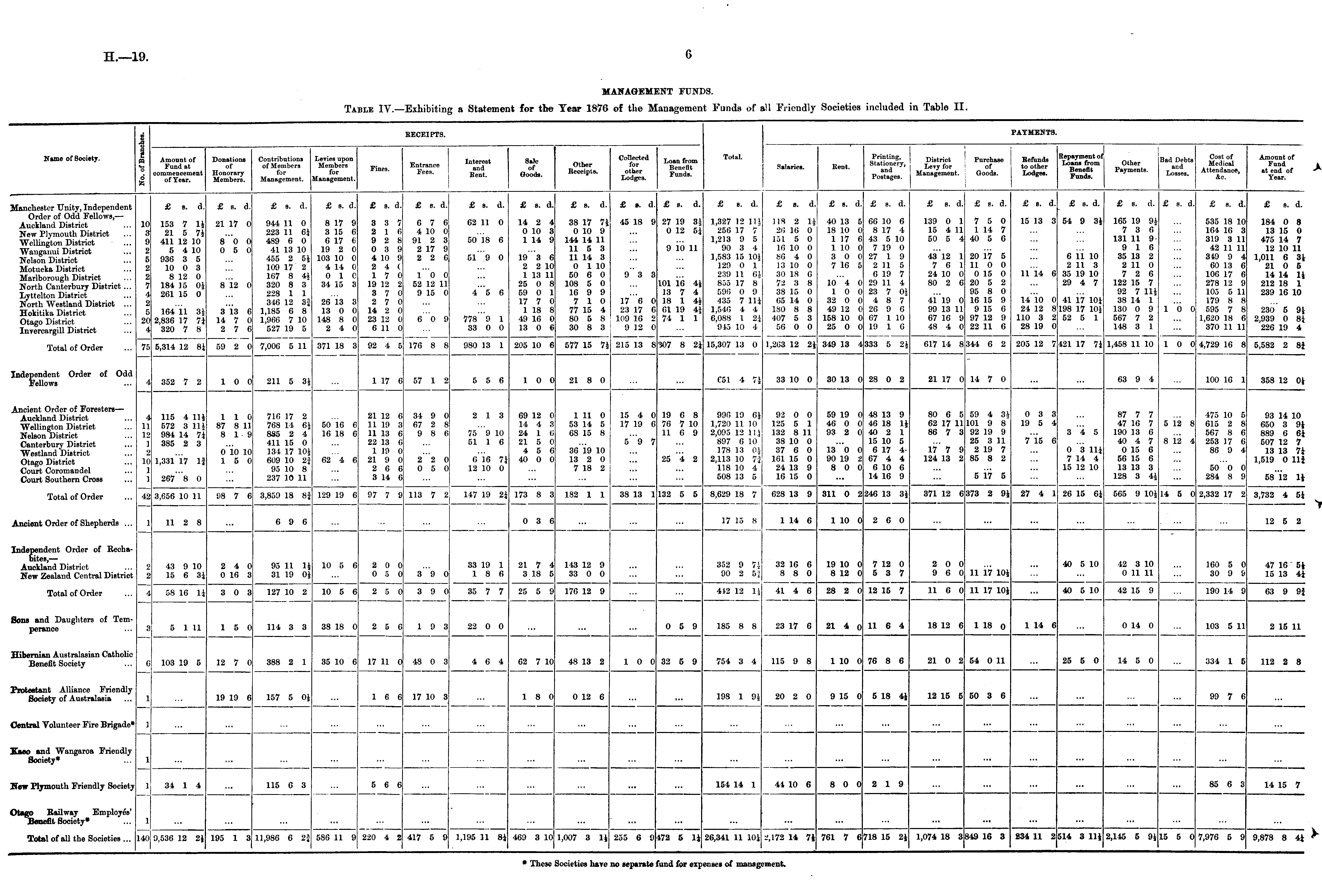 RECEIPTS. •AYMENTS. Name of Society. & Amount of Fund at commencement of Year. Donations of Honorary Members. Contributions of Members for Management. Levies upon Members for Management. Interest and Bent. Sale of Goods. Collected for other lodges. Loan from Benefit Funds. Total. Rent. Podges. Management. ; Goods. Refunds to other Lodges. Repayment ol Loans from Benefit Funds. Bad Debts and Losses. Cost of Medical Attendance. &c. Amount of Fund at end of Year. Fines. Entrance Fees. Other Receipts. Salaries. Other Payments. Manchester Unity, Independent Order of Odd Fellows, — Auckland District New Plymouth District Wellington District Wanganui District Nelson District Mot ucka District Marlborough District North Canterbury District... Lyttelton District North Westland District ... Hokitika District Otago District Invercargill D istrict £ b. d. £ s. d. £ 8. d. £ 8. d. £ s. d. £ s. d. £ s. d. £ s. d. £ s. d. £ ». d. £ s. d. £ s. d. £ s. d. £ s. d. £ s. d. £ s. d. £ s. d. £ e. d. £ s. d. £ s. (1. £ s. d. £ s. d. £ 8. d. 10 !> 2 5 2 2 7 153 7 li 21 5 7i 411 12 10 5 4 10 936 3 5 10 0 3 8 12 0 184 15 01 261 15 0 21 17 0 8*0 0 0 5 0 944 11 0 223 11 6i 489 6 0 41 13 10 455 2 51 109 17 2 167 8 41 320 8 3 228 1 1 346 12 3J 1,185 6 8 1,966 7 10 527 19 5 8 17 9 3 15 6 6 17 6 19 2 0 103 10 0 4 14 0 0 10 34 15 3 3 3 7 2 16 9 2 8 0 3 9 4 10 9 2 4 ( 17 0 19 12 2 3 7 0 2 7 0 14 2 0 23 12 0 6 11 0 6 7 6 4 10 0 91 2 3 2 17 9 2 2 6 10 0 52 12 11 9 15 0 62 11 0 50 18 6 51 '9 0 14 2 4 0 10 3 1 14 9 19 3 6 2 2 10 1 13 11 25 0 8 59 0 1 17 7 0 1 18 8 49 16 0 13 0 6 38 17 71 0 10 9 144 14 11 11 5 3 11 14 3 0 1 10 50 6 0 108 5 0 16 9 9 7 10 77 15 4 80 5 8 30 8 3 45 18 9 9 3 3 27 19 3i 0 12 5i 9 10 11 1,327 12 111 256 17 7 1,213 9 5 90 3 4 1,583 15 10.} 129 0 1 239 11 6.V 855 17 8 596 0 9 435 7 Hi 1,546 4 4 6,088 1 2ri 945 10 4 MS 2 li 86 16 0 151 5 0 16 10 0 86 4 0 13 10 0 30 18 G 72 3 8 38 15 0 Co 14 0 ISO 8 8 407 5 3 56 0 0 40 13 5 18 10 0 1 17 6 1 10 0 3 0 0 7 16 5 66 10 6 8 17 4 43 5 10 7 19 0 27 1 9 2 11 5 6 19 7 29 11 4 23 7 01 4 8 7 26 9 6 67 1 10 19 1 6 139 0 1 15 4 11 50 5 4 43 12 1 7 6 1 24 10 0 80 2 6 7 5 0 1 14 7 40 5 6 20 17 5 11 0 0 0 15 0 20 5 2 95 8 0 16 15 9 9 15 6 97 12 9 22 11 6 15 13 3 11 14 6 54 9 31 6 11 10 2 11 3 35 19 10 29 4 7 165 19 91 7 3 6 131 11 99 16 35 13 2 2 11 0 7 2 6 122 15 7 92 7 Hi 38 14 1 130 0 9 567 7 2 148 3 1 535 18 10 164 16 3 319 3 11 42 11 11 319 9 4 60 13 6 106 17 6 278 12 9 105 5 11 179 8 8 595 7 8 1,620 18 6 370 11 11 184 0 8 13 15 0 475 14 7 12 10 11 1,011 6 31 21 0 5 14 14 11 212 18 1 239 16 10 2 6 20 164 11 31 2,836 17 7i 320 7 8 8 12 0 3 13 6 14 7 0 2 7 6 26 13 3 13 0 0 148 8 0 2 4 0 4"5 6 17 6 0 23 17 6 109 16 2 9 12 0 101 16 41 13 7 4 18 1 4i 01 19 41 74 1 1 10 4 0 10 0 32 0 0 49 12 0 158 10 0 25 0 0 41 19 0 99 13 11 67 16 9 48 4 0 14 10 0 24 12 8 110 3 2 28 19 0 41 17 10i 198 17 10i 52 5 1 10 0 230 5 91 2,939 0 8i 226 19 4 6 0 9 778"9 1 33 0 0 Total of Order 7,006 5 11 371 18 3 92 4 5 176 8 8 980 13 1 205 10 6 577 15 71 215 13 8 307 8 2i 15,307 13 0 1,203 12 2i 349 13 4 333 5 21 617 14 8 344 6 2 205 12 7 421 17 7i 1,458 11 10 10 0 4,729 16 8 5,582 2 8J 75 5,314 12 8i 59 2 0 Independent Order of Odd Fellows 352 7 2 10 0 211 5 31 1 17 6 57 1 2 5 5 6 10 0 21 8 0 C51 4 71 33 10 0 30 13 0 28 0 2 21 17 0 14 7 0 63 9 4 100 16 1 358 12 01 Ancient Order of Foresters — Auckland District Wellington District Nelson District Canterbury District Westland District Otago District Court Coromandel Court Southern Cross 11 12 1 p 10 1 1 115 4 11* 572 3 Hi 984 14 7i 385 2 3 110 87 8 11 8 19 0 10 10 15 0 716 17 2 768 14 6i 885 2 4 411 15 0 134 17 101 609 10 2£ 95 10 8 237 10 11 50 16 6 16 18 6 21 12 6 11 19 3 11 13 6 22 13 6 1 19 0 21 9 0 2 6 6 3 14 6 34 9 0 67 2 8 9 8 6 2 13 75 9 10 51 1 6 69 12 0 14 4 8 24 1 6 21 5 0 4 5 6 40 0 0 1 11 0 53 14 5 68 15 8 36 19 10 13 2 0 7 18 2 15 4 0 17 19 6 5'"9 7 19 6 8 76 7 10 11 6 9 990 19 6| 1,720 11 10 2,095 12 Hi 897 6 10 178 13 0% 2,113 10 7i 118 10 4 508 13 5 92 0 0 125 5 1 132 8 11 38 10 0 37 6 0 161 15 0 24 13 9 16 15 0 59 19 0 46 0 0 93 2 0 13 0 0 90 19 2 8 0 0 48 13 9 46 18 11 40 2 1 15 10 5 6 17 467 4 4 6 10 6 14 16 9 80 6 5 62 17 H 86 7 3 17 7 9 124 13 2 59 4 3i 101 9 8 92 19 9 25 3 11 2 19 7 85 8 2 0 3 3 19 5 4 7 15 6 3 4 5 0 3 Hi 7 14 4 15 12 10 87 7 7 47 16 7 190 13 6 40 4 7 0 15 6 56 15 6 13 13 3 128 3 4i 5 12 8 8 12 4 475 10 5 615 2 8 567 8 6 253 17 6 86 9 4 93 14 10 650 3 91 889 6 6i 507 12 7 13 13 7i 1,519 0 llf 1,331 17 IS 62 4 6 2"2 0 0 5 0 8 16 71 12 10 0 25 "4 2 50 0 0 284 8 9 267 8 0 5 17 5 68*12 It Total of Order 42 3,056 10 11 98 7 6 3,859 18 8} 129 19 6 97 7 9 113 7 2 147 19 2i 173 8 3 182 1 1 38 13 1 132 5 5 8,629 18 7 628 13 9 311 0 246 13 31 371 12 6 373 2 9i 27 4 1 26 15 6* 565 9 10i 14 5 0 2,332 17 2 3,732 4 5i Ancient Order of Shepherds ... 11 2 8 6 9 6 0 3 17 15 8 1 14 6 1 10 2 6 0 12 5 2 Independent Order of Rechabites, — Auckland District New Zealand Central District n a 43 9 10 15 6 3i 2 4 0 0 16 3 95 11 li 31 19 01 10 5 6 2 0 0 0 5 0 3 9 0 33 19 1 18 6 21 7 4 3 18 5 143 12 9 33 0 0 352 9 7J 90 2 5] 32 16 6 8 8 0 19 10 0 8 12 0 7 12 0 5 3 7 2 0 0 9 6 0 11 17 101 40 5 10 42 3 10 0 11 11 160 5 0 30 9 6 47 16 5i 15 13 4i Total of Order 4 58 16 1± 3 0 3 127 10 2 10 5 6 2 5 3 9 35 7 7 25 5 9 176 12 9 412 12 1J 41 4 6 28 2 0 12 15 7 11 6 0 11 17 101 40 5 10 42 15 9 190 14 9 63 9 9i Sons and Daughters of Temperance 38 18 0 2 5 6 1 9 3 22 0 0 0 5 9 185 8 8 23 17 6 21 4 o 11 6 4 18 12 6 1 18 0 1 14 6 0 14 0 103 5 11 2 15 11 q 5 1 11 1 5 0 114 3 3 Hibernian Australasian Catholic Benefit Society 103 19 5 12 7 0 388 2 1 35 10 6 17 11 48 0 3 4 6 4 62 7 10 48 13 2 10 0 32 5 9 754 3 4 115 9 8 1 10 0 76 8 6 21 0 2 54 0 11 25 5 0 14 5 0 334 1 5 112 2 8 Protestant Alliance Friendly Society of Australasia 19 19 6 157 5 01 16 6 17 10 3 18 0 0 12 6 198 1 9J 20 2 0 9 15 0 5 18 41 12 15 5 50 3 6 99 7 6 Central Volunteer Fire Brigade* Kaco and Wangaroa Friendly Society* New Plymouth Friendly Society 