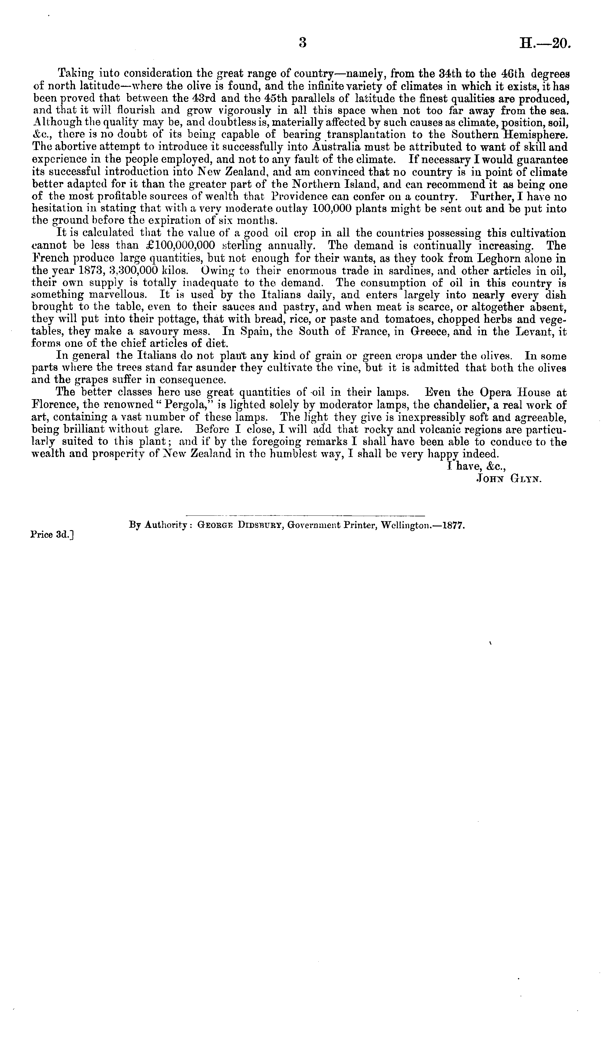 Taking into consideration the great range of country —namely, from the 34thto the 46th degrees of north latitude—where the olive is found, and the infinite variety of climates in which it exists, it has been proved that between the 43rd and the 45th parallels of latitude the finest qualities are produced, and that it will flourish and grow vigorously in all this space when not too far away from the sea. A lthough the quality may be, and doubtless is, materially affected by such causes as climate, position, soil, &c, there is no doubt of its being capable of bearing transplantation to the Southern Hemisphere. The abortive attempt to introduce it successfully into Australia must be attributed to want of skill and experience in the people employed, and not to any fault of the climate. If necessary I would guarantee its successful introduction into New Zealand, and am convinced that no country is in point of climate better adapted for it than the greater part of the Northern Island, and can recommend it as being one of the most profitable sources of wealth that Providence can confer on a country. Further, I have no hesitation in stating that with a very moderate outlay 100,000 plants might be sent out and be put into the ground hefore the expiration of six months. It is calculated that the value of a good oil crop in all the countries possessing this cultivation cannot be less than £100,000,000 sterling annually. The demand is continually increasing. The French produce large quantities, but not enough for their wants, as they took from Leghorn alone in the year 1873, 3,300,000 kilos. Owing to their enormous trade in sardines, and other articles in oil, their own supply is totally inadequate to the demand. The consumption of oil in this country is something marvellous. It is used by the Italians daily, and enters largely into nearly every dish brought to the table, even to their sauces and pastry, and when meat is scarce, or altogether absent, they will put into their pottage, that with bread, rice, or paste and tomatoes, chopped herbs and vegetables, they make a savoury mess. In Spain, the South of Prance, in Greece, and in the Levant, it forms one of the chief articles of diet. In general the Italians do not plant any kind of grain or green crops under the olives. In some parts where the trees stand far asunder they cultivate the vine, but it is admitted that both the olives and the grapes suffer in consequence. The better classes here use great quantities of oil in their lamps. Even the Opera House at Florence, the renowned " Pergola," is lighted solely by moderator lamps, the chandelier, a real work of art, containing a vast number of these lamps. The light they give is inexpressibly soft and agreeable, being brilliant without glare. Before I close, I will add that rocky and volcanic regions are particularly suited to this plant; and if by the foregoing remarks I shall have been able to conduce to the wealth and prosperity of New Zealand in the humblest way, I shall be very happy indeed. I have, &c, Johx Gltn.
