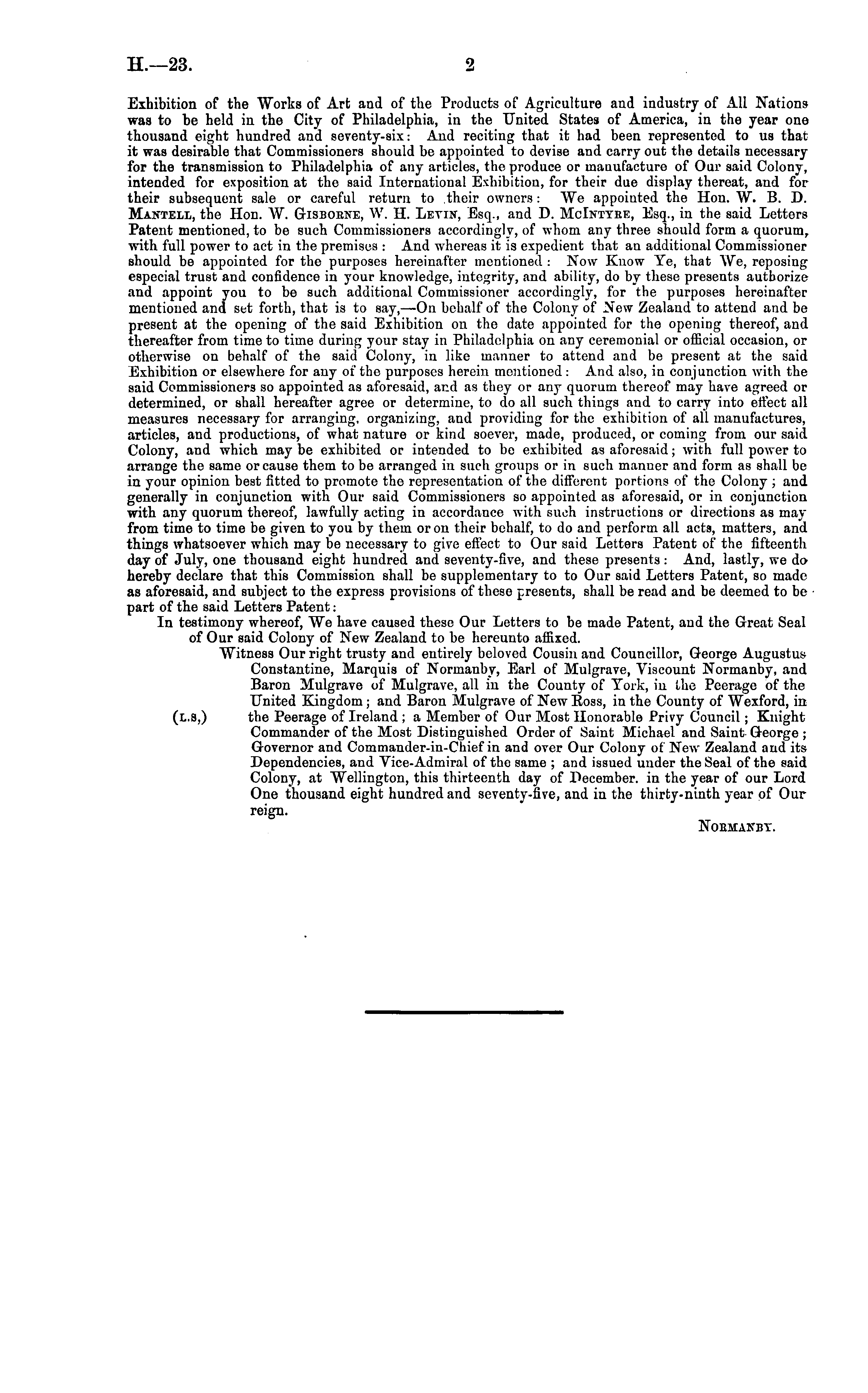 Exhibition of the Works of Art and of the Products of Agriculture and industry of All Nations was to be held in the City of Philadelphia, in the United States of America, in the year one thousand eight hundred and seventy-six: And reciting that it had been represented to us that it was desirable that Commissioners should be appointed to devise and carry out the details necessary for the transmission to Philadelphia of any articles, the produce or manufacture of Our said Colony, intended for exposition at the said International Exhibition, for their due display thereat, and for their subsequent sale or careful return to their owners: We appointed the Hon. W. B. D. Mantell, the Hon. W. Gisboene, W. H. Levin, Esq., and D. Mclntyre, Esq., in the said Letters Patent mentioned, to be such Commissioners accordingly, of whom any three should form a quorum, with full power to act in the premises : And whereas it is expedient that an additional Commissioner should be appointed for the purposes hereinafter mentioned : Now Know Te, that We, reposing especial trust and confidence in your knowledge, integrity, and ability, do by these presents authorize and appoint you to be such additional Commissioner accordingly, for the purposes hereinafter mentioned and set forth, that is to say,—On behalf of the Colony of New Zealand to attend and be present at the opening of the said Exhibition on the date appointed for the opening thereof, and thereafter from time to time during your stay in Philadelphia on any ceremonial or official occasion, or otherwise on behalf of the said Colony, in like manner to attend and be present at the said Exhibition or elsewhere for any of the purposes herein mentioned : And also, in conjunction with the said Commissioners so appointed as aforesaid, and as they or any quorum thereof may have agreed or determined, or shall hereafter agree or determine, to do all such things and to carry into effect all measures necessary for arranging, organizing, and providing for the exhibition of all manufactures, articles, and productions, of what nature or kind soever, made, produced, or coming from our said Colony, and which may be exhibited or intended to be exhibited as aforesaid; with full power to arrange the same or cause them to be arranged iu such groups or in such manner and form as shall be in your opinion best fitted to promote the representation of the different portions of the Colony ; and generally in conjunction with Our said Commissioners so appointed as aforesaid, or in conjunction with any quorum thereof, lawfully acting in accordance with such instructions or directions as may from time to time be given to you by them or on their behalf, to do and perform all acts, matters, and things whatsoever which may be necessary to give effect to Our said Letters Patent of the fifteenth day of July, one thousand eight hundred and seventy-five, and these presents: And, lastly, we do hereby declare that this Commission shall be supplementary to to Our said Letters Patent, so made as aforosaid, and subject to the express provisions of these presents, shall be read and be deemed to be part of the said Letters Patent: In testimony whereof, We have caused these Our Letters to be made Patent, and the Great Seal of Our said Colony of New Zealand to be hereunto affixed. Witness Our right trusty and entirely beloved Cousin and Councillor, George Augustus Constantine, Marquis of Normanby, Earl of Mulgrave, Viscount Normanby, and Baron Mulgrave of Mulgrave, all iu the County of York, iu tho Peerage of the United Kingdom; and Baron Mulgrave of New Boss, in the County of Wexford, in (1.5,) the Peerage of Ireland ; a Member of Our Most Honorable Privy Council; KnightCommander of the Most Distinguished Order of Saint Michael and Saint George ; Governor and Commander-in-Chief in and over Our Colony of New Zealand and its Dependencies, and Vice-Admiral of the same ; and issued under the Seal of the said Colony, at Wellington, this thirteenth day of December, in the year of our Lord One thousand eight hundred and seventy-five, and in the thirty-ninth year of Our reign. Normanby.