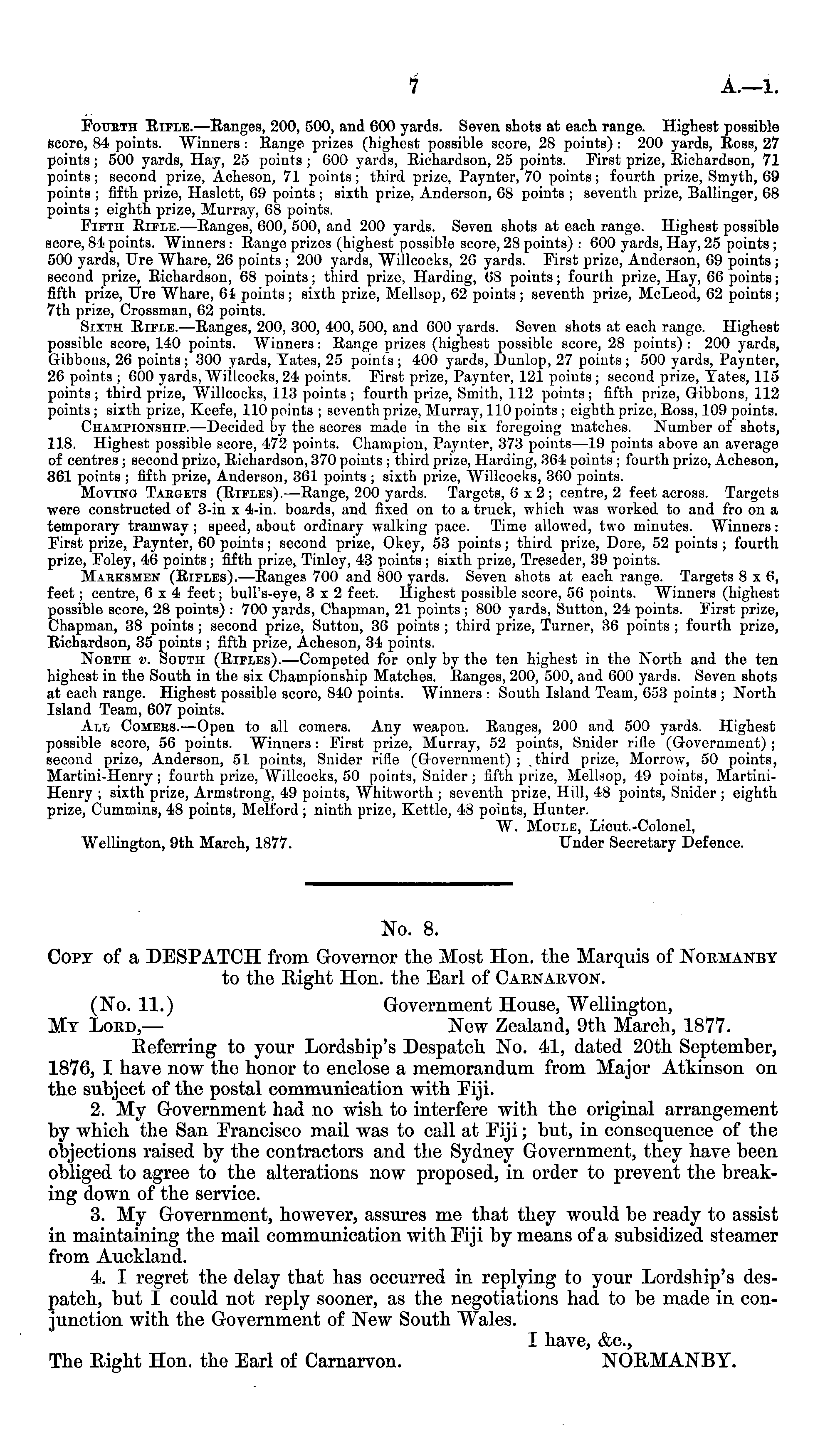 Fourth Rifle. —Ranges, 200, 500, and 600 yards. Seven shots at each range. Highest possible score, 84 points. Winners : Range prizes (highest possible score, 28 points) : 200 yards, Ross, 27 points ; 500 yards, Hay, 25 points ; 600 yards, Richardson, 25 points. First prize, Richardson, 71 points; second prize, Acheson, 71 points; third prize, Paynter, 70 points; fourth prize, Smyth, 69 points ; fifth prize, Haslett, 69 points ; sixth prize, Anderson, 68 points ; seventh prize, Ballinger, 68 points ; eighth prize, Murray, 68 points. Fifth Rifle.—Ranges, 600, 500, and 200 yards. Seven shots at each range. Highest possible score, 84 points. Winners: Range prizes (highest possible score, 28 points) : 600 yards, Hay, 25 points; 500 yards, Ure Whare, 26 points ; 200 yards, Willcocks, 26 yards. First prize, Anderson, 69 points ; second prize, Richardson, 68 points; third prize, Harding, 68 points; fourth prize, Hay, 66 points; fifth prize, Ure Whare, 61 points; sixth prize, Mellsop, 62 points; seventh prize, MeLeod, 62 points; 7th prize, Crossman, 62 points. Sixth Rifle. —Ranges, 200, 300, 400, 500, and 600 yards. Seven shots at each range. Highest possible score, 140 points. Winners: Range prizes (highest possible score, 28 points) : 200 yards, Gibbons, 26 points; 300 yards, Vates, 25 points; 400 yards, Dunlop, 27 points; 500 yards, Paynter, 26 points ; 600 yards, Willcocks, 24 points. First prize, Paynter, 121 points ; second prize, Vates, 115 points; third prize, Willcocks, 113 points ; fourth prize, Smith, 112 points; fifth prize, Gibbons, 112 points ; sixth prize, Keefe, 110 points ; seventh prize, Murray, 110 points ; eighth prize, Ross, 109 points. Championship.—Decided by the scores made in the six foregoing matches. Number of shots, 118. Highest possible score, 472 points. Champion, Paynter, 373 points —19 points above an average of centres ; second prize, Richardson, 370 points ; third prize, Harding, 364 points ; fourth prize, Acheson, 361 poiuts ; fifth prize, Anderson, 361 points ; sixth prize, Willcocks, 360 points. Moving Targets (Rifles). —Range, 200 yards. Targets, 6x2; centre, 2 feet across. Targets were constructed of 3-in x 4-in. boards, and fixed on to a truck, which was worked to and fro on a temporary tramway ; speed, about ordinary walking pace. Time allowed, two minutes. Winners: First prize, Paynter, 60 points; second prize, Okey, 53 points; third prize, Dore, 52 points ; fourth prize, Foley, 46 points ; fifth prize, Tinley, 43 points ; sixth prize, Treseder, 39 points. Marksmen (Rifles). —Ranges 700 and 800 yards. Seven shots at each range. Targets Bx6, feet; centre, 6x4 feet; bull's-eye, 3x2 feet. Highest possible score, 56 points. Winners (highest possible score, 28 points) : 700 yards, Chapman, 21 points; 800 yards, Sutton, 24 points. First prize, Chapman, 38 points ; second prize, Sutton, 36 points ; third prize, Turner, 36 points ; fourth prize, Richardson, 35 points ; fifth prize, Acheson, 34 points. Noeth v. South (Rifles). —Competed for only by the ten highest in the North and the ten highest in the South in the six Championship Matches. Ranges, 200, 500, and 600 yards. Seven shots at each range. Highest possible score, 840 points. Winners : South Island Team, 653 points ; North Island Team, 607 points. All Comers.—Open to all comers. Any weapon. Ranges, 200 and 500 yards. Highest possible score, 56 points. Winners: First prize, Murray, 52 points, Snider rifle (Government) ; second prize, Anderson, 51 points, Snider rifle (Government) ; third prize, Morrow, 50 points, Martini-Henry ; fourth prize, Willcocks, 50 points, Snider ; fifth prize, Mellsop, 49 points, MartiniHenry ; sixth prize, Armstrong, 49 points, Whitvvorth ; seventh prize, Hill, 48 points, Snider ; eighth prize, Cummins, 48 points, Melford; ninth prize, Kettle, 48 points, Hunter. W. Moule, Lieut.-Colonel, Wellington, 9th March, 1877. Under Secretary Defence.