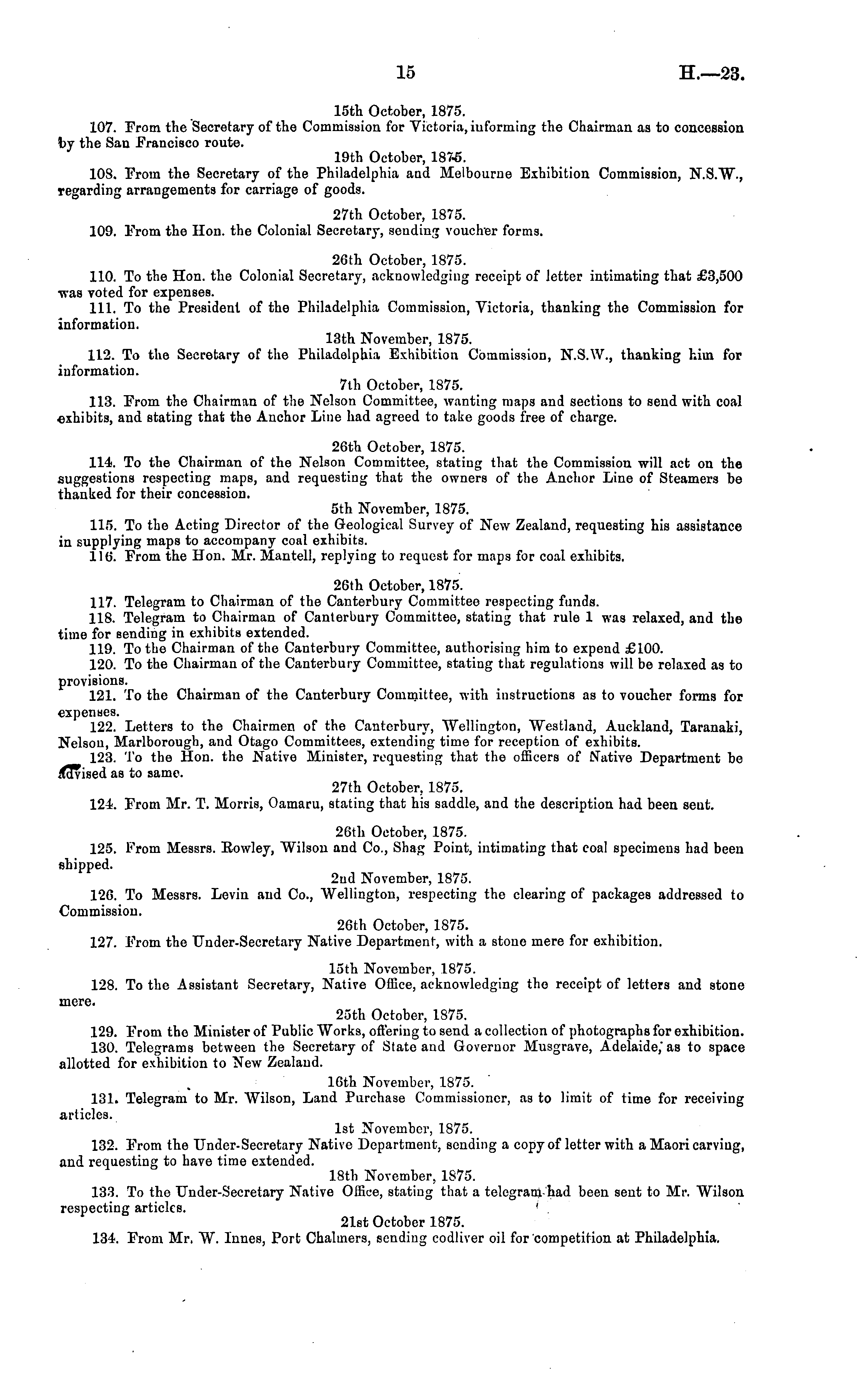 15th October, 1875. 107. From the Secretary of the Commission for Victoria, iuforming the Chairman as to concession by the San Francisco route. 19th October, 187-5. 108. From the Secretary of the Philadelphia and Melbourne Exhibition Commission, N.S.W., regarding arrangements for carriage of goods. 27th October, 1875. 109. From the Hon. the Colonial Secretary, Bending voucher forms. 26th October, 1875. 110. To the Hon. the Colonial Secretary, acknowledging receipt of letter intimating that £3,500 ■was voted for expenses. 111. To the President of the Philadelphia Commission, Victoria, thanking the Commission for information. 13th November, 1875. 112. To the Secretary of the Philadelphia Exhibition Commission, N.S.W., thanking him for information. 7th October, 1575. 113. From the Chairman of the Nelson Committee, wanting maps and sections to send with coal exhibits, and stating that the Anchor Line had agreed to take goods free of charge. 26th October, 1875. 114. To the Chairman of the Nelson Committee, stating that the Commission will act on the suggestions respecting maps, and requesting that the owners of the Anchor Line of Steamers be thanked for their concession. sth November, 1875. 115. To the Acting Director of the Geological Survey of New Zealand, requesting his assistance in supplying maps to accompany coal exhibits. 116. From the Hon. Mr. Mantel!, replying to request for maps for coal exhibits. 26th October, 1875. 117. Telegram to Chairman of the Canterbury Committee respecting funds. 118. Telegram to Chairman of Canterbury Committee, stating that rule 1 was relaxed, and the time for sending in exhibits extended. 119. To the Chairman of the Canterbury Committee, authorising him to expend £100. 120. To the Chairman of the Canterbury Committee, stating that regulations will be relaxed as to provisions. 121. To the Chairman of the Canterbury Committee, with instructions as to voucher forms for expenses. 122. Letters to the Chairmen of the Canterbury, "Wellington, Westland, Auckland, Taranaki, Nelson, Marlborough, and Otago Committees, extending time for reception of exhibits. 123. To the Hon. the Native Minister, requesting that the officers of Native Department be Advised as to same. 27th October. 1875. 124. From Mr. T. Morris, Oamaru, stating that his saddle, and the description had been sent. 26th October, 1875. 125. From Messrs. Eowley, AVilson and Co., Shag Point, intimating that coal specimens had been shipped. 2nd November, 1875. 120. To Messrs. Levin and Co., Wellington, respecting the clearing of packages addressed to Commission. 26th October, 1875. 127. From the Under-Secretary Native Department, with a stone mere for exhibition. 15th November, 1875. 128. To the Assistant Secretary, Native Office, acknowledging the receipt of letters and stone mere. 25th October, 1875. 129. From the Minister of Public "Works, offering to send a collection of photographs for exhibition. 130. Telegrams between the Secretary of State and Governor Musgrave, Adelaide,' as to space allotted for exhibition to New Zealand. 16th November, 1875. 131. Telegram to Mr. Wilson, Land Purchase Commissioner, as to limit of time for receiving articles. Ist November, 1875. 132. From the Under-Secretary Native Department, sending a copy of letter with a Maori carving, and requesting to have time extended. 18th November. 1575. 133. To the Under-Secretary Native Office, stating that a telegram had been sent to Mr. Wilson respecting articles. ' 21st October 1875. 134. From Mr. W. lnnes, Port Chalmers, sending codliver oil for competition at Philadelphia.