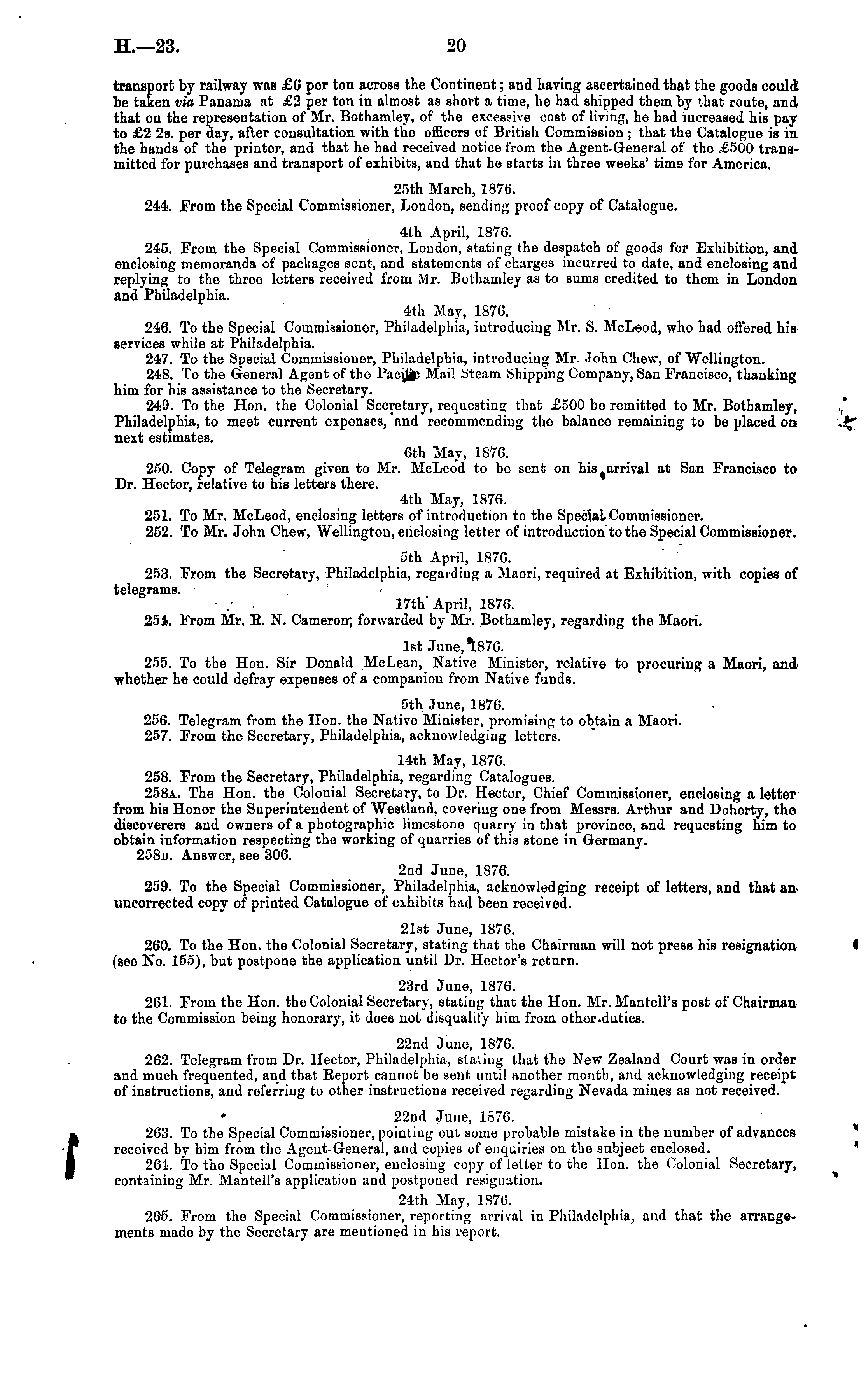 transport by railway was £6 per ton across the Continent; and Laving ascertained that the goods could be taken via Panama at £2 per ton in almost as short a time, he had shipped them by that route, and that on the representation of Mr. Bothamley, of the excessive cost of living, he had increased his pay to £2 2s. per day, after consultation with the officers of British Commission ; that the Catalogue is in the hands of the printer, and that he had received notice from the Agent-General of the £500 transmitted for purchases and transport of exhibits, and that he starts in three weeks' tims for America. 25th March, 1876. 244. From the Special Commissioner, London, sending proof copy of Catalogue. 4th April, 187G. 245. From the Special Commissioner, London, stating the despatch of goods for Exhibition, and enclosing memoranda of packages sent, and statements of charges incurred to date, and enclosing and replying to the three letters received from Mr. Bothamley as to sums credited to them in London and Philadelphia. 4th May, 1576. 246. To the Special Commissioner, Philadelphia, introducing Mr. S. McLeod, who had offered his services while at Philadelphia. 247. To the Special Commissioner, Philadelphia, introducing Mr. John Chew, of Wellington. 248. To the General Agent of the Pactfjp Mail Steam Shipping Company, San Francisco, thanking him for his assistance to the Secretary. 249. To the Hon. the Colonial Secretary, requesting that £500 be remitted to Mr. Bothamley, Philadelphia, to meet current expenses, and recommending the balance remaining to be placed on next estimates. Gth May, 1876. 250. Copy of Telegram given to Mr. McLeod to be sent on his arrival at San Francisco to Dr. Hector, relative to his letters there. 4th May, 1876. 251. To Mr. McLeod, enclosing letters of introduction to the Special Commissioner. 252. To Mr. John Chew, Wellington, enclosing letter of introduction to the Special Commissioner. sth April, 1876. 253. From the Secretary, Philadelphia, regarding a Maori, required at Exhibition, with copies of telegrams. 17th'April, 1876. 254. From Mr. E. N. Cameron; forwarded by Mr. Bothamley, regarding the Maori. Ist June,^S76. 255. To the Hon. Sir Donald McLean, Native Minister, relative to procuring a Maori, and whether he could defray expenses of a companion from Native funds. sth June, 1876. 256. Telegram from the Hon. the Native Minister, promising to obtain a Maori. 257. From the Secretary, Philadelphia, acknowledging letters. 14th May, 1876. 258. From the Secretary, Philadelphia, regarding Catalogues. 258a. The Hon. the Colonial Secretary, to Dr. Hector, Chief Commissioner, enclosing a letter from his Honor the Superintendent of Westland, covering one from Messrs. Arthur and Doherty, the discoverers and owners of a photographic limestone quarry in that province, and requesting him to obtain information respecting the working of quarries of this stone in Germany. 258b. Answer, see 306. 2nd June, 1876. 259. To the Special Commissioner, Philadelphia, acknowledging receipt of letters, and that an uncorrected copy of printed Catalogue of exhibits had been received. 21st June, 1876. 260. To the Hon. the Colonial Secretary, stating that the Chairman will not press his resignation (see No. 155), but postpone the application until Dr. Hector's return. 23rd June, 1876. 261. From the Hon. the Colonial Secretary, stating that the Hon. Mr. Mantell's post of Chairman to the Commission being honorary, it does not disqualify him from other.duties. 22nd June, 1876. 262. Telegram from Dr. Hector, Philadelphia, stating that the New Zealand Court was in order and much frequented, and that Keport cannot be sent until another mouth, and acknowledging receipt of instructions, and referring to other instructions received regarding Nevada mines as not received. 22nd June, 1576. 263. To the Special Commissioner, pointing out some probable mistake in the number of advances received by him from the Agent-General, and copies of enquiries on the subject enclosed. 264. To the Special Commissioner, enclosing copy of letter to the Hon. the Colonial Secretary, containing Mr. Mantell's application and postponed resignation. 24th May, 1876. 2GNS. From the Special Commissioner, reporting arrival in Philadelphia, and that the arrangements made by the Secretary are mentioned in his report.