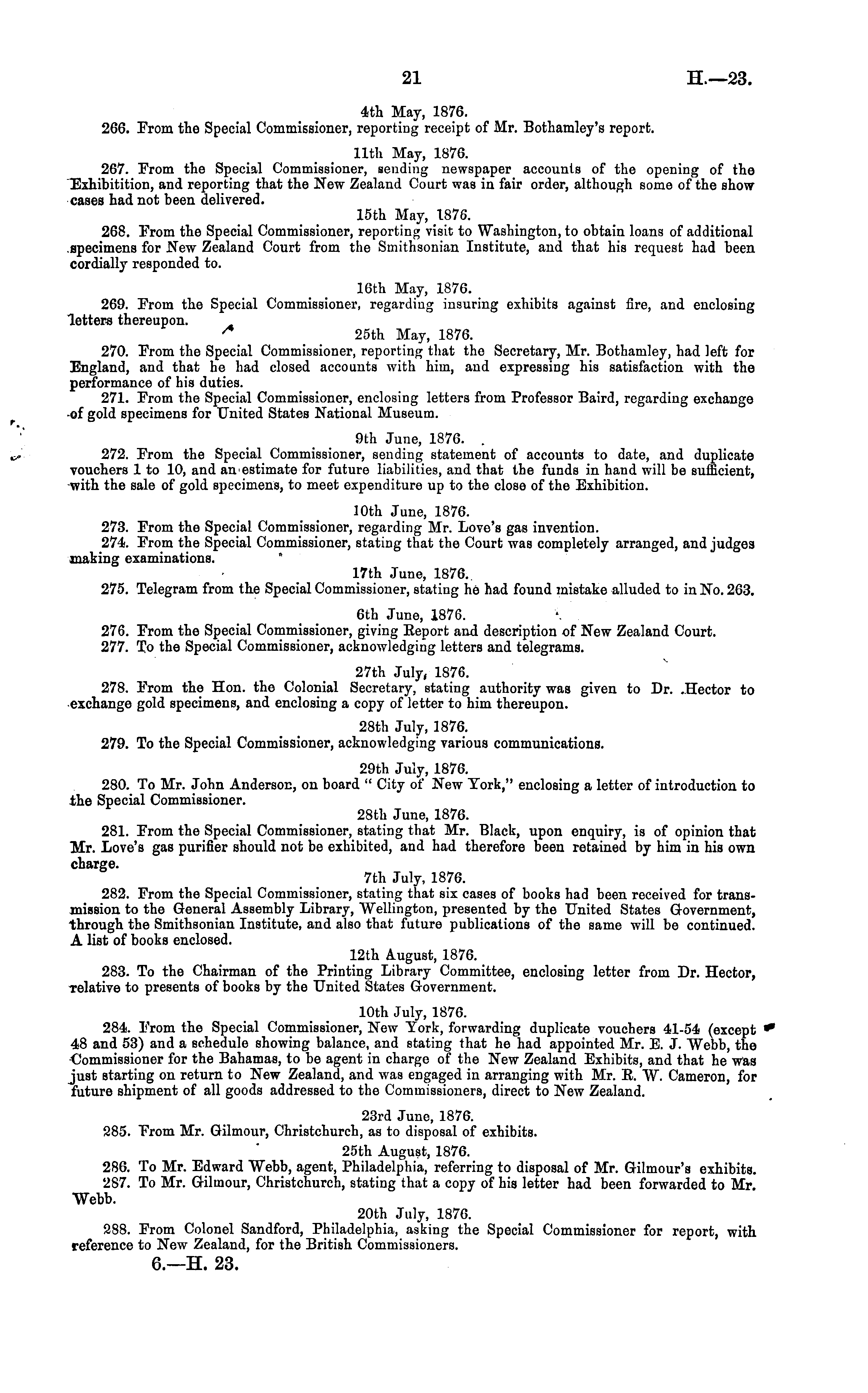 4th May, 1876. 266. From the Special Commissioner, reporting receipt of Mr. Bothamley's report. 11th May, 1876. 267. From the Special Commissioner, sending newspaper accounts of the opening of the and reporting that the New Zealand Court was in fair order, although some of the show cases had not been delivered. 15th May, 1876. 268. From the Special Commissioner, reporting visit to Washington, to obtain loans of additional specimens for New Zealand Court from the Smithsonian Institute, and that his request had been cordially responded to. 16th May, 1876. 269. From the Special Commissioner, regarding insuring exhibits against fire, and enclosing letters thereupon. A 25th May, 1876. 270. From the Special Commissioner, reporting that the Secretary, Mr. Bothamley, had left for England, and that he had closed accounts with him, and expressing his satisfaction with the performance of his duties. 271. From the Special Commissioner, enclosing letters from Professor Baird, regarding exchange of gold specimens for United States National Museum. , 9th June, 1876. . 272. From the Special Commissioner, sending statement of accounts to date, and duplicate vouchers 1 to 10, and an estimate for future liabilities, and that the funds in hand will be sufficient, with the sale of gold specimens, to meet expenditure up to the close of the Exhibition. 10th June, 1876. 273. From the Special Commissioner, regarding Mr. Love's gas invention. 274. From the Special Commissioner, stating that the Court was completely arranged, and judges making examinations. 17th June, 1876. 275. Telegram from the Special Commissioner, stating he had found mistake alluded to in No. 263. 6th June, 1876. 276. From the Special Commissioner, giving Eeport and description of New Zealand Court. 277. To the Special Commissioner, acknowledging letters and telegrams. 27th July, 1876. 278. From the Hon. the Colonial Secretary, stating authority was given to Dr. ..Hector to exchange gold specimens, and enclosing a copy of letter to him thereupon. 28th July, 1876. 279. To the Special Commissioner, acknowledging various communications. 29th July, 1876. 280. To Mr. John Anderson, on board " City of New York," enclosing a letter of introduction to the Special Commissioner. 28th June, 1876. 281. From the Special Commissioner, stating that Mr. Black, upon enquiry, is of opinion that Mr. Love's gas purifier should not be exhibited, and had therefore been retained by him in his own charge. 7th July, 1876. 282. From the Special Commissioner, stating that six cases of books had been received for transmission to the General Assembly Library, Wellington, presented by the United States Government, through the Smithsonian Institute, and also that future publications of the same will be continued. A list of books enclosed. 12th August, 1876. 283. To the Chairman of the Printing Library Committee, enclosing letter from Dr. Hector, Telative to presents of books by the United States Government. 10th July, 1876. 284. From the Special Commissioner, New York, forwarding duplicate vouchers 41-54 (except 48 and 53) and a schedule showing balance, and stating that he had appointed Mr. E. J. Webb, the Commissioner for the Bahamas, to be agent in charge of the New Zealand Exhibits, and that he was just starting on return to New Zealand, and was engaged in arranging with Mr. R. W. Cameron, for future shipment of all goods addressed to the Commissioners, direct to New Zealand. 23rd June, 1876. 285. From Mr. Gilmour, Christchurch, as to disposal of exhibits. 25th August, 1876. 286. To Mr. Edward Webb, agent, Philadelphia, referring to disposal of Mr. Gilmour's exhibits. 257. To Mr. Gilmour, Christchurch, stating that a copy of his letter had been forwarded to Mr. Webb. 20th July, 1876. 288. From Colonel Sandford, Philadelphia, asking the Special Commissioner for report, with reference to New Zealand, for the British Commissioners. 6.—H. 23.