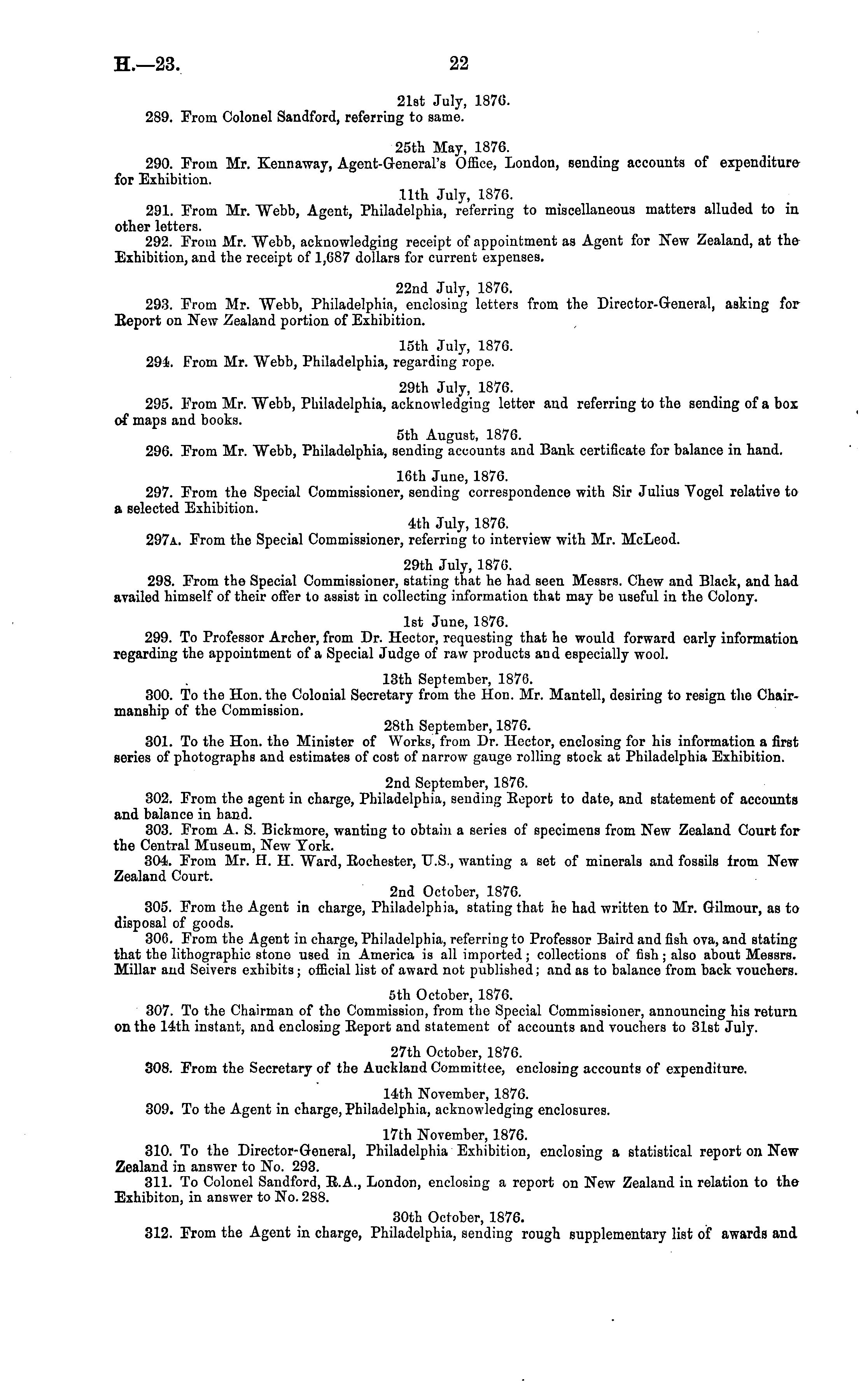 21st July, 187G. 289. From Colonel Sandford, referring to same. 25th May, 1876. 290. From Mr. Kennaway, Agent-General's Office, London, sending accounts of expenditure for Exhibition. 11th July, 1876. 291. From Mr. "Webb, Agent, Philadelphia, referring to miscellaneous matters alluded to in other letters. 292. From Mr. Webb, acknowledging receipt of appointment as Agent for New Zealand, at the Exhibition, and the receipt of 1,(387 dollars for current expenses. 22nd July, 1876. 293. From Mr. Webb, Philadelphia, enclosing letters from the Director-General, asking for Eeport on New Zealand portion of Exhibition. 15th July, 1876. 294. From Mr. Webb, Philadelphia, regarding rope. 29th July, 1876. 295. From Mr. Webb, Philadelphia, acknowledging letter and referring to the sending of a bos of maps and books. sth August, 1876. 296. From Mr. Webb, Philadelphia, sending accounts and Bank certificate for balance in hand. 16th June, 1876. 297. From the Special Commissioner, sending correspondence with Sir Julius Vogel relative to a selected Exhibition. 4th July, 1876. 297a. From the Special Commissioner, referring to interview with Mr. McLeod. 29th July, 1876. 298. From the Special Commissioner, stating that he had seen Messrs. Chew and Black, and had availed himself of their offer to assist in collecting information that may be useful in the Colony. Ist June, 1876. 299. To Professor Archer, from Dr. Hector, requesting that he would forward early information regarding the appointment of a Special Judge of raw products and especially wool. 13th September, 1870. 300. To the Hon. the Colonial Secretary from the Hon. Mr. Mantell, desiring to resign the Chairmanship of the Commission. 28th September, 187G. 301. To the Hon. the Minister of Works, from Dr. Hector, enclosing for his information a first series of photographs and estimates of cost of narrow gauge rolling stock at Philadelphia Exhibition. 2nd September, 1876. 302. From the agent in charge, Philadelphia, sending Eeport to date, and statement of accounts and balance in hand. 303. From A. S. Bickmore, wanting to obtain a series of specimens from New Zealand Court for the Central Museum, New York. 304. From Mr. H. H. Ward, Eochester, U.S., wanting a set of minerals and fossils from New Zealand Court. 2nd October, 1876. 305. From the Agent in charge, Philadelphia, stating that he had written to Mr. Gilmour, as to disposal of goods. 300. From the Agent in charge, Philadelphia, referring to Professor Baird and fish ova, and stating that the lithographic stone used in America is all imported; collections of fish ; also about Messrs. Millar and Seivers exhibits ; official list of award not published; and as to balance from back vouchers. sth October, 1876. 307. To the Chairman of the Commission, from the Special Commissioner, announcing his return on the 14th instant, and enclosing Eeport and statement of accounts and vouchers to 31st July. 27th October, 1876. 308. From the Secretary of the Auckland Committee, enclosing accounts of expenditure. 14th November, 1876. 309. To the Agent in charge, Philadelphia, acknowledging enclosures. 17th November, 1876. 310. To the Director-General, Philadelphia Exhibition, enclosing a statistical report on New Zealand in answer to No. 293. 311. To Colonel Sandford, E.A., London, enclosing a report on New Zealand in relation to the Exhibiton, in answer to No. 288. 30th October, 1576. 312. From the Agent in charge, Philadelphia, sending rough supplementary list of awards and