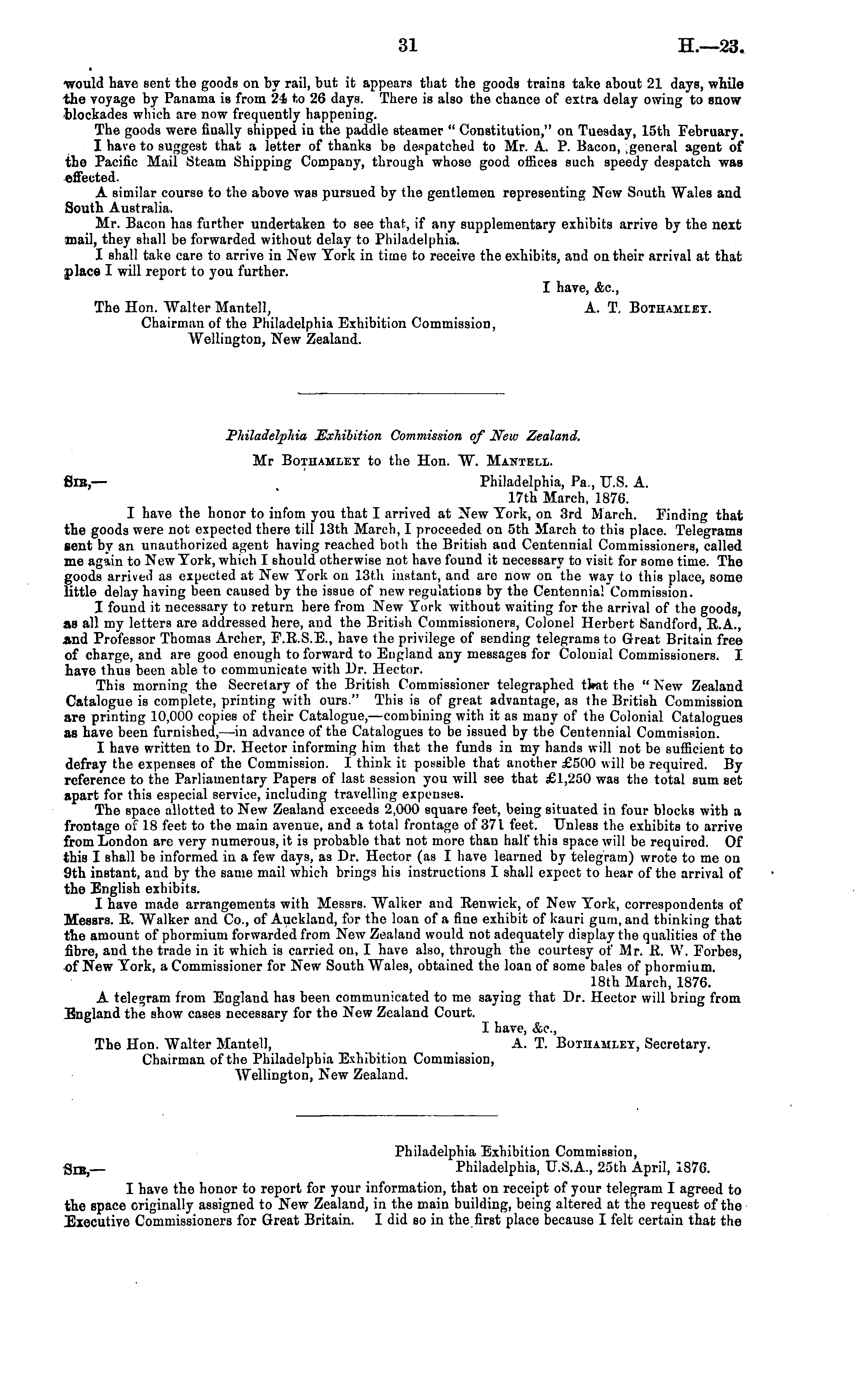 Philadelphia Exhibition Commission of New Zealand. Mr Botuamley to the Hon. "W". Mantell. Sib,— Philadelphia, Pa., U.S. A. 17th March, 1876. I have the honor to infom you that I arrived at New York, on 3rd March. Finding that the goods were not expected there till 13th March, I proceeded on sth March to this place. Telegrams sent by an unauthorized agent having reached botli the British and Centennial Commissioners, called me again to New York, which I should otherwise not have found it necessary to visit for some time. The goods arrived as expected at New York on 13t.h instant, and are now on the way to this place, some little delay having been caused by the issue of new regulations by the Centennial Commission. I found it necessary to return here from New York without waiting for the arrival of the goods, as all my letters are addressed here, and the British Commissioners, Colonel Herbert Sandford, R.A., and Professor Thomas Archer, F.E.S.E., have the privilege of sending telegrams to Great Britain free of charge, and are good enough to forward to England any messages for Colonial Commissioners. I have thus been able to communicate with Dr. Hector. This morning the Secretary of the British Commissioner telegraphed tfeit the " New Zealand Catalogue is complete, printing with ours." This is of great advantage, as the British Commission are printing 10,000 copies of their Catalogue, —combining with it as many of the Colonial Catalogues as have been furnished, —in advance of the Catalogues to be issued by the Centennial Commission. I have written to Dr. Hector informing him that the funds in my hands will not be sufficient to defray the expenses of the Commission. I think it possible that another £500 will be required. By reference to the Parliamentary Papers of last session you will see that £1,250 was the total sum set apart for this especial service, including travelling expenses. The space allotted to New Zealand exceeds 2,000 square feet, being situated in four blocks with a frontage of 18 feet to the main avenue, and a total frontage of 371 feet. Unless the exhibits to arrive from London are very numerous, it is probable that not more than half this space will be required. Of this I shall be informed in a few days, as Dr. Hector (as I have learned by telegram) wrote to me on 9th instant, and by the same mail which brings his instructions I shall expect to hear of the arrival of the English exhibits. I have made arrangements with Messrs. Walker and Jtenwick, of New York, correspondents of Messrs. E. Walker and Co., of Auckland, for the loan of a fine exhibit of kauri gum, and thinking that the amount of phormium forwarded from New Zealand would not adequately display the qualities of the fibre, and the trade in it which is carried on, I have also, through the courtesy of Mr. K. VV. Forbes, of New York, a Commissioner for New South Wales, obtained the loan of some bales of phormium. 18th March, 1876. A telegram from England has been communicated to me saying that Dr. Hector will bring from England the show cases necessary for the New Zealand Court. I have, &c, The Hon. Walter Mantell, A. T. Bothamlet, Secretary. Chairman of the Philadelphia Exhibition Commission, Wellington, New Zealand.