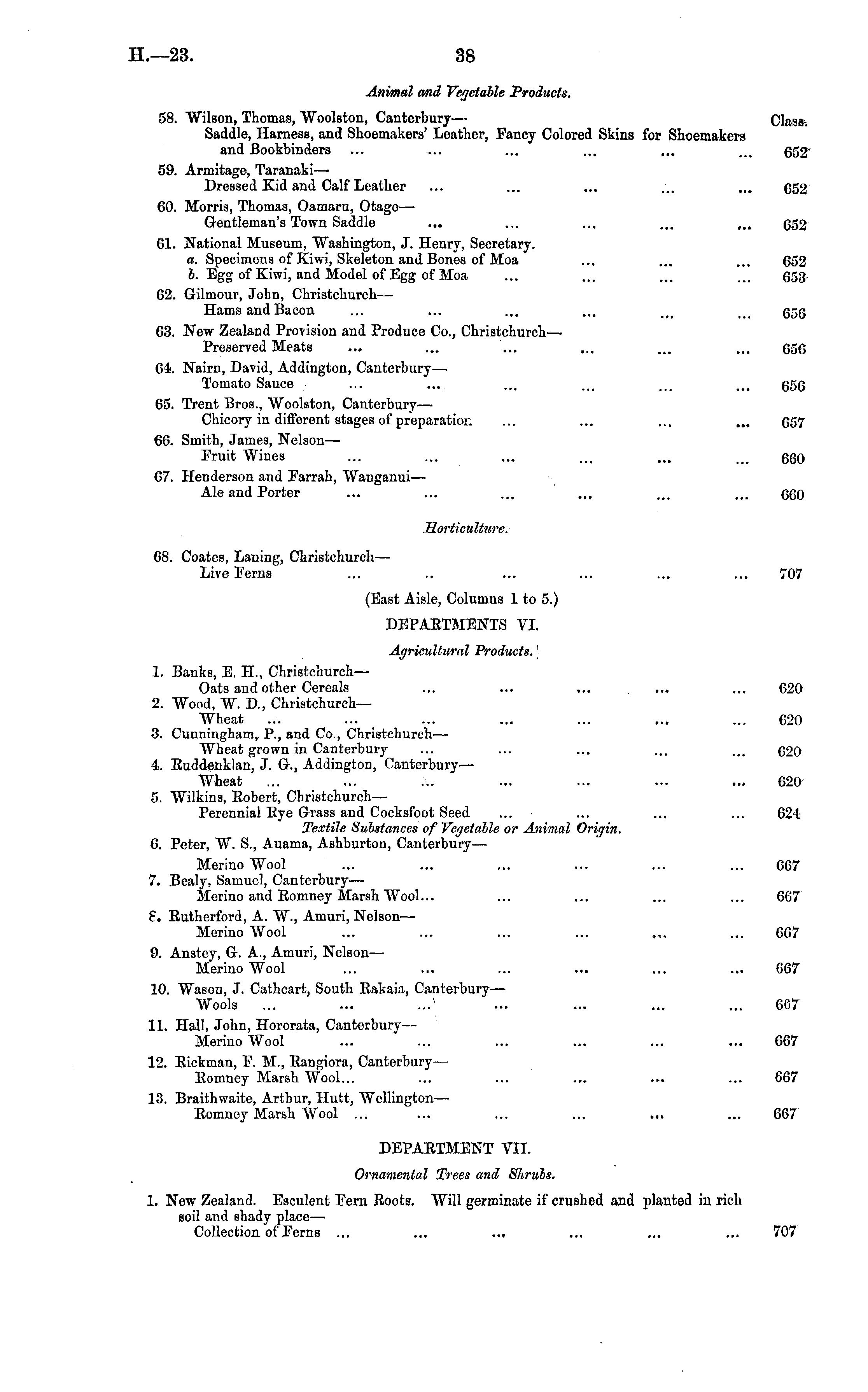 Animal and Vegetable Products. 58. "Wilson, Thomas, Woolston, Canterbury— Class-. Saddle, Harness, and Shoemakers' Leather, Fancy Colored Skins for Shoemakers and Bookbinders ... ... ... ... ... ... (352--59. Armitage, Taranaki—■ Dressed Kid and Calf Leather ... ... ... .'.. ... 652 60. Morris, Thomas, Oamaru, Otago— Gentleman's Town Saddle ... ... ... ... ... (352 61. National Museum, Washington, J. Henry, Secretary. a. Specimens of Kiwi, Skeleton and Bones of Moa ... ... ... 652 b. Egg of Kiwi, and Model of Egg of Moa ... ... ... ... 653 62. Gilmour, John, Christchurch— Hams and Bacon ... ... ... ... ... gsg 63. New Zealand Provision and Produce Co., Christchurch— Preserved Meats ... ... ... ... ... ... 656 04. Nairn, David, Addington, Canterbury— Tomato Sauce ... ... ... ... ... ... (Js(j 65. Trent Bros., Woolston, Canterbury— Chicory in different stages of preparation ... ... ... ... 657 60. Smith, James, Nelson — Fruit Wines ... ... ... ... ■ ... ... 660 67. Henderson and Farrah, Wanganui— Ale and Porter ... ... ... ... ... ... 060 Horticulture. 68. Coates, Laning, Christchurch — Live Ferns ... .. ... ... ... ... 707 (East Aisle, Columns 1 to 5.) DEPAETMENTS VI. Agricultural Products. \ 1. Banks, E. H., Christchurch— Oats and other Cereals ... ... ... . ... ... 620 2. Wood, W. D., Christchurch— Wheat ... ... ... ... ... ... ... 620 3. Cunningham, P., and Co., Christchurch— Wheat grown in Canterbury ... ... ... ... ... 620 4. Euddenklan, J. G\, Addington, Canterbury— Wheat ... ... ... ... ... ... ... 620 5. Wilkins, Eobert, Christchurch— Perennial Eye Grass and Cocksfoot Seed ... ... ... ... 624 Textile Substances of Vegetable or Animal Origin. 6. Peter, W. S., Auama, Ashburton, Canterbury— Merino Wool ... ... ... ... ... ... 667 7. Bealy, Samuel, Canterbury— Merino and Eomney Marsh W001... ... ... ... ... 667 8. Eutherford, A. W., Aniuri, NelsonMerino Wool ... ... ... ... ~. ... 667 9. Anstey, G. A., Amuri, Nelson— Merino Wool ... ... ... ... ... ... G67 10. Wason, J. Cathcart, South Eakaia, Canterbury — Wools ... ... ..: ... ... ... ... 667 11. Hall, John, Hororata, Canterbury — Merino Wool ... ... ... ... ... ... 667 12. Eickman, F. M., Eangiora, Canterbury — Eomney Marsh W001... ... ... ... ... ... 667 13. Braithwaite, Arthur, Hutt, Wellington— Eomney Marsh Wool ... ... ... ... ... ... 667 DEPAETMENT VII. Ornamental Trees and Shrubs. 1. New Zealand. Esculent Fern Eoots. Will germinate if crushed and planted in rich soil and shady place— Collection of Ferns ... ... ... ... ... ... 707
