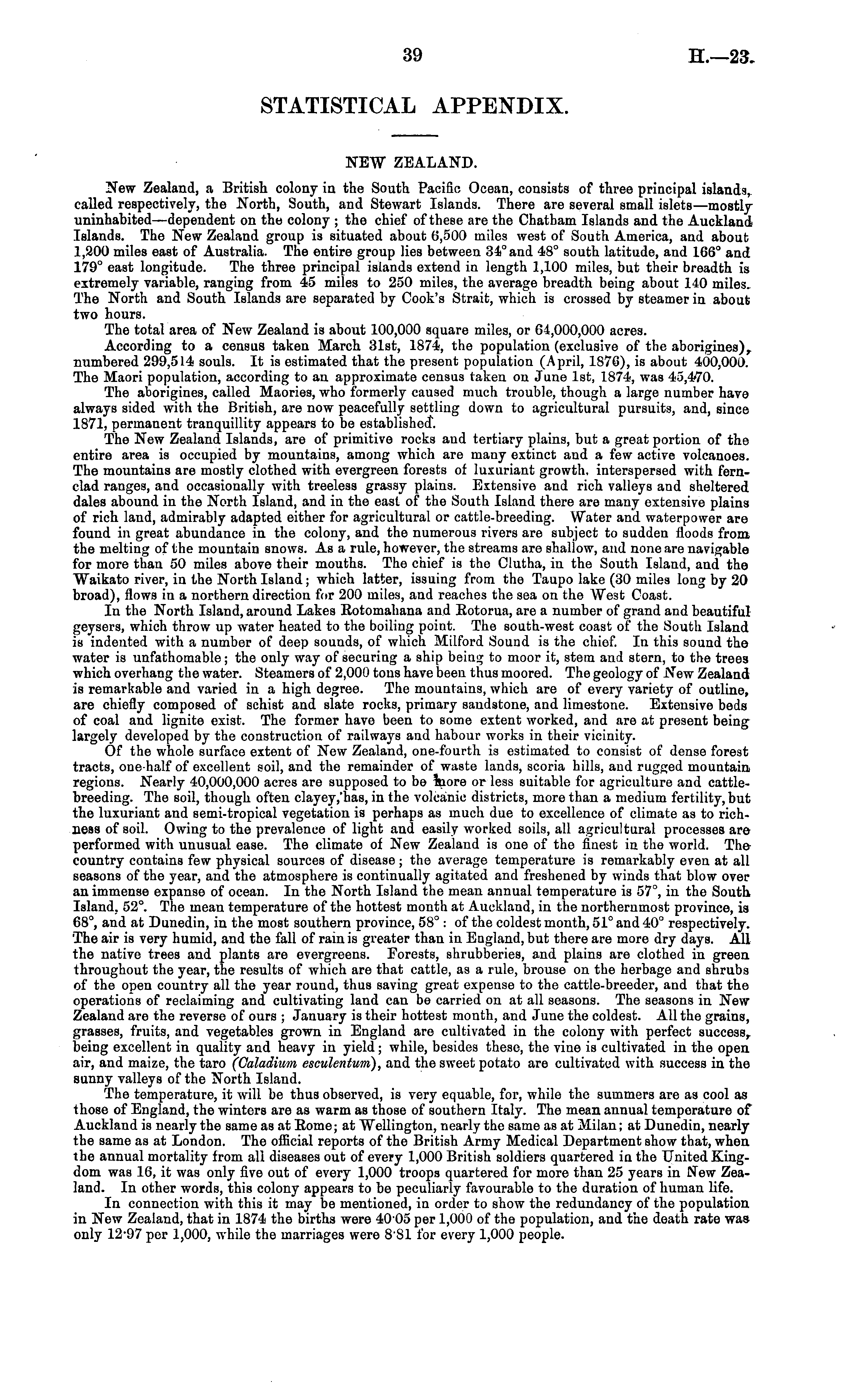 NEW ZEALAND. New Zealand, a British colony in the South Pacific Ocean, consists of three principal islands, called respectively, the North, South, and Stewart Islands. There are several small islets—mostly uninhabited —dependent on the colony ; the chief of these are the Chatham Islands and the Auckland Islands. The New Zealand group is situated about 6,500 miles west of South America, and about 1,200 miles east of Australia. The entire group lies between 34° and 48° south latitude, and 166° and 179° east longitude. The three principal islands extend in length 1,100 miles, but their breadth is extremely variable, ranging from 45 miles to 250 miles, the average breadth being about 140 miles. The Nortli and South Islands are separated by Cook's Strait, which is crossed by steamer in about two hours. The total area of New Zealand is about 100,000 square miles, or 64,000,000 acres. According to a census taken March 31st, 1874, the population (exclusive of the aborigines), numbered 299,514 souls. It is estimated that the present population (April, 1876), is about 400,000. The Maori population, according to an approximate census taken on June Ist, 1874, was 45,4/70. The aborigines, called Maories, who formerly caused much trouble, though a large number have always sided with the British, are now peacefully settling down to agricultural pursuits, and, since 1871, permanent tranquillity appears to be established". The New Zealand Islands, are of primitive rocks and tertiary plains, but a great portion of the entire area is occupied by mountains, among which are many extinct and a few active volcanoes. The mountains are mostly clothed with evergreen forests of luxuriant growth, interspersed with fernclad ranges, and occasionally with treeless grassy plains. Extensive and rich valleys and sheltered dales abound in the North Island, and in the east of the South Island there are many extensive plains of rich laud, admirably adapted either for agricultural or cattle-breeding. Water and waterpovver are found in great abundance in the colony, and the numerous rivers are subject to sudden floods from, the melting of the mountain snows. As a rule, however, the streams are shallow, and none are navigable for more than 50 miles above their mouths. The chief is the Clutha, in the South Island, and the Waikato river, in the North Island; which latter, issuing from the Taupo lake (30 miles long by 20 broad), flows in a northern direction for 200 miles, and reaches the sea on the West Coast. In the North Island, around Lakes Eotomahana and Eotorua, are a number of grand and beautiful geysers, which throw up water heated to the boiling point. The south-west coast of the South Island is indented with a number of deep sounds, of which Milford Sound is the chief. In this sound the water is unfathomable; the only way of securing a ship being to moor it, stem and stern, to the trees which overhang the water. Steamers of 2,000 tons have been thus moored. The geology of New Zealand is remarkable and varied in a high degree. The mountains, which are of every variety of outline, are chiefly composed of schist and slate rocks, primary sandstone, and limestone. Extensive beds of coal and lignite exist. The former have been to some extent worked, and are at present being largely developed by the construction of railways and habour works in their vicinity. Of the whole surface extent of New Zealand, one-fourth is estimated to consist of dense forest tracts, one-half of excellent soil, and the remainder of waste lands, scoria hills, and rugged mountain regions. Nearly 40,000,000 acres are supposed to be hiore or less suitable for agriculture and cattlebreeding. The soil, though often clayey,"has, in the volcanic districts, more than a medium fertility, but the luxuriant and semi-tropical vegetation is perhaps as much due to excellence of climate as to richness of soil. Owing to the prevalence of light and easily worked soils, all agricultural processes are performed with unusual ease. The climate of New Zealand is one of the finest in the world. The country contains few physical sources of disease ; the average temperature is remarkably even at all seasons of the year, and the atmosphere is continually agitated and freshened by winds that blow over an immense expanse of ocean. In the North Island the mean annual temperature is 57°, in the South Island, 52°. The mean temperature of the hottest month at Auckland, in the northernmost province, is 68°, and at Dunedin, in the most southern province, 58° : of the coldest month, 51° and 40° respectively. 'The air is very humid, and the fall of ram is greater than in England, but there are more dry days. All the native trees and plants are evergreens. Forests, shrubberies, and plains are clothed in green throughout the year, the results of which are that cattle, as a rule, brouse on the herbage and shrubs of the open country all the year round, thus saving great expense to the cattle-breeder, and that the operations of reclaiming and cultivating land can be carried on at all seasons. The seasons in New Zealand are the reverse of ours ; January is their hottest month, and June the coldest. All the grains, grasses, fruits, and vegetables grown in England are cultivated in the colony with perfect success, being excellent in quality and heavy in yield; while, besides these, the vine is cultivated in the open air, and maize, the taro (Galadium esculentum), and the sweet potato are cultivated with success in the sunny valleys of the North Island. The temperature, it will be thus observed, is very equable, for, while the summers are as cool as those of England, the winters are as warm as those of southern Italy. The mean annual temperature of Auckland is nearly the same as at Eome; at Wellington, nearly the same as at Milan; at Dunedin, nearly the same as at London. The official reports of the British Army Medical Department show that, when the annual mortality from all disea