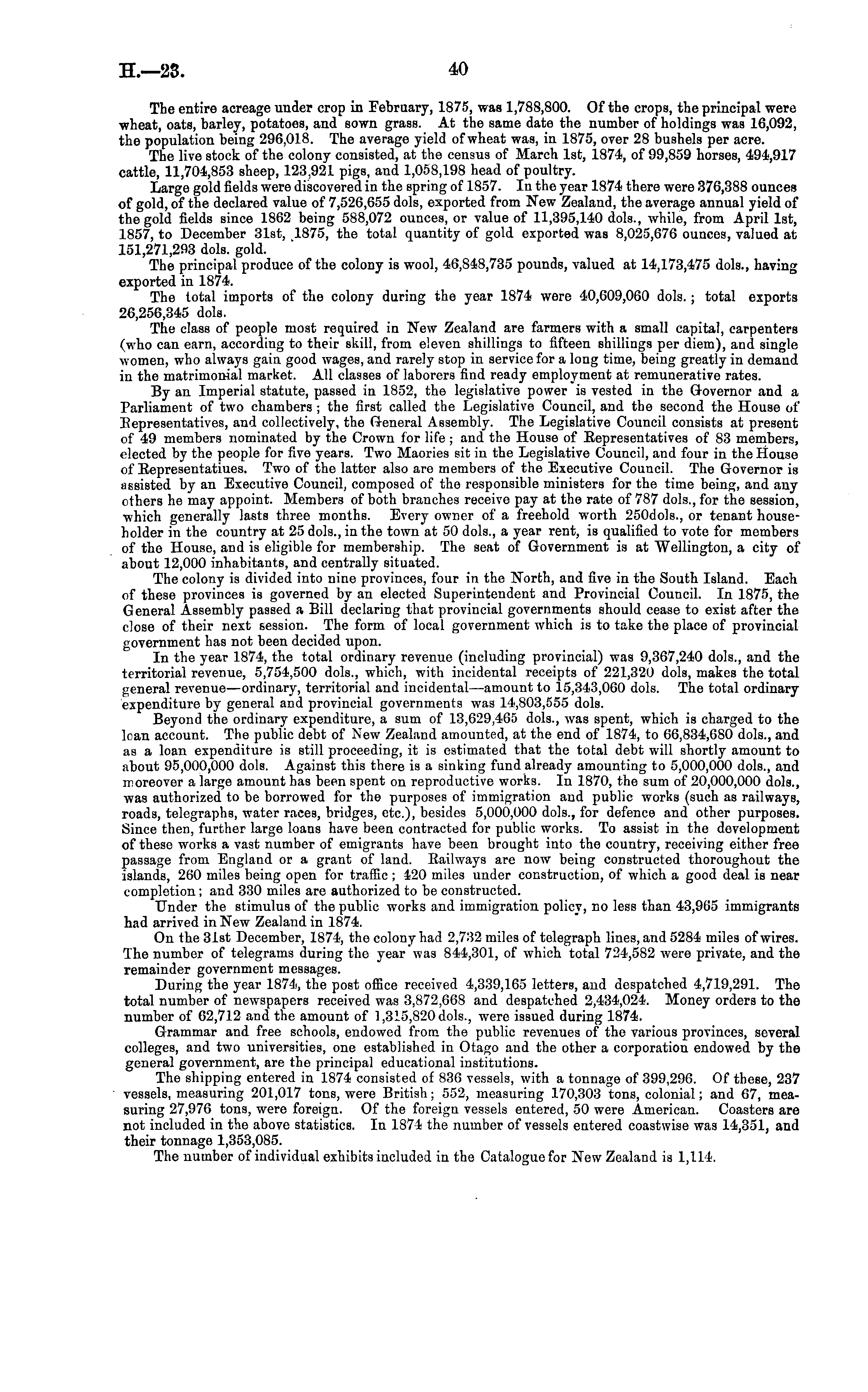 The entire acreage under crop in February, 1875, was 1,788,800. Of the crops, the principal were ■wheat, oats, barley, potatoes, and sown grass. At the same date the number of holdings was 16,092, the population being 296,018. The average yield of wheat was, in 1875, over 28 bushels per acre. The live stock of the colony consisted, at the census of March Ist, 1874, of 99,859 horses, 494,917 cattle, 11,704,853 sheep, 123,921 pigs, and 1,058,198 head of poultry. Large gold fields were discovered in the spring of 1857. In the year 1874 there were 376,388 ounces of gold, of the declared value of 7,526,655 dols, exported from New Zealand, the average annual yield of the gold fields since 1862 being 588,072 ounces, or value of 11,395,140 dols., while, from April Ist, 1857, to December 31st, 1875, the total quantity of gold exported was 8,025,676 ounces, valued at 151,271,293 dols. gold. The principal produce of the colony is wool, 46,848,735 pounds, valued at 14,173,475 dols., having exported in 1874. The total imports of the colony during the year 1874 were 40,609,060 dols.; total exports 26,256,345 dols. The class of people most required in New Zealand are farmers with a small capital, carpenters (who can earn, according to their skill, from eleven shillings to fifteen shillings per diem), and single women, who always gain good wages, and rarely stop in service for a long time, being greatly in demand in the matrimonial market. All classes of laborers find ready employment at remunerative rates. By an Imperial statute, passed in 1852, the legislative power is vested in the Governor and a Parliament of two chambers ; the first called the Legislative Council, and the second the House of Representatives, and collectively, the General Assembly. The Legislative Council consists at present of 49 members nominated by the Crown for life ; and the House of Representatives of 83 members, elected by the people for five years. Two Maories sit in the Legislative Council, and four in the House of Representatiues. Two of the latter also are members of the Executive Council. The Governor is assisted by an Executive Council, composed of the responsible ministers for the time being, and any others he may appoint. Members of both branches receive pay at the rate of 787 dols., for the session, which generally lasts three months. Every owner of a freehold worth 250d015., or tenant householder in the country at 25 dols., in the town at 50 dols., a year rent, is qualified to vote for members of the House, and is eligible for membership. The seat of Government is at Wellington, a city of about 12,000 inhabitants, and centrally situated. The colony is divided into nine provinces, four in the North, and five in the South Island. Each of these provinces is governed by an elected Superintendent and Provincial Council. In 1875, the General Assembly passed a Bill declaring that provincial governments should cease to exist after the close of their next session. The form of local government which is to take the place of provincial government has not been decided upon. In the year 1874, the total ordinary revenue (including provincial) was 9,367,240 dols., and the territorial revenue, 5,754,500 dols., which, with incidental receipts of 221,320 dols, makes the total general revenue —ordinary, territorial and incidental —amount to 15,343,060 dols. The total ordinary expenditure by general and provincial governments was 14,803,555 dols. Beyond the ordinary expenditure, a sum of 13,629,465 dols., was spent, which is charged to the lean account. The public debt of New Zealand amounted, at the end of 1874, to 66,834,680 dols., and as a loan expenditure is still proceeding, it is estimated that the total debt will shortly amount to about 95,000,000 dols. Against this there is a sinking fund already amounting to 5,000,000 dols., and moreover a large amount has been spent on reproductive works. In 1870, the sum of 20,000,000 dols., was authorized to be borrowed for the purposes of immigration and public works (such as railways, roads, telegraphs, water races, bridges, etc.), besides 5,000,000 dols., for defence and other purposes. Since then, further large loans have been contracted for public works. To assist in the development of these works a vast number of emigrants have been brought into the country, receiving either free passage from England or a grant of land. Railways are now being constructed thoroughout the islands, 260 miles being open for traffic ; 420 miles under construction, of which a good deal is near completion; and 330 miles are authorized to be constructed. Under the stimulus of the public works and immigration policy, no less than 43,965 immigrants had arrived in New Zealand in 1874. On the 31st December, 1874, the colony had 2,732 miles of telegraph lines, and 5284 miles of wires. The number of telegrams during the year was 844,301, of which total 724,552 were private, and the remainder government messages. During the year 1874, the post office received 4,339,165 letters, and despatched 4,719,291. The total number of newspapers received was 3,872,668 and despatched 2,434,024. Money orders to the number of 62,712 and the amount of 1,315,820 dols., were issued during 1874. Grammar and free schools, endowed from the public revenues of the various provinces, several colleges, and two universities, one established in Otago and the other a corporation endowed by the general government, are the principal educational institutions. The shipping entered in 1874 consisted of 836 vessels, with a tonnage of 399,296. Of these, 237 vessels, measuring 201,017 tons, were British; 552, measuring 170,303 tons, colonial; and 67, measuring 27,976 tons, were foreign. Of the foreign vessels entered, 50 were American. Coasters are not included in the above statistics. In 1874 the number of vessels entered coastwise was 14,351, and their tonnage 1,353,085. The number of individual exhibits included in the Catalogue for New Zealan
