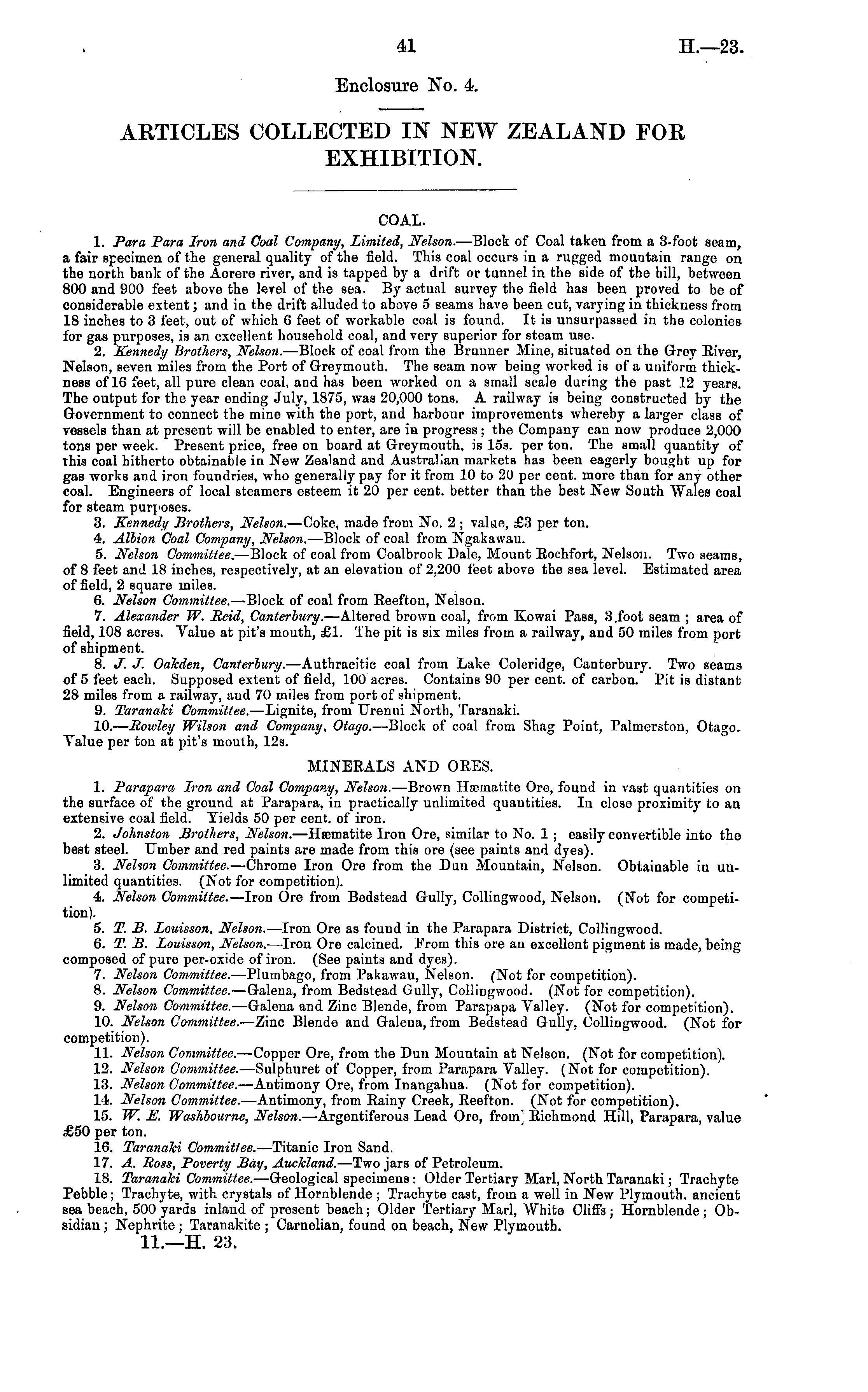COAL. 1. Para Para Iron and Coal Company, Limited, Nelson. —Block of Coal taken from a 3-foot seam, a fair specimen of the general quality of the field. This coal occurs in a rugged mountain range on the north bank of the Aorere river, and is tapped by a drift or tunnel in the side of the hill, between 800 and 900 feet above the level of the sea. By actual survey the field has been proved to be of considerable extent; and ia the drift alluded to above 5 seams have been cut, varying in thickness from 18 inches to 3 feet, out of which 6 feet of workable coal is found. It is unsurpassed in the colonies for gas purposes, is an excellent household coal, and very superior for steam use. 2. Kennedy Brothers, Nelson. —Block of coal from the Brunner Mine, situated on the Grey Eiver, Nelson, seven miles from the Port of Greymouth. The seam now being worked is of a uniform thickness of 16 feet, all pure clean coal, and has been -worked on a small scale during the past 12 years. The output for the year ending July, 1875, was 20,000 tons. A railway is being constructed by the Government to connect the mine with the port, and harbour improvements whereby a larger class of vessels than at present will be enabled to enter, are in progress ; the Company can now produce 2,000 tons per week. Present price, free on board at Greymouth, is 15s. per ton. The small quantity of this coal hitherto obtainable in New Zealand and Australian markets has been eagerly bought up for gas works and iron foundries, who generally pay for it from 10 to 20 per cent, more than for any other coal. Engineers of local steamers esteem it 20 per cent, better than the best New Soath Wales coal for steam purposes. 3. Kennedy Brothers, Nelson. —Coke, made from No. 2 ; value, £3 per ton. 4. Albion Goal Company, Nelson. —'Block of coal from Ngakawau. 5. Nelson Committee. —Block of coal from Coalbrook Dale, Mount Eochfort, Nelson. Two seams, of 8 feet and 18 inches, respectively, at an elevation of 2,200 feet above the sea level. Estimated area of field, 2 square miles. 6. Nelson Committee. —Block of coal from Eeefton, Nelson. 7. Alexander W. Reid, Canterbury. —Altered brown coal, from Kowai Pass, 3.f00t seam ; area of field, 108 acres. Value at pit's mouth, £1. The pit is six miles from a railway, and 50 miles from port of shipment. 8. J. J. OaJcden, Canterbury. —Authracitic coal from Lake Coleridge, Canterbury. Two seams of 5 feet each. Supposed extent of field, 100 acres. Contains 90 per cent, of carbon. Pit is distant 28 miles from a railway, and 70 miles from port of shipment. 9. Taranaki Committee. —Lignite, from Urenui North, Taranaki. 10.— Rowley Wilson and Company, Otago. —Block of coal from Shag Point, Palmerston, Otago. Talue per ton at pit's mouth, 12s. MINEEALS AND OEES. 1. Parapara Iron and Coal Company, Nelson. —Brown Haematite Ore, found in vast quantities on the surface of the ground at Parapara, in practically unlimited quantities. In close proximity to an extensive coal field. Yields 50 per cent, of iron. 2. Johnston Brothers, Nelson. —Haematite Iron Ore, similar to No. 1 ; easily convertible into the best steel. Umber and red paints are made from this ore (see paints and dyes). 3. Nehon Committee. —Chrome Iron Ore from the Dun Mountain, Nelson. Obtainable in unlimited quantities. (Not for competition). 4. Nelson Committee. —Iron Ore from Bedstead Gully, Collingwood, Nelson. (Not for competition). 5. T. B. Louisson, Nelson. —lron Ore as found in the Parapara District, Collingwood. 6. T. B. louisson, Nelson. —Iron Ore calcined. From this ore an excellent pigment is made, being composed of pure per-oxide of iron. (See paints and dyes). 7. Nelson Committee. —Plumbago, from Pakawau, Nelson. (Not for competition). 8. Nelson Committee. —Galena, from Bedstead Gully, Collingwood. (Not for competition). 9. Nelson Committee. —Galena and Zinc Blende, from Parapapa Valley. (Not for competition). 10. Nelson Committee. —Zinc Blende and Galena, from Bedstead Gully, Collingwood. (Not for competition). 11. Nelson Committee. —Copper Ore, from the Dun Mountain at Nelson. (Not for competition). 12. Nelson Committee. —Sulphuret of Copper, from Parapara Valley. (Not for competition). 13. Nelson Committee. —Antimony Ore, from Inangahua. (Not for competition). 14. Nelson Committee. —Antimony, from Eainy Creek, Eeefton. (Not for competition). 15. W. E. Washbourne, Nelson. —Argentiferous Lead Ore, from' Eichmond Hill, Parapara, value £50 per ton. 16. Taranaki Committee. —Titanic Iron Sand. 17. A. Ross, Poverty Bay, Auckland. —Two jars of Petroleum. 18. Taranaki Committee. —Geological specimens: Older Tertiary Marl, North Taranaki; Trachyte Pebble; Trachyte, with crystals of Hornblende ; Trachyte cast, from a well in New Plymouth, ancientsea beach, 500 yards inland of present beach; Older Tertiary Marl, White Cliffs; Hornblende; Obsidian ; Nephrite ; Taranakite ; Carnelian, found on beach, New Plymouth. 11.—H. 23.