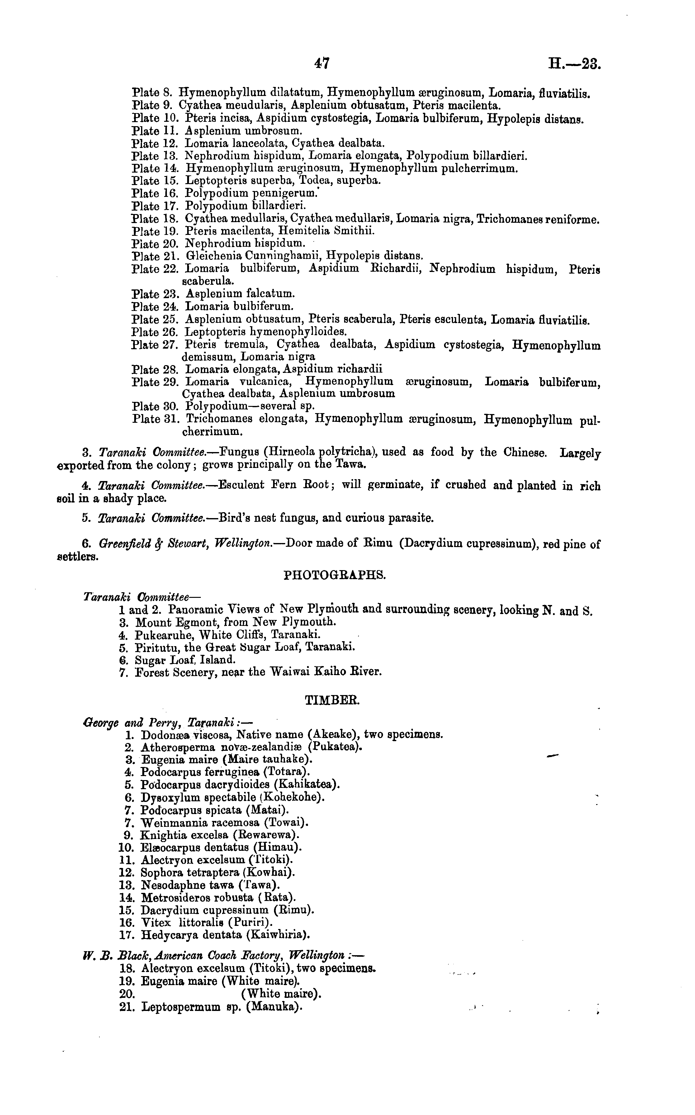Plate 8. Hymenophyllum dilatatum, Hymenophylluni seruginosum, Lomaria, fluviatilis. Plate 9. Cyathea rneudularis, Asplenium obtusatum, Pteris macilenta. Plate 10. Pteris incisa, Aspidium cystostegia, Lomaria bulbiferum, Hypolepis distans. Plate 11. Asplenium umbrosum. Plate 12. Lomaria lanceolata, Cyathea dealbata. Plate 13. Nephrodium hispidum, Lomaria elougata, Polypodiutn billardieri. Plate 14. Hymenophyllum cßruginosum, Hymenophyllum pulcherrimum. Plate 15. Leptopteris superba, Todea, superba. Plate 16. Polypodium pennigerum.' Plate 17. Polypodium billardieri. Plate 18. Cyathea medullaris, Cyathea medullaris, Lomaria nigra, Triehomanes reniforme. Plate 19. Pteris macilenta, Hemitelia Smithii. Plate 20. Nephrodium hispidum. Plate 21. Gleichenia Cunninghamii, Hypolepis distans. Plate 22. Lomaria bulbiferum, Aspidium Kichardii, Nephrodium hispidum, Pteris scaberula. Plate 23. Asplenium falcatum. Plate 24. Lomaria bulbiferum. Plate 25. Asplenium obtusatum, Pteris scaberula, Pteris esculenta, Lomaria fluviatilis. Plate 26. Leptopteris hymenophylloides. Plate 27. Pteris tremula, Cyathea dealbata, Aspidium cystostegia, Hymenophyllum demissum, Lomaria nigra Plate 28. Lomaria elongata, Aspidium richardii Plate 29. Lomaria vulcanica, Hymenophyllum fflruginosum, Lomaria bulbiferum, Cyathea dealbata, Asplenium umbrosum Plate 30. Polypodium —several sp. Plate 31. Trichomanes elongata, Hymenophyllum asruginosum, Hymenophyllum pulcherrimum. 3. Taranaki Committee. —Fungus (Hirneola polytricha), used as food by the Chinese. Largely exported from the colony; grows principally on the Tawa. 4. Taranaki Committee. —Esculent Fern Eoot; will germinate, if crushed and planted in rich soil in a shady place. 5. Taranaki, Committee. —Bird's nest fungus, and curious parasite. 6. Greenfield Stewart, Wellington. —Door made of Eimu (Dacrydium cupressinum), red pine of settlers. PHOTOGRAPHS. Taranaki Committee — 1 and 2. Panoramic Views of New Plymouth aud surrounding scenery, looking N. and 8. 3. Mount Egmont, from New Plymouth. 4. Pukearuhe, White Cliffs, Taranaki. 5. Piritutu, the Great Sugar Loaf, Taranaki. 6. Sugar Loaf, Island. 7. Forest Scenery, near the Waiwai Kaiho Eiver. TIMBER. George and Perry, Taranaki: — 1. Dodonaea viscosa, Native name (Akeake), two specimens. 2. Atherosperma novse-zealandioe (Pukatea). 3. Eugenia maire (Maire tauhake). 4. Podocarpus ferruginea (Totara). 5. Podocarpus dacrydioides (Kahikatea). 6. Dysoxylum spectabile (Kohekohe). 7. Podocarpus spicata (Matai). 7. Weinmannia racemosa (Towai). 9. Knightia excelsa (Rewarewa). 10. Elaeocarpus dentatus (Himau). 11. Alectryon excelsum (Titoki). 12. Sophora tetraptera (Kowhai). 13. Nesodaphne tawa (Tawa). 14. Metrosideros robusta (Rata). 15. Dacrydium cupressinum (Rimu). 16. Vitex littoralis (Puriri). 17. Hedycarya dentata (Kaiwhiria). W. B. Black, American Coach Factory, Wellington : — 18. Alectryon excelsum (Titoki), two specimens. 19. Eugenia maire (White maire). 20. (White maire). 21. Leptospermum ap. (Manuka). ..i • . ;