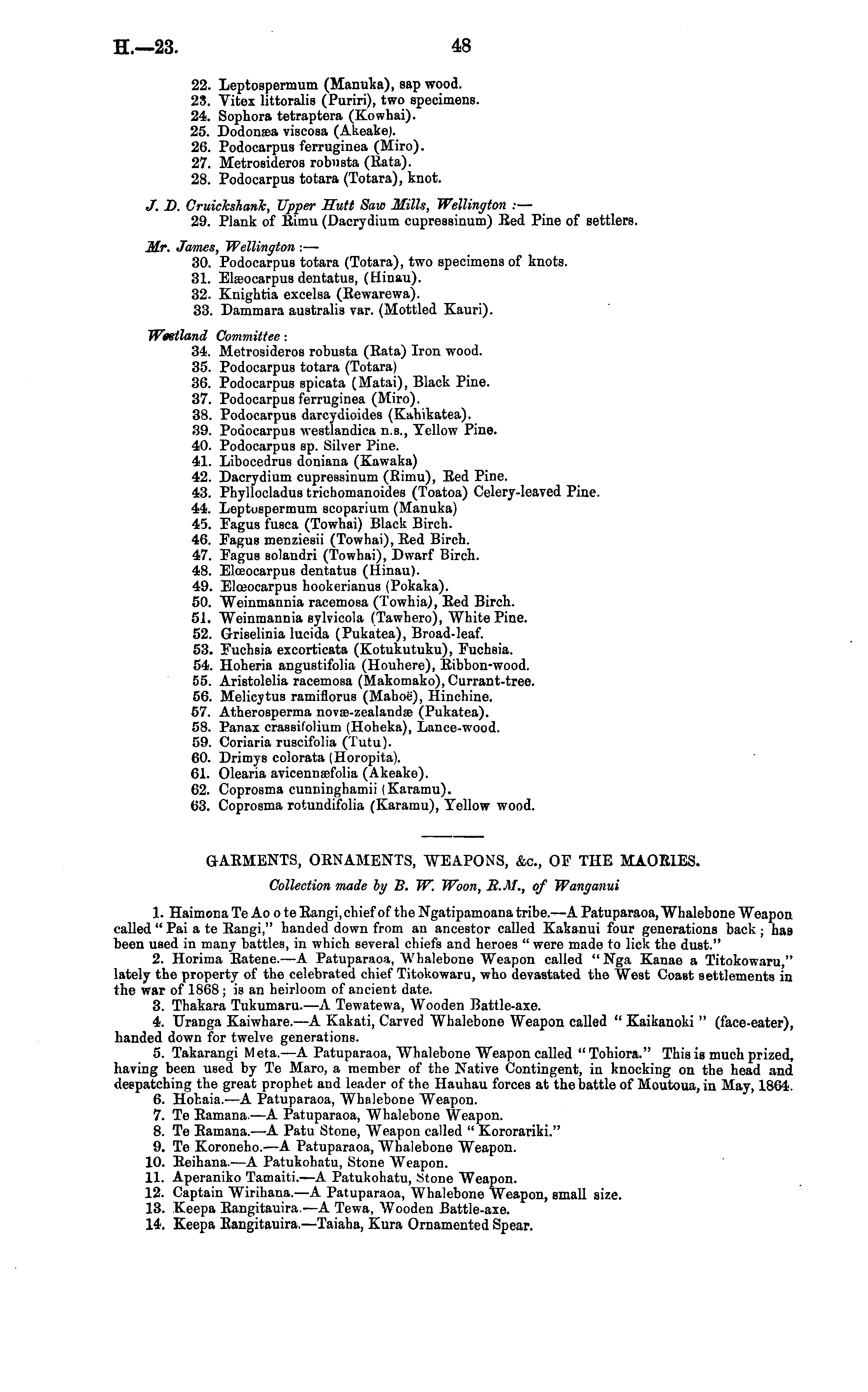 22. Leptospermum (Manuka), sap wood. 23. Vitex littoralis (Puriri), two specimens. 24. Sophora tetraptera (Kowhai). 25. Dodonaea viscosa (Akeake). 26. Podocarpus ferruginea (Miro). 27. Metrosideros robusta (Rata). 28. Podocarpus totara (Totara), knot. J. D. CruichsnanTc, Upper Sutt Saw Mills, Wellington : — 29. Plank of Rimu (Dacrydium cupressinum) Red Pine of settlers. Mr. James, Wellington : — 30. Podocarpus totara (Totara), two specimens of knots. 31. Elseocarpus dentatus, (Hinau). 32. Knightia excelsa (Rewarewa). 33. Dammara australis var. (Mottled Kauri). Weetland Committee: 34. Metrosideros robusta (Rata) Iron wood. 35. Podocarpus totara (Totara) 36. Podocarpus spicata (Matai), Black Pine. 37. Podocarpus ferruginea (Miro). 38. Podocarpus darcydioides (Kahikatea). 39. Podocarpus westlandica n.s., Yellow Pine. 40. Podocarpus sp. Silver Pine. 41. Libocedrus doniana (Kawaka) 42. Dacrydium cupressinum (Rimu), Red Pine. 43. Phyllocladus trichomanoides (Toatoa) Celery-leaved Pine. 44. Leptospermum scoparium (Manuka) 45. Fagus fusca (Towhai) Black Birch. 46. Fagus menziesii (Towhai), Red Birch. 47. Fagus solandri (Towhai), Dwarf Birch. 48. Elcoocarpus dentatus (Hinau). 49. Elceocarpus hookerianus (Pokaka). 50. Weinmannia racemosa (Towhia), Red Birch. 51. Weinmannia sylvicola (Tawhero), White Pine. 52. Griselinia lucida (Pukatea), Broad-leaf. 53. Fuchsia excorticata (Kotukutuku), Fuchsia. 54. Hoheria angustifolia (Houhere), Ribbon-wood. 55. Aristolelia racemosa (Makomako), Currant-tree. 56. Melicytus ramiflorus (Mahoe), Hinchine. 57. Atherosperma novae-zealandse (Pukatea). 58. Panax crassifolium (Hoheka), Lance-wood. 59. Coriaria ruscifolia (Tutu). 60. Drimys colorata (Horopita). 61. Olearia avicennsefolia (Akeake). 62. Coprosma cunninghamii (Karamu). 63. Coprosma rotundifolia (Karamu), Yellow wood.