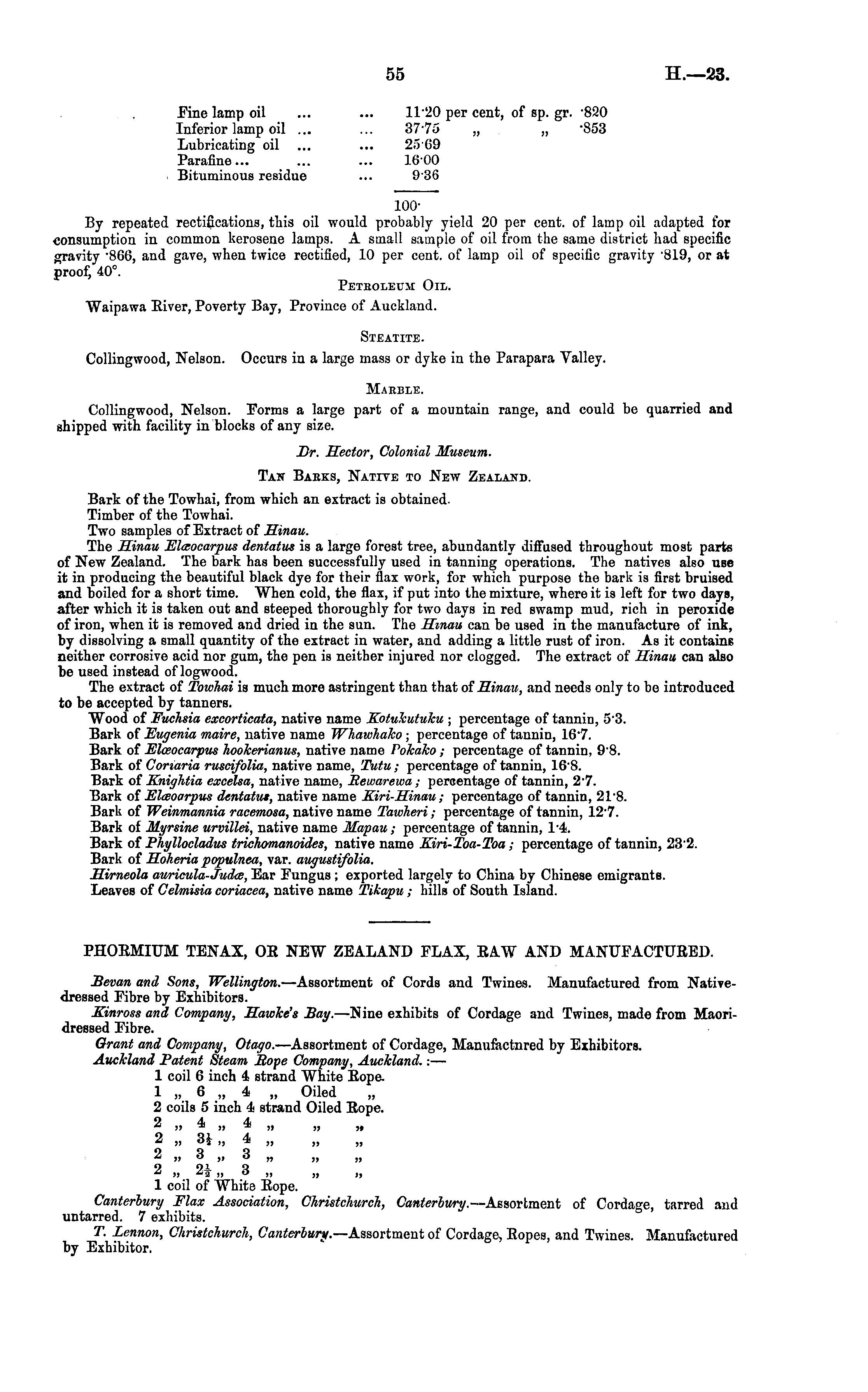 100By repeated rectifications, this oil would probably yield 20 per cent, of lamp oil adapted for consumption in common kerosene lamps. A small sample of oil from the same district had specific gravity '866, and gave, when twice rectified, 10 per cent, of lamp oil of specific gravity 819, or at proof, 40°. Peteolepsi Oil. Waipawa River, Poverty Bay, Province of Auckland. Steatite. Collingwood, Nelson. Occurs in a large mass or dyke in the Parapara Valley. Marble. Collingwood, Nelson. Forms a large part of a mountain range, and could be quarried and shipped with facility in blocks of any size. Dr. Sector, Colonial Museum. Tan Babes, Natite to New Zealand. Bark of the Towhai, from which an extract is obtained. Timber of the Towhai. Two samples of Extract of Hinau. The Hinau Elceocarpus dentatus is a largo forest tree, abundantly diffused throughout most parts of New Zealand. The bark has been successfully used in tanning operations. The natives also use it in producing the beautiful black dye for their flax work, for which purpose the bark is first bruised and boiled for a short time. When cold, the flax, if put into the mixture, where it is left for two days, after which it is taken out and steeped thoroughly for two days in red swamp mud, rich in peroxide of iron, when it is removed and dried in the sun. The Hinau can be used in the manufacture of ink, by dissolving a small quantity of the extract in water, and adding a little rust of iron. As it contains; neither corrosive acid nor gum, the pen is neither injured nor clogged. The extract of Hinau can also be used instead of logwood. The extract of Towhai is much more astringent than that of Hinau, and needs only to be introduced to be accepted by tanners. Wood of Fuchsia excorticata, native name KotuTcutuku ■ percentage of tannin, 5"3. Bark of Eugenia maire, native name Whawhako; percentage of tannin, 16-7. Bark of Elceocarpus hookerianus, native name Pokako ; percentage of tannin, 9'B. Bark of Conaria ruscifolia, native name, Tutu ; percentage of tannin, 16"8. Bark of Knightia excelsa, native name, Mewarewa ; percentage of tannin, 2'7. Bark of Elceoorpus dentatut, native name Kiri-Hinau ; percentage of tannin, 21-8. Bark of Weinmannia racemosa, native name Tawheri ; percentage of tannin, 12*7. Bark of Myrsine wrvillei, native name Mapau; percentage of tannin, T4. Bark of Phyllocladus trichomanoides, native name Kiri-Toa-Toa; percentage of tannin, 23'2. Bark of Hoheria populnea, var. augustifolia. Hirneola auricula- Judm, Ear Fungus ; exported largely to China by Chinese emigrants. Leaves of Celmisia coriacea, native name Tikapu ; hills of South Island.