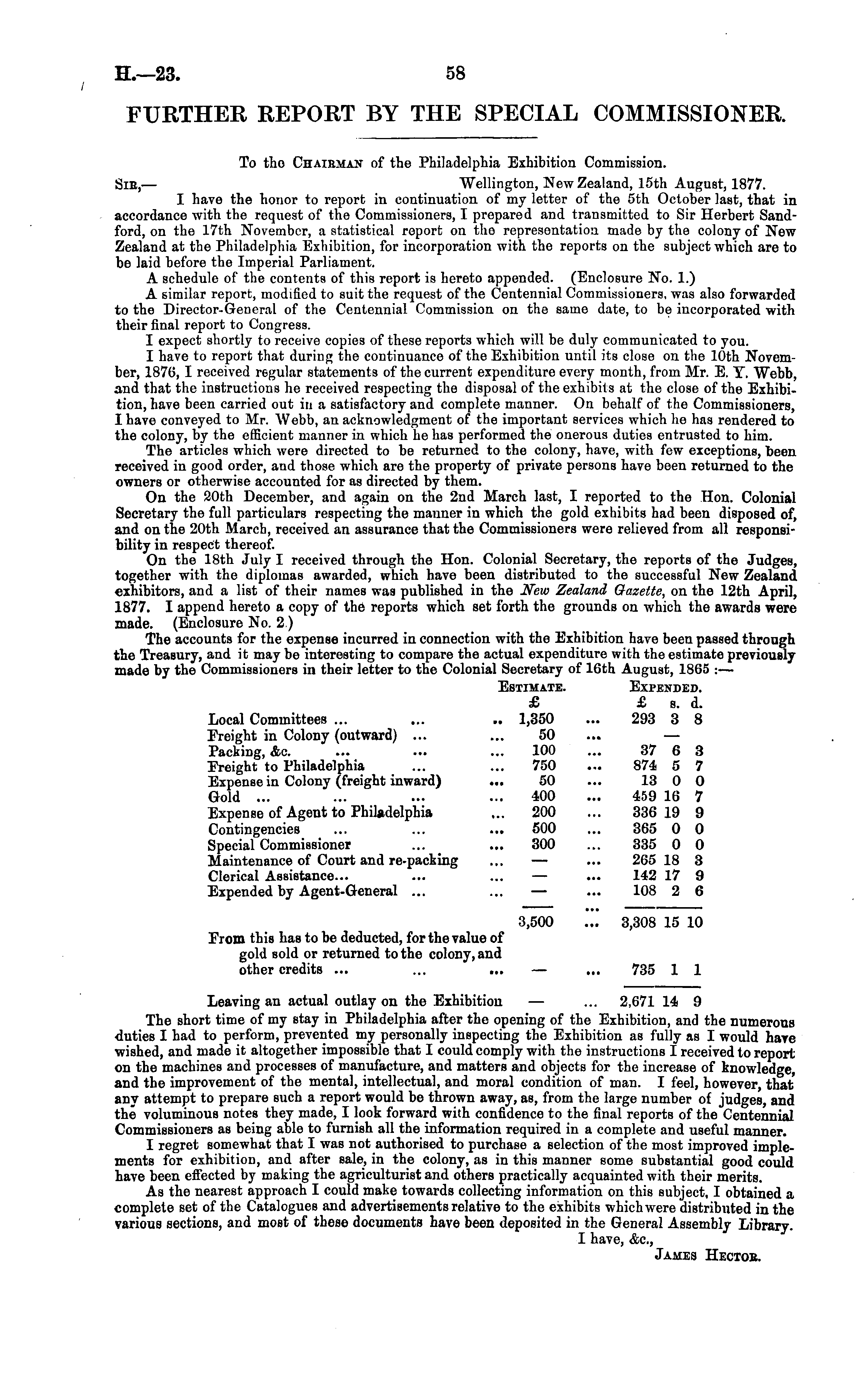 FURTHER REPORT BY THE SPECIAL COMMISSIONER. To the Chairman of the Philadelphia Exhibition Commission. Sib, — Wellington, New Zealand, 15th August, 1877. I have the honor to report in continuation of my letter of the sth October last, that in accordance with the request of the Commissioners, I prepared and transmitted to Sir Herbert Sandford, on the 17th November, a statistical report on tho representation made by the colony of New Zealand at the Philadelphia Exhibition, for incorporation with the reports on the subject which are to be laid before the Imperial Parliament. A schedule of the contents of this report is hereto appended. (Enclosure No. 1.) A similar report, modified to suit the request of the Centennial Commissioners, was also forwarded to tho Director-General of the Centennial Commission on the same date, to be incorporated with their final report to Congress. I expect shortly to receive copies of these reports which will be duly communicated to you. I have to report that during the continuance of the Exhibition until its close on the 10th November, 187(5, I received regular statements of the current expenditure every month, from Mr. E. T. "Webb, and that the instructions he received respecting the disposal of the exhibits at the close of the Exhibition, have been carried out in a satisfactory and complete manner. On behalf of the Commissioners, I have conveyed to Mr. Webb, an acknowledgment of the important services which he has rendered to the colony, by the efficient manner in which he has performed the onerous duties entrusted to him. The articles which were directed to be returned to the colony, have, with few exceptions, been received in good order, and those which are the property of private persons have been returned to the owners or otherwise accounted for as directed by them. On the 20th December, and again on the 2nd March last, I reported to the Hon. Colonial Secretary the full particulars respecting the manner in which the gold exhibits had been disposed of, and on the 20th March, received an assurance that the Commissioners were relieved from all responsibility in respect thereof. On the 18th July I received through the Hon. Colonial Secretary, the reports of the Judges, together with the diplomas awarded, which have been distributed to the successful New Zealand exhibitors, and a list of their names was published in the New Zealand Gazette, on the 12th April, 1877. I append hereto a copy of the reports which set forth the grounds on which the awards were made. (Enclosure No. 2.) The accounts for the expense incurred in connection with the Exhibition have been passed through the Treasury, and it may be interesting to compare the actual expenditure with the estimate previously made by the Commissioners in their letter to the Colonial Secretary of 16th August, 1865 : — Estimate. Expended. £ £ s. d. Local Committees ... ... .. 1,350 ... 293 3 8 Freight in Colony (outward) ... ... 50 ... — Packing, Ac. ... ... ... 100 ... 37 6 3 Freight to Philadelphia ... ... 750 ... 874 5 7 Expense in Colony (freight inward) ... 50 ... 13 0 0 Gold ... ... ... ... 400 ... 459 16 7 Expense of Agent to Philadelphia ... 200 ... 336 19 9 Contingencies ... ... ... 500 ... 365 0 0 Special Commissioner ... ... 300 ... 335 0 0 Maintenance of Court and re-packing ... — ... 265 18 3 Clerical Assistance... ... ... — ... 142 17 9 Expended by Agent-General ... ... — ... 108 2 6 3,500 .'.'.' 3,308 15 10 From this has to be deducted, for the value of gold sold or returned to the colony, and other credits ... ... ... — ... 735 1 1 Leaving an actual outlay on the Exhibition — ... 2,671 14 9 The short time of my stay in Philadelphia after the opening of the Exhibition, and the numerous duties I had to perform, prevented my personally inspecting the Exhibition as fully as I would hare wished, and made it altogether impossible that I could comply with the instructions I received to report on the machines and processes of manufacture, and matters and objects for the increase of knowledge, and the improvement of the mental, intellectual, and moral condition of man. I feel, however, that any attempt to prepare such a report would be thrown away, as, from the large number of judges, and the voluminous notes they made, I look forward with confidence to the final reports of the Centennial Commissioners as being able to furnish all the information required in a complete and useful manner. I regret somewhat that I was not authorised to purchase a selection of the most improved implements for exhibition, and after sale, in the colony, as in this manner some substantial good could have been effected by making the agriculturist and others practically acquainted with their merits. As the nearest approach I could make towards collecting information on this subject, I obtained a complete set of the Catalogues and advertisements relative to the exhibits which were distributed in the various sections, and most of these documents have been deposited in the General Assembly Library. I have, &c, James Hectob.