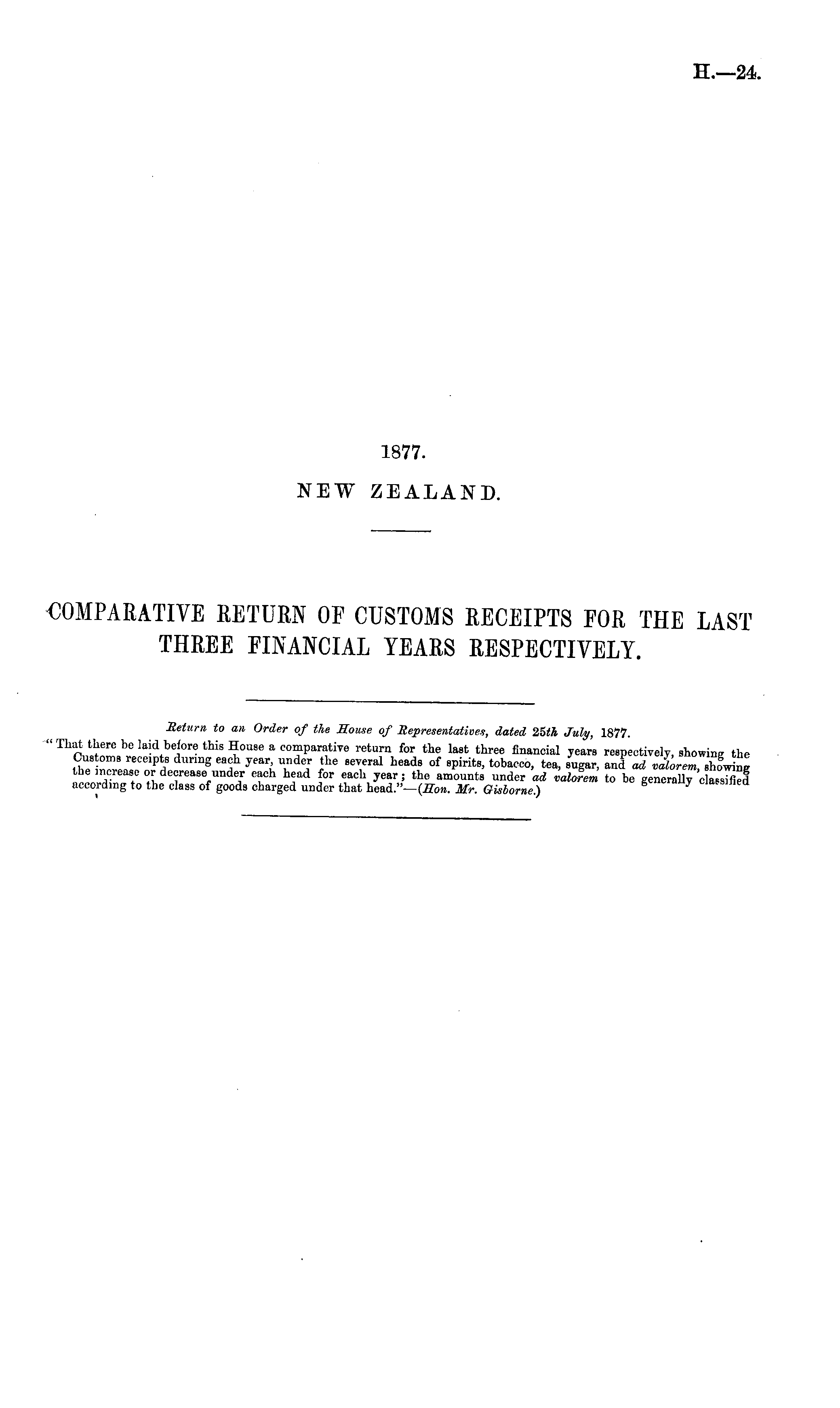 Return to an Order of the House of Representatives, dated 25th July, 1877. " That there be laid before this House a comparative return for the last three financial year's respectively showine the Customs receipt, durmg each year under the several heads of spirits, tobacco, tea, sugar, and advafore^lhL W the increase or decrease.under each head for each year; the amounts under ad valorem to be generally cassTficd according to the class of goods charged under that head."— (Son. Mr. Gislorne.) generally classified