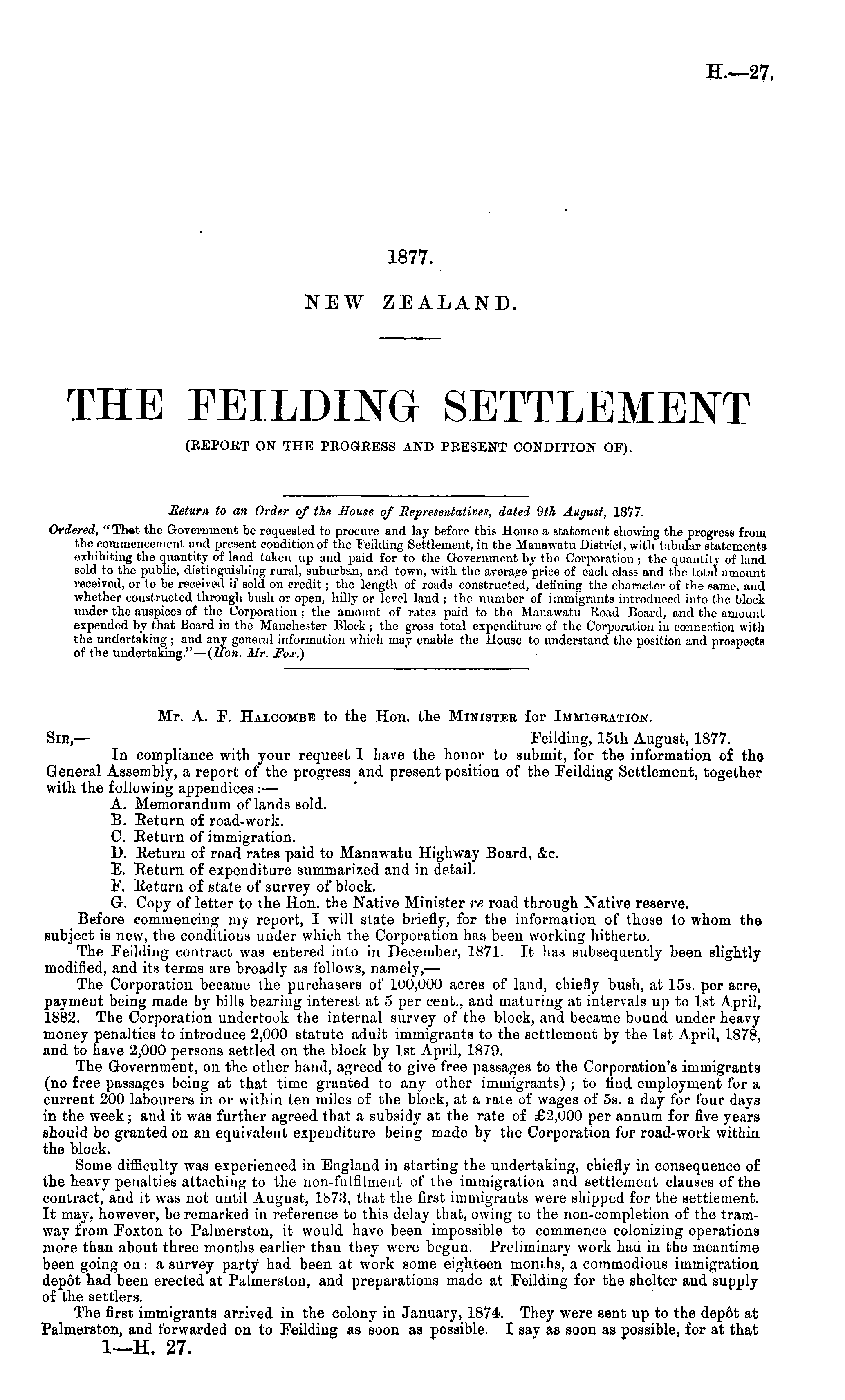 Return to an Order of the Souse of Representatives, dated 9th August, 1877. Ordered, " That the Government be requested to procure and lay before this House a statement showing the progress from the commencement and present condition of the Feilding Settlement, in the Manawatu District, with tabular statements exhibiting the quantity of land taken up and paid for to the Government by the Corporation ; the quantity of land sold to the public, distinguishing rural, suburban, and town, with the average price of each class and the total amount received, or to be received if sold on credit; the length of roads constructed, defining the character of the same, and whether constructed through bush or open, hilly or level land ; the number of immigrants introduced into the block under the auspices of the Corporation ; the amount of rates paid to the Manawatu Road Board, and the amount expended by that Board in the Manchester Block ; the gross total expenditure of the Corporation in connection with the undertaking ; and any general information which may enable the House to understand the position and prospects of the undertaking." — (Hon. Mr. Fo.v.)