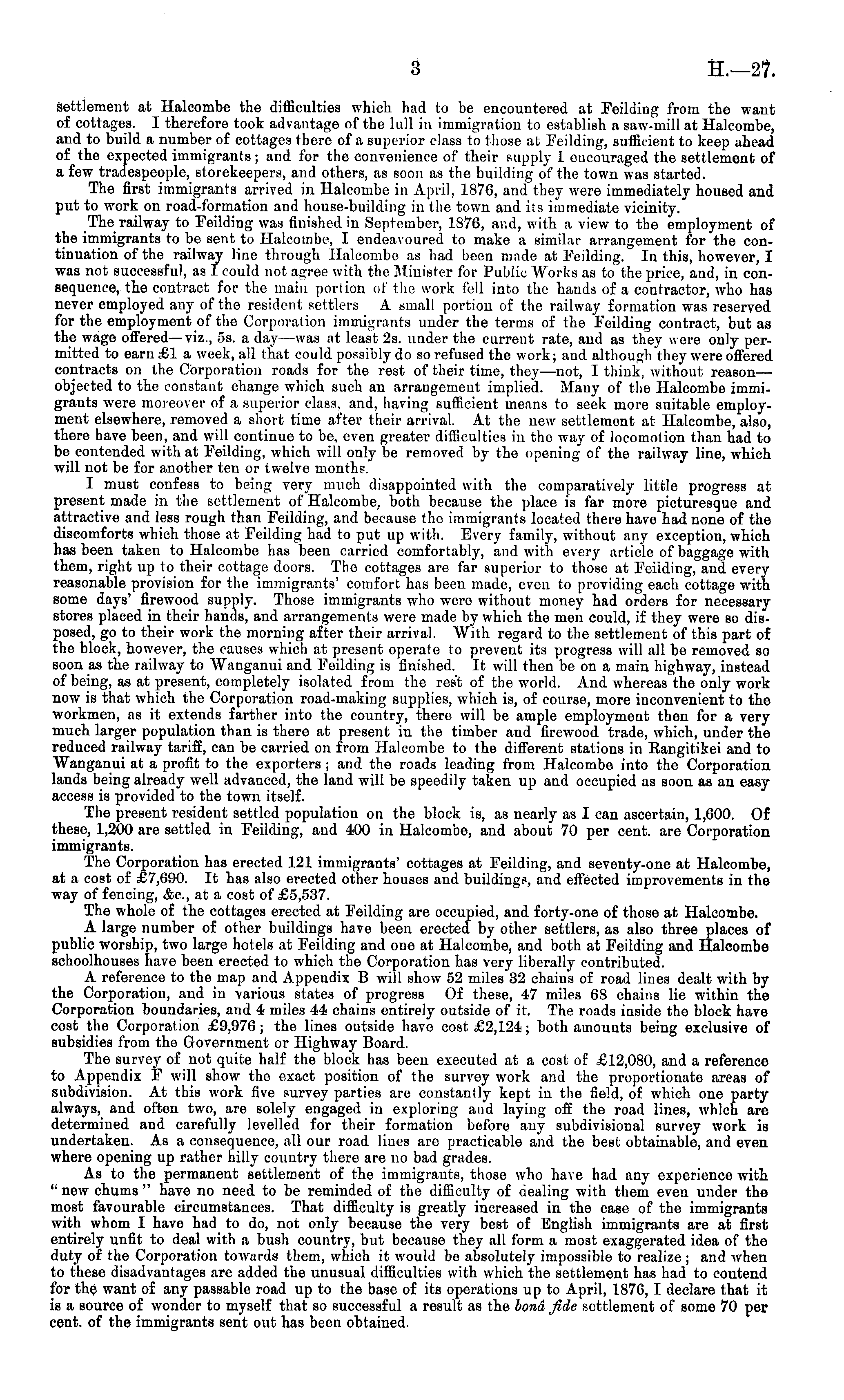 settlement at Halcombe the difficulties which had to be encountered at Feilding from the want of cottages. I therefore took advantage of the lull in immigration to establish a saw-mill at Halcombe, and to build a number of cottages there of a superior class to those at Feilding, sufficient to keep ahead of the expected immigrants; and for the convenience of their supply I encouraged the settlement of a few tradespeople, storekeepers, and others, as soon as the building of the town was started. The first immigrants arrived in Halcombe in April, 1876, and they were immediately housed and put to work on road-formation and house-building in the town and iis immediate vicinity. The railway to Feilding was finished in September, 1876, and, with a view to the employment of the immigrants to be sent to Halcombe, I endeavoured to make a similar arrangement for the continuation of the railway line through Halcombe as bad been made at Feilding. In this, however, I was not successful, as I could not agree with the Minister for Public Works as to the price, and, in consequence, the contract for the main portion of the work fell into the hands of a contractor, who has never employed any of the resident settlers A small portion of the railway formation was reserved for the employment of the Corporation immigrants under the terms of the Feilding contract, but as the wage offered —viz., ss. a day—was at least 2s. under the current rate, and as they were only permitted to earn £1 a week, all that could possibly do so refused the work; and although they were offered contracts on the Corporation roads for the rest of their time, they—not, I think, without reason— objected to the constant change which such an arrangement implied. Many of the Halcombe immigrants were moreover of a superior class, and, having sufficient means to seek more suitable employment elsewhere, removed a short time after their arrival. At the new settlement at Halcombe, also, there have been, and will continue to be, even greater difficulties in the way of locomotion than had to be contended with at Feilding, which will only be removed by the opening of the railway line, which will not be for another ten or twelve month;?. I must confess to being very much disappointed with the comparatively little progress at present made in the settlement of Halcombe, both because the place is far more picturesque and attractive and less rough than Feilding, and because the immigrants located there have had none of the discomforts which those at Feilding had to put up with. Every family, without any exception, which has been taken to Halcombe has been carried comfortably, and with every article of baggage with them, right up to their cottage doors. The cottages are far superior to those at Feilding, and every reasonable provision for the immigrants' comfort has been made, even to providing each cottage with some days' firewood supply. Those immigrants who were without money had orders for necessary stores placed in their hands, and arrangements were made by which the men could, if they were so disposed, go to their work the morning after their arrival. With regard to the settlement of this part of the block, however, the causes which at present operate to prevent its progress will all be removed so soon as the railway to Wanganui and Feilding is finished. It will then be on a main highway, instead of being, as at present, completely isolated from the rest of the world. And whereas the only work now is that which the Corporation road-making supplies, which is, of course, more inconvenient to the workmen, as it extends farther into the country, there will be ample employment then for a very much larger population than is there at present in the timber and firewood trade, which, under the reduced railway tariff, can be carried on from Haleombe to the different stations in Rangitikei and to Wanganui at a profit to the exporters ; and the roads leading from Halcombe into the Corporation lands being already well advanced, the land will be speedily taken up and occupied as soon as an easy access is provided to the town itself. The present resident settled population on the block is, as nearly as I can ascertain, 1,600. Of these, 1,200 are settled in Feilding, and 400 in Halcombe, and about 70 per cent, are Corporation immigrants. The Corporation has erected 121 immigrants' cottages at Feilding, and seventy-one at Halcombe, at a cost of £7,690. It has also erected other houses and buildings, and effected improvements in the way of fencing, &c, at a cost of £5,537. The whole of the cottages erected at Feilding are occupied, and forty-one of those at Halcombe. A large number of other buildings have been erected by other settlers, as also three places of public worship, two large hotels at Feilding and one at Halcombo, and both at Feilding and Halcombe schoolhouses have been erected to which the Corporation has very liberally contributed. A reference to the map and Appendix B will show 52 miles 32 chains of road lines dealt with by the Corporation, and in various states of progress Of these, 47 miles 68 chains lie within the Corporation boundaries, and 4 miles 44 chains entirely outside of it. The roads inside the block have cost the Corporation £9,976; the lines outside have cost £2,124; both amounts being exclusive of subsidies from the Government or Highway Board. The survey of not quite half the block has been executed at a cost of £12,080, and a reference to Appendix F will show the exact position of the survey work and the proportionate areas of subdivision. At this work five survey parties are constantly kept in the field, of which one party always, and often two, are solely engaged in exploring and laying off the road lines, which are determined and carefully levelled for their formation before any subdivisional survey work is undertaken. As a consequence, all our road lines are practicable and the best obtainable, and even where opening u