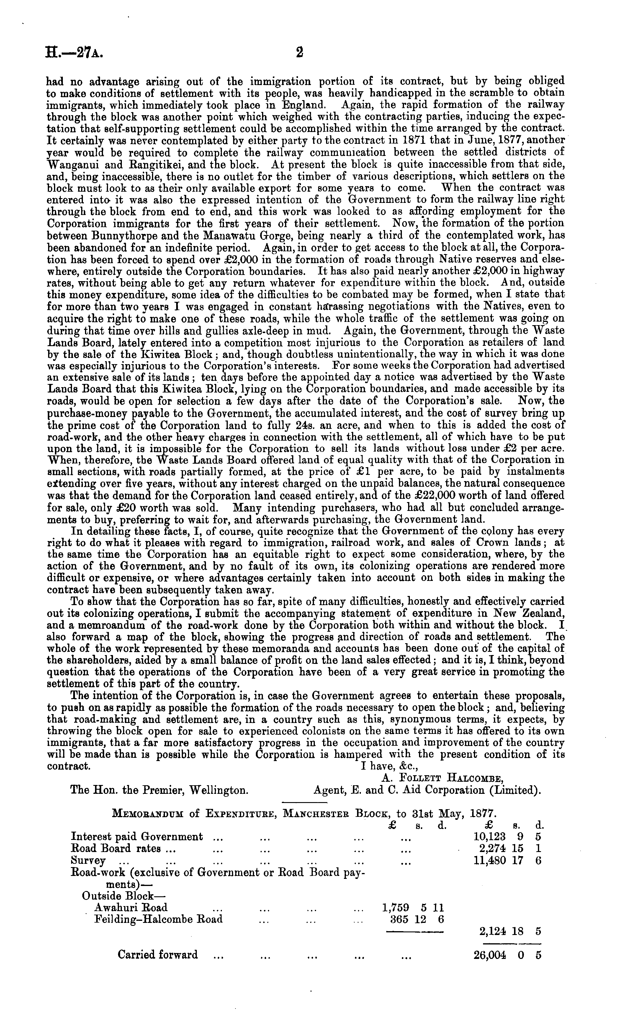 had no advantage arising out of the immigration portion of its contract, but by being obliged to make conditions of settlement with its people, was heavily handicapped in the scramble to obtain immigrants, which immediately took place in England. Again, the rapid formation of the railway through the block was another point which weighed with the contracting parties, inducing the expectation that self-supporting settlement could be accomplished within the time arranged by the contract. It certainly was never contemplated by either party to the contract in 1871 that in June, 1877, another year would be required to complete the railway communication between the settled districts of Wanganui and Rangitikei, and the block. At present the block is quite inaccessible from that side, and, being inaccessible, there is no outlet for the timber of various descriptions, which settlers on the block must look to as their only available export for some years to come. When the contract was entered into it was also the expressed intention of the Government to form the railway line right through the block from end to end, and this work was looked to as affording employment for the Corporation immigrants for the first years of their settlement. Now, the formation of the portion between Bunnythorpe and the Manawatu Gorge, being nearly a third of the contemplated work, has been abandoned for an indefinite period. Again, in order to get access to the block at all, the Corporation has been forced to spend over £2,000 in the formation of roads through Native reserves and elsewhere, entirely outside the Corporation boundaries. It has also paid nearly another £2,000 in highway rates, without being able to get any return whatever for expenditure within the block. And, outside this money expenditure, some idea of the difficulties to be combated may be formed, when I state that for more than two years I was engaged in constant harassing negotiations with the Natives, even to acquire the right to make one of these roads, while the whole traffic of the settlement was going on during that time over hills and gullies axle-deep in mud. Again, the Government, through the Waste Lands Board, lately entered into a competition most injurious to the Corporation as retailers of land by the sale of the Kiwitea Block ; and, though doubtless unintentionally, the way in which it was done was especially injurious to the Corporation's interests. For some weeks the Corporation had advertised an extensive sale of its lands ; ten days before the appointed day a notice was advertised by the Waste Lands Board that this Kiwitea Block, lying on the Corporation boundaries, and made accessible by its roads, would be open for selection a few days after the date of the Corporation's sale. Now, the purchase-money payable to the Government, the accumulated interest, and the cost of survey bring up the prime cost of the Corporation land to fully 245. an acre, and when to this is added the cost of road-work, and the other heavy charges in connection with the settlement, all of which have to be put upon the land, it is impossible for the Corporation to sell its lands without loss under £2 per acre. When, therefore, the Waste Lands Board offered land of equal quality with that of the Corporation in small sections, with roads partially formed, at the price of £1 per acre, to be paid by instalments extending over five years, without any interest charged on the unpaid balances, the natural consequence was that the demand for the Corporation land ceased entirely, and of the £22,000 worth of land offered for sale, only £20 worth was sold. Many intending purchasers, who had all but concluded arrangements to buy, preferring to wait for, and afterwards purchasing, the Government land. In detailing these facts, I, of course, quite recognize that the Government of the colony has every right to do what it pleases with regard to immigration, railroad work, and sales of Crown lands; at the same time the Corporation has an equitable right to expect some consideration, where, by the action of the Government, and by no fault of its own, its colonizing operations are rendered more difficult or expensive, or where advantages certainly taken into account on both sides in making the contract have been subsequently taken away. To show that the Corporation has so far, spite of many difficulties, honestly and effectively carried out its colonizing operations, I submit the accompanying statement of expenditure in New Zealand, and a memroandum of the road-work done by the Corporation both within and without the block. I also forward a map of the block, showing the progress and direction of roads and settlement. The whole of the work represented by these memoranda and accounts has been done out of the capital of the shareholders, aided by a small balance of profit on the land sales effected ; and it is, I think, beyond question that the operations of the Corporation have been of a very great service in promoting the settlement of this part of the country. The intention of the Corporation is, in case the Government agrees to entertain these proposals, to push on as rapidly as possible the formation of the roads necessary to open the block ; and, believing that road-making and settlement are, in a country such as this, synonymous terms, it expects, by throwing the block open for sale to experienced colonists on the same terms it has offered to its own immigrants, that a far more satisfactory progress in the occupation and improvement of the country will be made than is possible while the Corporation is hampered with the present condition of its contract. I have, &c, A. Follett Halcombe, The Hon. the Premier, Wellington. Agent, E. and C. Aid Corporation (Limited). Memoeandum of Expendituee, Manciiestee Block, to 31st May, 1877. £ s. d. £ s. d. Interest paid Government ... ... ... ... ... 10,123 9 5 Road Board rates ... ... ... ... ... ... 2,274 15 1 Survey ... ... ... ..